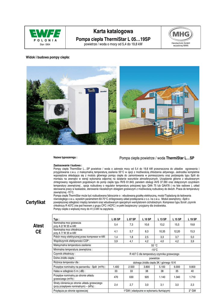 Karta katalogowa Pompa ciepła ThermiStar L 05…19SP Heiztechnik GmbH wcześniej MAN powietrze / woda o mocy od 5,4 do 19,8 kW Stan 0904 Widok i budowa pompy ciepła: Nazwa typoszeregu : Certyfikat Atest CE Pompa ciepła powietrze / woda ThermiStar L…SP Zastosowanie i budowa : Pompy ciepła ThermiStar L…SP powietrze / woda o zakresie mocy od 5,4 do 19,8 kW przeznaczona do układów ogrzewania i przygotowania c.w.u. z maksymalną temperaturą zasilania 55°C w opcji z możliwością chłodzenia aktywnego. Jednostka kompletnie wyposażona składająca się z modułu głównego pompy ciepła do zamontowania w pomieszczeniu oraz podzespołu typu Split do montażu na zewnątrz w wersji wykonania odpornej na działanie warunków atmosferycznych. Urządzenie główne z wbudowanym zintegrowany regulatorem pogodowym do pomp ciepła typu RVS 61.843, panelem obsługi AVS 37.390 oraz dołączonym czujnikiem temperatury zewnętrznej , opcja rozbudowy o regulator temperatury pokojowej typu QAA 75 lub QAA78 ( na fale radiowe ), układ sterowania pracy w kaskadzie, sterowanie niezależnym obiegiem grzewczym z możliwością rozbudowy do dwóch. Praca do temperatury zewnętrznej -15°C. Pompa ciepła ThermiStar może być rozbudowana fabrycznie o : wbudowaną grzałkę elektryczną, moduł Topladung do ładowania równoległego c.w.u. wysokim parametrem 60-70°C zintegrowany układ przełączania z c.o. na c.w.u. Moduł zewnętrzny –Split o powiększonej odległości między lamelami oraz wbudowanym specjalnym wentylatorem cichobieżnym. Kompresor typu Scroll ,czynnik chłodniczy R 407C (nie jest freonem z grupy CFC i HCFC ) w pełni bezpieczny i przyjazny dla środowiska. Pompy ciepła o większej mocy do 41,5 kW na zapytanie. Typ : Nominalna moc grzewcza przy A 2/ W 35 w kW: Nominalna moc chłodnicza przy A 7/ W 35 w kW: Pobór mocy elektrycznej przez kompresor w kW: Współczynnik efektywności COP : Maksymalna temperatura zasilania: Minimalna temperatura zewnętrzna : Czynnik chłodniczy : Dolne źródło ciepła : Różnica temperatur dla : L 05 SP L 07 SP L 10 SP L 13 SP L 15 SP L 19 SP 5,4 7,3 10,6 13,2 15,5 19,8 4,1 5,7 8,3 10,35 12,20 15,3 1,4 3,9 1,8 4,1 2,5 4,2 3,3 4,0 3,7 4,2 5,0 3,9 Przepływ nominalny na parowniku - Split (m³/h) : Hałas w odległości 5 m ( dB) : Przepływ nominalny po stronie układu grzewczego (m³/h) : Straty ciśnienia po stronie układu grzewczego (przy przepływie nominalnym) – (kPa) : Przyłącza po stronie ogrzewczej 1.400 33 55 °C -15°C R 407 C dla temperatury czynnika grzewczego powietrze dolnego źródła ciepła 3K / górnego 10 K 2.500 3.800 5.100 6.000 33 38 38 35 9.800 40 470 630 920 1.140 1.340 1.710 2,4 2,7 3,0 3,1 3,0 2,3 1“GW ( elastyczne w wykonaniu tłumiącym) 2” GW Typ : Pobór mocy nominalny ( A): L 05 SP 3,0 L 07 SP 4,0 L 10 SP 5,4 L 13 SP 6,5 L 15 SP 7,4 L 19 SP 12,6 Wartość prądu przy pracy max (A): 5,3 7,3 11,7 12,3 14,2 17,4 Wartość prądu rozruchowego (A): 13,0 20,0 25,8 32,0 37,0 49,5 Wartość prądu przy blokadzie (A): 26,0 40,0 51,5 64,0 74,0 99,0 3 x 10A 3 x 16A 3 x 25A 3 x 32 Zabezpieczenie prądowe/ charakterystyka typu C Wymagany przekrój przyłącza głównego Zasilanie elektryczne 1,5 mm2 IP 40 IP 54 500 mm < 15m < 1,5 m do ∅22mm ±100g/mb / ∅28mm ±150g/mb / ∅35mm ±200g/mb Osprzęt do pompy ciepła ThermiStar L ( opcja) : Widok - moduł wewnętrzny : 1540 x 840 x 920 1140 x 840 x 920 107 Ciężar modułu zewnętrznego ( Split) Stan dostawy : 700 x 850 x 900 2260 x 840 x 920 700 x 600 x 900 Wymiary szer. x gł. x wys. modułu zewnętrznego ( Split) Ciężar pompy ciepła ( wewnętrznej) 2,5 mm2 3NPE, 400 V 1NPE, 230 V kompresor sterowanie Rodzaj ochrony pompy ciepła wg. EN 60529 Rodzaj ochrony parownika Split wg. EN 60529 Minimalny odstęp parownika od budynku Max długość przewodów chłodniczych między pompą ciepła a parownikiem (Split) : Maksymalna różnica poziomów pomiędzy pompą ciepła a parownikiem ( Split) : Orientacyjna pojemność czynnika chłodniczego w układzie orurowania : Wymiary szer. x gł. x wys. pompy ciepła ( wewnętrznej) Montaż : 3 x 20A 120 76 140 160 95 175 200 140 pompa ciepła (moduł wewnętrzny) - do montażu w budynku moduł zewnętrzny (Split) - na zewnątrz budynku - pompa ciepła część wewnętrzna i zewnętrzna ( Split) z wbudowanym regulatorem komfortu (automatyka pogodowa, panel obsługi, funkcja samodzielnej kontroli i diagnostyki z modułem pamięci błędów) z czujnikiem zewnętrznym - od typu ThermiStar L 10 SP z funkcją łagodnego startu -przyłącza hydrauliczne w wykonaniu seryjnym elastyczne, zabezpieczające przed przenoszeniem drgań -w opcji moduł odwracalny do odmrażania parownika w okresie zimowym i aktywnego chłodzenia latem – wymagany czujnik temperatury pomieszczenia -moduł zewnętrzny w wykonaniu z daszkiem śniegowym, malowany proszkowo na kolor jasnoszary ( RAL 7035). - grzałka elektryczna 6 kW - moduł ładowania równoległego c.w.u. Topladung ( wysokim parametrem) - wysokoefektywne podgrzewacze c.w.u. typu Theramat EMH 150-500 1-F oraz warstwowe zasobniki ciepła typu Theramt SZ 500-2000 0-F w wykonaniu specjalnym do współpracy z pompami ciepła - pakiet hydrauliczny strony odbioru ciepła ( pompa obiegowa + zintegrowana grupa bezpieczeństwa oraz moduł przełączający c.o. na c.w.u.) - regulator pokojowy QAA 75 - regulator pokojowy QAA 78 ( na fale radiowe), moduł AVS 13.99 nadajnik i odbiornik, wzmacniacz AVS 14.390 - czujnik przylgowy QAD 36.101 - czujnik c.w.u. QAZ 36 ( długość 2 lub 6 m) Panel sterowniczy : Regulator pokojowy QAA 78 : Widok - moduł zewnętrzny : Wymiary i usytuowanie pompy ciepła moduł zewnętrzny ( Split): D D EAL C C STR SGL FKL B FA ZAF 400 KB A Ø10 258 mm KRS STR Oznaczenie Opis L 05 SP / L 07SP / L 10SP L13 SP L 15 SP / L 19 SP A Wymiar zadaszenia w mm 1090 1490 2215 B Minimalny rozstaw nóg 955 1355 2080 C Minimalny odstęp od ściany i roślin > 200 mm D Minimalny odstęp od ściany i 