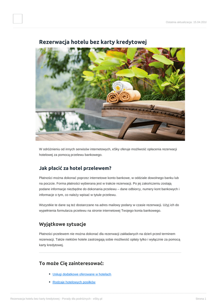 Ostatnia aktualizacja: 15.04.2016 Rezerwacja hotelu bez karty kredytowej W odróżnieniu od innych serwisów internetowych, eSky oferuje możliwość opłacenia rezerwacji hotelowej za pomocą przelewu bankowego. Jak płacić za hotel przelewem? Płatności można dokonać poprzez internetowe konto bankowe, w oddziale dowolnego banku lub na poczcie. Forma płatności wybierana jest w trakcie rezerwacji. Po jej zakończeniu zostają podane informacje niezbędne do dokonania przelewu – dane odbiorcy, numery kont bankowych i informacje o tym, co należy wpisać w tytule przelewu. Wszystkie te dane są też dostarczane na adres mailowy podany w czasie rezerwacji. Użyj ich do wypełnienia formularza przelewu na stronie internetowej Twojego konta bankowego. Wyjątkowe sytuacje Płatności przelewem nie można dokonać dla rezerwacji zakładanych na dzień przed terminem rezerwacji. Także niektóre hotele zastrzegają sobie możliwość opłaty tylko i wyłącznie za pomocą karty kredytowej. To może Cię zainteresować: Usługi dodatkowe oferowane w hotelach Rodzaje hotelowych posiłków Rezerwacja hotelu bez karty kredytowej - Porady dla podróżnych - eSky.pl Strona 1 No-show fee. Co to jest? Zobacz również: Rezerwacja hotelu bez karty kredytowej - Porady dla podróżnych - eSky.pl Strona 2