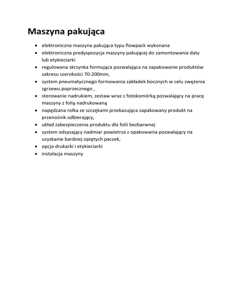 Maszyna pakująca elektroniczna maszyna pakująca typu flowpack wykonana elektroniczna predyspozycja maszyny pakującej do zamontowania daty lub etykieciarki regulowana skrzynka formująca pozwalająca na zapakowanie produktów zakresu szerokości 70-200mm, system pneumatycznego formowania zakładek bocznych w celu zwężenia zgrzewu poprzecznego , sterowanie nadrukiem, zestaw wraz z fotokomórką pozwalający na pracę maszyny z folią nadrukowaną napędzana rolka ze szczękami przekazująca zapakowany produkt na przenośnik odbierający, układ zabezpieczenia produktu dla folii bezbarwnej system odsysający nadmiar powietrza z opakowania pozwalający na uzyskanie bardziej opiętych paczek, opcja drukarki i etykieciarki instalacja maszyny