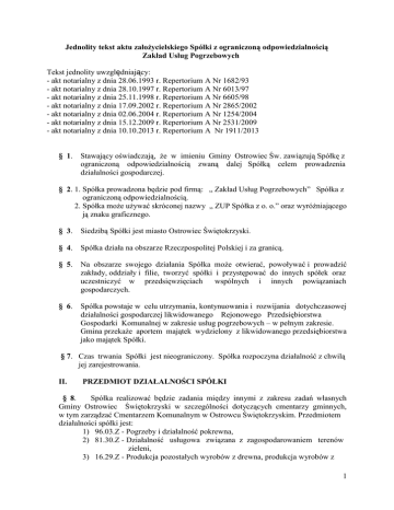 Jednolity tekst aktu założycielskiego Spółki z ograniczoną odpowiedzialnością Zakład Usług Pogrzebowych Tekst jednolity uwzględniający: - akt notarialny z dnia 28.06.1993 r. Repertorium A Nr 1682/93 - akt notarialny z dnia 28.10.1997 r. Repertorium A Nr 6013/97 - akt notarialny z dnia 25.11.1998 r. Repertorium A Nr 6605/98 - akt notarialny z dnia 17.09.2002 r. Repertorium A Nr 2865/2002 - akt notarialny z dnia 02.06.2004 r. Repertorium A Nr 1254/2004 - akt notarialny z dnia 15.12.2009 r. Repertorium A Nr 2531/2009 - akt notarialny z dnia 10.10.2013 r. Repertorium A Nr 1911/2013 § 1. Stawający oświadczają, że w imieniu Gminy Ostrowiec Św. zawiązują Spółkę z ograniczoną odpowiedzialnością zwaną dalej Spółką celem prowadzenia działalności gospodarczej. § 2. 1. Spółka prowadzona będzie pod firmą: „ Zakład Usług Pogrzebowych” Spółka z ograniczoną odpowiedzialnością. 2. Spółka może używać skróconej nazwy „ ZUP Spółka z o. o.” oraz wyróżniającego ją znaku graficznego. § 3. Siedzibą Spółki jest miasto Ostrowiec Świętokrzyski. § 4. Spółka działa na obszarze Rzeczpospolitej Polskiej i za granicą. § 5. Na obszarze swojego działania Spółka może otwierać, powoływać i prowadzić zakłady, oddziały i filie, tworzyć spółki i przystępować do innych spółek oraz uczestniczyć w przedsięwzięciach wspólnych i innych powiązaniach gospodarczych. § 6. Spółka powstaje w celu utrzymania, kontynuowania i rozwijania dotychczasowej działalności gospodarczej likwidowanego Rejonowego Przedsiębiorstwa Gospodarki Komunalnej w zakresie usług pogrzebowych – w pełnym zakresie. Gmina przekaże aportem majątek wydzielony z likwidowanego przedsiębiorstwa jako majątek Spółki. § 7. Czas trwania Spółki jest nieograniczony. Spółka rozpoczyna działalność z chwilą jej zarejestrowania. II. PRZEDMIOT DZIAŁALNOŚCI SPÓŁKI § 8. Spółka realizować będzie zadania między innymi z zakresu zadań własnych Gminy Ostrowiec Świętokrzyski w szczególności dotyczących cmentarzy gminnych, w tym zarządzać Cmentarzem Komunalnym w Ostrowcu Świętokrzyskim. Przedmiotem działalności spółki jest: 1) 96.03.Z - Pogrzeby i działalność pokrewna, 2) 81.30.Z - Działalność usługowa związana z zagospodarowaniem terenów zieleni, 3) 16.29.Z - Produkcja pozostałych wyrobów z drewna, produkcja wyrobów z 1 korka, słomy i materiałów używanych do wyplatania, 4) 25.99.Z– Produkcja pozostałych gotowych wyrobów metalowych, gdzie indziej niesklasyfikowana, 5) 43.99.Z– Pozostałe specjalistyczne roboty budowlane, gdzie indziej niesklasyfikowane, 6) 47.19.Z - Pozostała sprzedaż detaliczna w niewyspecjalizowanych sklepach, 7) 47.99.Z- Pozostała sprzedaż detaliczna prowadzona poza siecią sklepowa, straganami i targowiskami, 8) 52.21.Z - Działalność usługowa wspomagająca transport lądowy, 9) 68.32.Z - Zarządzanie nieruchomościami wykonywane na zlecenie, 10) 73.1 - Reklama, 11) 82.9 - Działalność komercyjna, gdzie indziej niesklasyfikowana. III. KAPITAŁ ZAKŁADOWY SPÓŁKI § 9. 1. Kapitał zakładowy Spółki wynosi sto tysięcy złotych (100.000 zł.) i dzieli się na dwieście ( 200 ) udziałów po pięćset złotych (500 zł.) każdy. Udziały w Spółce są równe i niepodzielne . Wszystkie udziały zostały objęte przez Gminę Ostrowiec Świętokrzyski i pokryte w następujący sposób: 1) wkładem pieniężnym w wysokości 4.000 zł.(cztery tysiące złotych), 2) wkładem niepieniężnym w postaci składników majątkowych o wartości 94.200 zł.(dziewięćdziesiąt cztery tysiące dwieście złotych), 3) środkami własnymi Spółki w wysokości 1.800 zł.(tysiąc osiemset złotych). 2. Liczba udziałów nie jest ograniczona. 3. Każdy ze wspólników może posiadać więcej niż jeden udział. 4. Umorzenie udziałów może nastąpić zgodnie z przepisami Kodeksu spółek handlowych. 5. Założyciel uczestniczy w kapitale zakładowym Spółki z taką ilością udziałów jaka jest uwidoczniona w księdze udziałów Spółki i liście wspólników składanej w Krajowym Rejestrze Sądowym. 6. Podwyższenie kapitału zakładowego Spółki następuje przez podwyższenie wartości nominalnej udziałów istniejących lub ustanowienie nowych. 7. Pracownicy mają prawo do nieodpłatnego nabycia udziałów w Spółce na podstawie ustawy z dnia 30 sierpnia 1996 roku o komercjalizacji i prywatyzacji (Dz. U. z 2002 r. Nr 171, poz. 1397 z późniejszymi zmianami) § 10. Podwyższenie kapitału zakładowego uchwałą Zgromadzenia Wspólników przez wniesienie wkładów pieniężnych i niepieniężnych do wysokości 500.000 zł (pięćset tysięcy złotych) w terminie do dnia 31 grudnia 2020 roku nie powoduje zmiany umowy Spółki. 2 IV. ORGANY SPÓŁKI § 11. Organami Spółki są: - Zgromadzenie Wspólników, - Rada Nadzorcza, - Zarząd Spółki. § 12. Zgromadzenie Wspólników jest najwyższym organem Spółki. Do czasu, gdy jedynym udziałowcem Spółki jest Gmina Ostrowiec Świętokrzyski, funkcję Zgromadzenia Wspólników pełni organ wykonawczy Gminy Ostrowiec Świętokrzyski. § 13.1. Zgromadzenie Wspólników jest zwoływane przez Zarząd Spółki a w przypadku bezczynności Zarządu – przez Radę Nadzorczą Spółki. 2. Zgromadzenie Wspólników może odbywać się w siedzibie Spółki lub w siedzibie Wspólnika. § 14. Do wyłącznej kompetencji Zgromadzenia Wspólników należą w szczególności następujące sprawy: 1) rozpatrywanie i zatwierdzanie sprawozdania Zarządu Spółki z działalności Spółki oraz sprawozdania finansowego za ubiegły rok obrotowy, 2) powzięcie uchwały o podziale zysku lub o sposobie pokrycia strat, 3) skreślony, 4) powoływanie i odwoływanie członków Rady Nadzorczej, 5) udzielenie absolutorium członkom organów Spółki z wykonania przez nich obowiązków, 6) zmiana wielkości kapitału zakładowego Spółki, 7) zmiana umowy Spółki, 8) skreślony, 9) skr