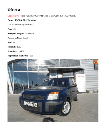Oferta Częstochowa / Ford Fusion 2009 Ford Fusion 1.4 TDCi 68 KM 5-G 2009 rok. Cena: 13900 PLN brutto Vin: WF0UXXGAJU9U46117 Drzwi: 5 Skrzynia biegów: manualna Rodzaj paliwa: diesel Moc: 68 Rocznik: 2009 Przebieg: 130501 Pojemność skokowa: 1400 Opis: Auto-Handel-Centrum Krotoski-Cichy Autoryzowany Dealer VW Audi Seat Skoda w CZĘSTOCHOWIE GWARANCJA POCHODZENIA MOŻLIWOŚĆ SPRAWDZENIA POJAZDU W STACJI OBSŁUGI. MOŻLIWOŚĆ POZOSTAWIENIA SWOJEGO SAMOCHODU UŻYWANEGO W ROZLICZENIU Uwaga: Miejsce ekspozycji pojazdu - Grupa Krotoski-Cichy Salon Pojazdów Używanych CZĘSTOCHOWA ul. Makuszyńskiego 74/76 Osoba kontaktowa tel: Grzegorz Blukacz + 48 601 383 710 Marcin Majer + 48 781 440 156 Jarosław Bogus +48 509 999 781 , tel. +48 34 3642-852 Możliwa jazda próbna po wcześniejszym uzgodnieniu terminu. Ford Fusion 1.4 TDCi 68 KM 5-G 2009 rok. Kolor: Granatowy Tapicerka: Czarna Wyposażenie samochodu: 15-calowe felgi aluminiowe Poduszki powietrzne 4 Lusterka boczne i klamki w kolorze czarnym Kierunkowskazy w lusterkach Elektrycznie sterowane szyby boczne z przodu Manualnie regulowane lusterka boczne Centralny zamek ze zdalnym sterowaniem Radio CD Klimatyzacja manualna Regulowana kierownica Dywaniki Manualna regulacja wysokości fotela kierowcy Dzielona kanapa Ogrzewana tylna szyba Antena radiowa umieszczona na dachu Koło zapasowe Gniazdo 12V Autoalarm Pilot do radia przy kierownicy Roleta bagażnika Oferujemy kompleksową obsługę sprzedaży ratalnej na bardzo dogodnych warunkach. Oferujemy ubezpieczenia samochodowe z wiodących na rynku ubezpieczalni - możliwość zakupu pakietu ubezpieczeniowego na miejscu. Ogłoszenie ma charakter informacyjny i stanowi zaproszenie do zawarcia umowy (art. 71 Kodeksu cywilnego); nie stanowi natomiast oferty handlowej w rozumieniu art. 66 § 1 Kodeksu cywilnego. W celu sprawdzenia zgodności oferty oraz uzyskania wszelkich informacji prosimy kontaktować się z handlowcem d.s. samochodów używanych. i540879296i Auto możesz zobaczyć: Ul. Makuszyńskiego 74/76 42-209 Częstochowa tel. +48 34 3642-852 Grzegorz Blukacz [email protected] kom. +48 601 383 710 Marcin Majer [email protected] kom. + 48 781 440 156 Jarosław Bogus [email protected] kom.+48 509 999 781