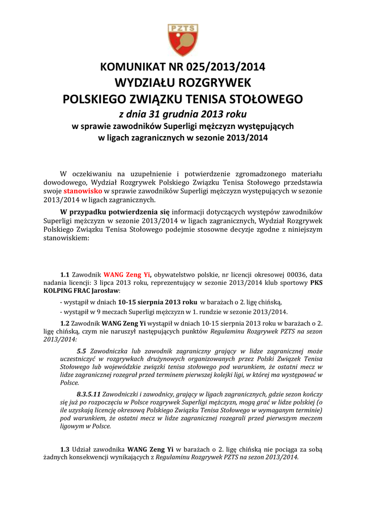 KOMUNIKAT NR 025/2013/2014 WYDZIAŁU ROZGRYWEK POLSKIEGO ZWIĄZKU TENISA STOŁOWEGO z dnia 31 grudnia 2013 roku w sprawie zawodników Superligi mężczyzn występujących w ligach zagranicznych w sezonie 2013/2014 W oczekiwaniu na uzupełnienie i potwierdzenie zgromadzonego materiału dowodowego, Wydział Rozgrywek Polskiego Związku Tenisa Stołowego przedstawia swoje stanowisko w sprawie zawodników Superligi mężczyzn występujących w sezonie 2013/2014 w ligach zagranicznych. W przypadku potwierdzenia się informacji dotyczących występów zawodników Superligi mężczyzn w sezonie 2013/2014 w ligach zagranicznych, Wydział Rozgrywek Polskiego Związku Tenisa Stołowego podejmie stosowne decyzje zgodne z niniejszym stanowiskiem: 1.1 Zawodnik WANG Zeng Yi, obywatelstwo polskie, nr licencji okresowej 00036, data nadania licencji: 3 lipca 2013 roku, reprezentujący w sezonie 2013/2014 klub sportowy PKS KOLPING FRAC Jarosław: - wystąpił w dniach 10-15 sierpnia 2013 roku w barażach o 2. ligę chińską, - wystąpił w 9 meczach Superligi mężczyzn w 1. rundzie w sezonie 2013/2014. 1.2 Zawodnik WANG Zeng Yi wystąpił w dniach 10-15 sierpnia 2013 roku w barażach o 2. ligę chińską, czym nie naruszył następujących punktów Regulaminu Rozgrywek PZTS na sezon 2013/2014: 5.5 Zawodniczka lub zawodnik zagraniczny grający w lidze zagranicznej może uczestniczyć w rozgrywkach drużynowych organizowanych przez Polski Związek Tenisa Stołowego lub wojewódzkie związki tenisa stołowego pod warunkiem, że ostatni mecz w lidze zagranicznej rozegrał przed terminem pierwszej kolejki ligi, w której ma występować w Polsce. 8.3.5.11 Zawodniczki i zawodnicy, grający w ligach zagranicznych, gdzie sezon kończy się już po rozpoczęciu w Polsce rozgrywek Superligi mężczyzn, mogą grać w lidze polskiej (o ile uzyskają licencję okresową Polskiego Związku Tenisa Stołowego w wymaganym terminie) pod warunkiem, że ostatni mecz w lidze zagranicznej rozegrali przed pierwszym meczem ligowym w Polsce. 1.3 Udział zawodnika WANG Zeng Yi w barażach o 2. ligę chińską nie pociąga za sobą żadnych konsekwencji wynikających z Regulaminu Rozgrywek PZTS na sezon 2013/2014. 2.1 Zawodnik WONG Chun Ting, obywatel Hongkongu, nr licencji okresowej 00078, data nadania licencji: 3 lipca 2013 roku, reprezentujący w sezonie 2013/2014 klub sportowy CONDOHOTELS MORLINY Ostróda: - wystąpił w dniach 25-29 września 2013 roku w barażach o 1. ligę chińską, - nie wystąpił w żadnym meczu 1. rundy w sezonie 2013/2014 Superligi mężczyzn. 2.2 Zawodnik WONG Chun Ting występując w dniach 25-29 września 2013 roku w barażach o 1. ligę chińską naruszył następujące punkty Regulaminu Rozgrywek PZTS na sezon 2013/2014: 5.5 Zawodniczka lub zawodnik zagraniczny grający w lidze zagranicznej może uczestniczyć w rozgrywkach drużynowych organizowanych przez Polski Związek Tenisa Stołowego lub wojewódzkie związki tenisa stołowego pod warunkiem, że ostatni mecz w lidze zagranicznej rozegrał przed terminem pierwszej kolejki ligi, w której ma występować w Polsce. 8.3.5.11 Zawodniczki i zawodnicy, grający w ligach zagranicznych, gdzie sezon kończy się już po rozpoczęciu w Polsce rozgrywek Superligi mężczyzn, mogą grać w lidze polskiej (o ile uzyskają licencję okresową Polskiego Związku Tenisa Stołowego w wymaganym terminie) pod warunkiem, że ostatni mecz w lidze zagranicznej rozegrali przed pierwszym meczem ligowym w Polsce. 2.3 Udział zawodnika WONG Chun Ting w dniach 25-29 września 2013 roku barażach o 1. ligę chińską skutkuje uznaniem go za zawodnika nieuprawnionego do uczestniczenia w rozgrywkach drużynowych organizowanych przez Polski Związek Tenisa Stołowego lub wojewódzkie związki tenisa stołowego. 3.1 Zawodnik WU Chih-Chi,obywatel Tajwanu, nr licencji okresowej 00790, data nadania licencji: 4 lipca 2013 roku,, reprezentujący w sezonie 2013/2014 klub sportowy KST ENERGAMANEKIN Toruń: - wystąpił w dniach 25-29 września 2013 roku w barażach o 1. ligę chińską, - wystąpił w 6 meczach Superligi mężczyzn w 1. rundzie w sezonie 2013/2014: - mecz numer 004 rozegrany w dniu 2 września 2013 roku pomiędzy ASTS OLIMPIA UNIA Grudziądz a KST ENERGA-MANEKIN Toruń zakończony wynikiem 3:1 dla ASTS OLIMPIA UNIA Grudziądz (zawodnik WU Chih-Chi rozegrał 1 pojedynek singlowy) - mecz numer 010 rozegrany w dniu 10 września 2013 roku pomiędzy KST ENERGAMANEKIN Toruń a ZKS PALMIARNIA Zielona Góra zakończony wynikiem 3:2 dla ZKS PALMIARNIA Zielona Góra (zawodnik WU Chih-Chi rozegrał 2 pojedynki singlowe) - mecz numer 013 rozegrany w dniu 31 października 2013 roku pomiędzy CONDOHOTELS MORLINY Ostróda a KST ENERGA-MANEKIN Toruń zakończony wynikiem 3:2 dla CONDOHOTELS MORLINY Ostróda (zawodnik WU Chih-Chi rozegrał 2 pojedynki singlowe) - mecz numer 017 rozegrany w dniu 29 października 2013 roku pomiędzy PKS KOLPING FRAC Jarosław a KST ENERGA-MANEKIN Toruń zakończony wynikiem 3:1 dla PKS KOLPING FRAC Jarosław (zawodnik WU Chih-Chi rozegrał 1 pojedynek singlowy) - mecz numer 021 rozegrany w dniu 2 listopada 2013 roku pomiędzy KST ENERGAMANEKIN Toruń a KS BOGORIA Grodzisk Mazowiecki zakończony wynikiem 3:1 dla KST ENERGA-MANEKIN Toruń (zawodnik WU Chih-Chi rozegrał 2 pojedynki singlowe) - mecz numer 028 rozegrany w dniu 10 listopada 2013 roku pomiędzy KS DEKORGLASS Działdowo a KST ENERGA-MANEKIN Toruń zakończony wynikiem 3:0 dla KS DEKORGLASS Działdowo (zawodnik WU Chih-Chi rozegrał 1 pojedynek singlowy) 3.2 Udział zawodnika WU Chih-Chi w dniach 25-29 września 2013 roku barażach o 1. ligę chińską skutkuje uznaniem go za zawodnika nieuprawnionego do uczestnictwa w meczach Superligi mężczyzn nr 004, 010, 013, 017, 021 i 028 oraz konsekwencjami wynikającymi z Regulaminu Rozgrywek PZTS na sezon 2013/2014: 16.2.1.9 niedozwolony udział w meczu ligowym zawodniczki lub zawodnika zagranicznego - weryfikacja wyniku meczu jako walkower dl