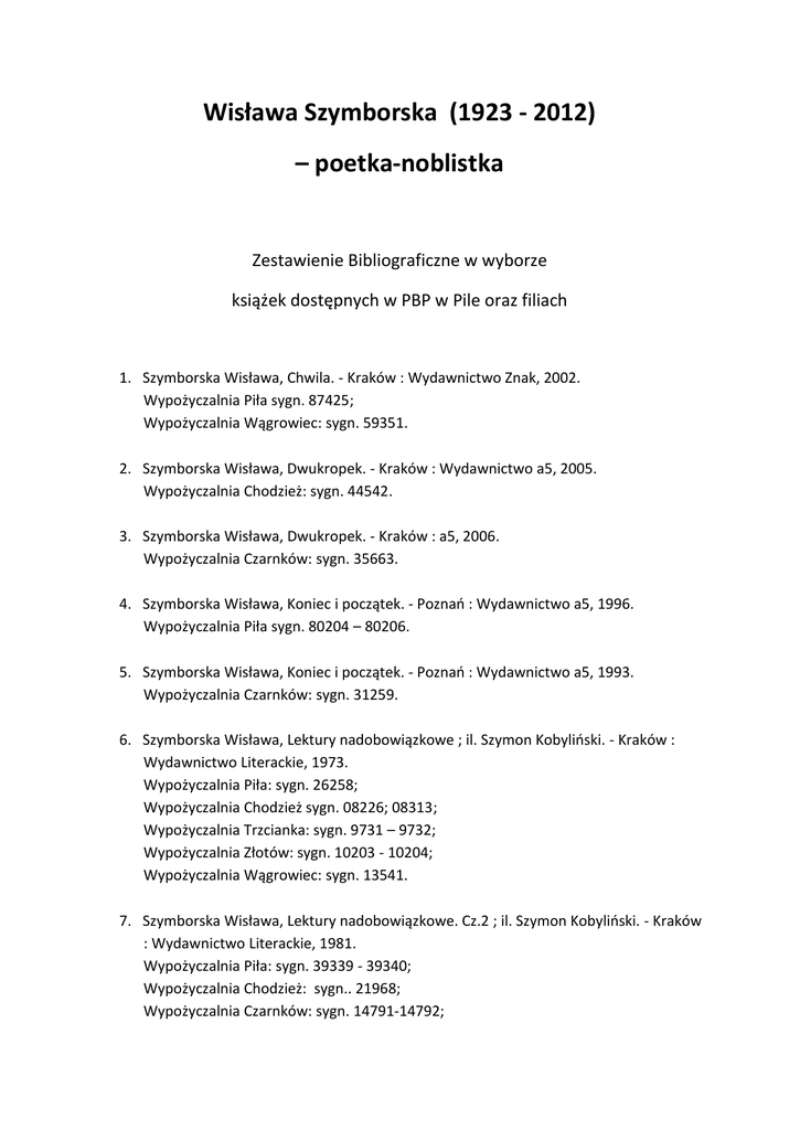 Wisława Szymborska (1923 - 2012) – poetka-noblistka Zestawienie Bibliograficzne w wyborze książek dostępnych w PBP w Pile oraz filiach 1. Szymborska Wisława, Chwila. - Kraków : Wydawnictwo Znak, 2002. Wypożyczalnia Piła sygn. 87425; Wypożyczalnia Wągrowiec: sygn. 59351. 2. Szymborska Wisława, Dwukropek. - Kraków : Wydawnictwo a5, 2005. Wypożyczalnia Chodzież: sygn. 44542. 3. Szymborska Wisława, Dwukropek. - Kraków : a5, 2006. Wypożyczalnia Czarnków: sygn. 35663. 4. Szymborska Wisława, Koniec i początek. - Poznań : Wydawnictwo a5, 1996. Wypożyczalnia Piła sygn. 80204 – 80206. 5. Szymborska Wisława, Koniec i początek. - Poznań : Wydawnictwo a5, 1993. Wypożyczalnia Czarnków: sygn. 31259. 6. Szymborska Wisława, Lektury nadobowiązkowe ; il. Szymon Kobyliński. - Kraków : Wydawnictwo Literackie, 1973. Wypożyczalnia Piła: sygn. 26258; Wypożyczalnia Chodzież sygn. 08226; 08313; Wypożyczalnia Trzcianka: sygn. 9731 – 9732; Wypożyczalnia Złotów: sygn. 10203 - 10204; Wypożyczalnia Wągrowiec: sygn. 13541. 7. Szymborska Wisława, Lektury nadobowiązkowe. Cz.2 ; il. Szymon Kobyliński. - Kraków : Wydawnictwo Literackie, 1981. Wypożyczalnia Piła: sygn. 39339 - 39340; Wypożyczalnia Chodzież: sygn.. 21968; Wypożyczalnia Czarnków: sygn. 14791-14792; Wypożyczalnia Złotów: sygn. 19589 - 19591; Wypożyczalnia Wągrowiec: sygn. 30107. 8. Szymborska Wisława, Ludzie na moście. - Warszawa : "Czytelnik", 1986. Wypożyczalnia Chodzież: sygn. 31641; Wypożyczalnia Wągrowiec: sygn. 41635. 9. Szymborska Wisława, Ludzie na moście. - Wyd. 2. - Warszawa : "Czytelnik", 1988. Wypożyczalnia Chodzież: sygn. 35626. 10. Szymborska Wisława, Nic dwa razy = Nothing Twice : wybór wierszy ; wybór i tł. Stanisław Barańczak, Clare Cavanagh ; posłowie Stanisław Barańczak. - Kraków : Wydawnictwo Literackie, 1997. Wypożyczalnia Piła: sygn. 80862. 11. Szymborska Wisława, Poezje : przedmowa Jerzego Kwiatkowskiego. - Wyd. 2. Warszawa : Państwowy Instytut Wydawniczy, 1977. Wypożyczalnia Wągrowiec: sygn. 20726. 12. Szymborska Wisława, Poezje ; aut. wyb., tł., przedmowa Magnus Jan Kryński, Robert A. Maguire. - Kraków : Wydawnictwo Literackie, 1989. Wypożyczalnia Chodzież: sygn. 36725; Wypożyczalnia Złotów: sygn. 34927; Wypożyczalnia Wągrowiec: sygn. 49338. 13. Szymborska Wisława, Poezje ; przedmowa Jerzy Kwiatkowski. - Wyd. 3. - Warszawa : "Alfa", 1987. Wypożyczalnia Piła: sygn. 68736 - 68737; Wypożyczalnia Wągrowiec: sygn. 46496 - 46497; 46494. 14. Szymborska Wisława, Poezje ; przedmowa Jerzy Kwiatkowski. - Warszawa : Państwowy Instytut Wydawniczy, 1970. Wypożyczalnia Piła: sygn. 05804. 15. Szymborska Wisława, Poezje wybrane (II). - Warszawa : Ludowa Spółdzielnia Wydawnicza, 1983. Wypożyczalnia Wągrowiec: sygn. 59488. 16. Szymborska Wisława, Sto wierszy - sto pociech = Hundert Gedichte - Hunder Freuden ; wybór, tł. i posłowie Karl Deducius. - Kraków : Wydawnictwo Literackie, 1997. Wypożyczalnia Piła: sygn. 80861. 17. Szymborska Wisława, Szymborska : szkice ; aut. Edward Balcerzan [i in.]. - Warszawa : Wydawnictwo "Open", 1996. Wypożyczalnia Piła: sygn. 80201 - 80202; Czytelnia Piła: tylko na miejscu sygn. 80203 P. 18. Szymborska Wisława, Tarsjusz i inne wiersze ; il. Barbara Gawdzik-Brzozowska. Warszawa : Krajowa Agencja Wydawnicza, 1976. Wypożyczalnia Piła sygn. 42027. 19. Szymborska Wisława, Widok z ziaren piasku : 102 wiersze. - Poznań : Wydawnictwo a5, 1996. Wypożyczalnia Piła: sygn. 80207 - 80208; Wypożyczalnia Chodzież: sygn. 39533. 20. Szymborska Wisława, Wiersze wybrane. - Wyd. nowe rozsz. - Kraków : Wydawnictwo a5, 2007. Wypożyczalnia Czarnków: sygn. 36497. 21. Szymborska Wisława, Wiersze wybrane. - Kraków : Wydawnictwo a5, 2000. Wypożyczalnia Chodzież: sygn. 41686. 22. Szymborska Wisława, Wiersze wybrane : wybór i układ autorki. - Wyd. 3, nowe rozszerz. - Kraków : Wydawnictwo a5, 2007. Wypożyczalnia Złotów: sygn. 43444. 23. Szymborska Wisława, Wybór wierszy. - Warszawa : Państwowy Instytut Wydawniczy, 1973. Wypożyczalnia Wągrowiec: sygn. 14267. II. Wydawnictwa zwarte: 1. 4 x Nobel, red. Grażyna Tomaszewska, Feliks Tomaszewski. - Warszawa : Wydawnictwo Piotra Marciszuka Stentor, 2002. Wypożyczalnia Piła: sygn. 94873 – 94874; Wypożyczalnia Chodzież: sygn. 44223. 2. Bikont Anna, Szczęsna Joanna, Pamiątkowe rupiecie, przyjaciele i sny Wisławy Szymborskiej. - Wyd. 2. - Warszawa : Prószyński i S-ka, 1997. Wypożyczalnia Piła: można wypożyczyć sygn. 82503. 3. Bortnowski Stanisław, Nowe spory, nowe scenariusze. - Warszawa : Stentor, 2001. Wypożyczalnia Trzcianka: sygn. 31107; Wypożyczalnia Wągrowiec: sygn. 59811. 4. Inglot Mieczysław, Między romantyzmem a współczesnością : (Poezja w szkole - od Adama Mickiewicza do Wisławy Szymborskiej). - Kielce : Wydawnictwo Pedagogiczne ZNP, 1996. Wypożyczalnia Piła: sygn. 80680; Czytelnia Piła: tylko na miejscu sygn. 80681 P; Wypożyczalnia Czarnków: sygn. 32457. 5. Kwartet żeński : Kazimiera Iłłakowiczówna, Maria Pawlikowska-Jasnorzewska, Wisława Szymborska, Ewa Lipska : wiersze, dwie wariacje w instrumentacji Karla Dedeciusa. - Poznań : Wydawnictwo Poznańskie, 1987. Wypożyczalnia Wągrowiec: sygn. 43719. 6. Legeżyńska Anna, Wisława Szymborska. - Wyd. 3. uzup. - Poznań : Dom Wydawniczy "Rebis", 1997. Wypożyczalnia Chodzież: sygn. 42256; Czytelnia Wągrowiec: tylko na miejscu sygn. 57741 P 19,5. 7. Legeżyńska Anna, Wisława Szymborska. - Wyd. 2 popr. - Poznań : Dom Wydawniczy "Rebis", 1996. Wypożyczalnia Piła: sygn. 80195 - 80197; Wypożyczalnia Chodzież: sygn. 39532; Wypożyczalnia Wągrowiec: sygn. 62989. 8. Majda Jan, Świat poetycki Wisławy Szymborskej. - Kraków : Wydawnictwo "Impuls" : "Text", 1996. Wypożyczalnia Piła: sygn. 80198 - 80200; Wypożyczalnia Złotów: sygn. 38252. 9. Mądre Polki, [projekt okł., il. oraz projekt graf. Zuzanna Malinowska]. - [Warszawa] : MG, 2011. Czytelnia Złotów: ty