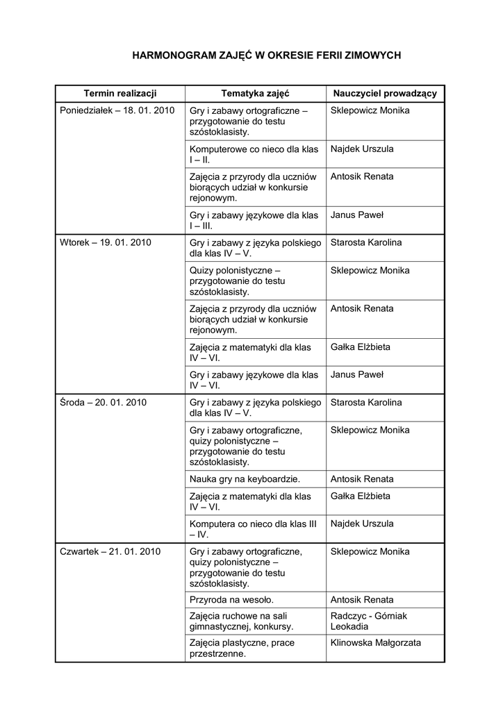 HARMONOGRAM ZAJĘĆ W OKRESIE FERII ZIMOWYCH Termin realizacji Poniedziałek – 18. 01. 2010 Wtorek – 19. 01. 2010 Środa – 20. 01. 2010 Czwartek – 21. 01. 2010 Tematyka zajęć Nauczyciel prowadzący Gry i zabawy ortograficzne – przygotowanie do testu szóstoklasisty. Sklepowicz Monika Komputerowe co nieco dla klas I – II. Najdek Urszula Zajęcia z przyrody dla uczniów biorących udział w konkursie rejonowym. Antosik Renata Gry i zabawy językowe dla klas I – III. Janus Paweł Gry i zabawy z języka polskiego Starosta Karolina dla klas IV – V. Quizy polonistyczne – przygotowanie do testu szóstoklasisty. Sklepowicz Monika Zajęcia z przyrody dla uczniów biorących udział w konkursie rejonowym. Antosik Renata Zajęcia z matematyki dla klas IV – VI. Gałka Elżbieta Gry i zabawy językowe dla klas IV – VI. Janus Paweł Gry i zabawy z języka polskiego Starosta Karolina dla klas IV – V. Gry i zabawy ortograficzne, quizy polonistyczne – przygotowanie do testu szóstoklasisty. Sklepowicz Monika Nauka gry na keyboardzie. Antosik Renata Zajęcia z matematyki dla klas IV – VI. Gałka Elżbieta Komputera co nieco dla klas III – IV. Najdek Urszula Gry i zabawy ortograficzne, quizy polonistyczne – przygotowanie do testu szóstoklasisty. Sklepowicz Monika Przyroda na wesoło. Antosik Renata Zajęcia ruchowe na sali gimnastycznej, konkursy. Radczyc - Górniak Leokadia Zajęcia plastyczne, prace przestrzenne. Klinowska Małgorzata Piątek – 22. 01. 2010 Gry i zabawy ortograficzne, quizy polonistyczne – przygotowanie do testu szóstoklasisty. Sklepowicz Monika Przyroda na wesoło. Antosik Renata Gry i zabawy dramowe. Markowska Ewelina Konkursy i quizy. Olszewska Kalina Mordel Małgorzata Zajęcia sportowe – gry i zabawy na sali gimnastycznej. Stamirowski Krzysztof Spotkanie z lekturą. Przybylska Kornelia Spotkanie z Unią Europejską Szmidt Łukasz Wtorek – 26. 01. 2010 Zajęcia sportowe – gry i zabawy na śniegu. Stamirowski Krzysztof Środa – 27. 01. 2010 Zajęcia sportowe – gry i zabawy na śniegu. Stamirowski Krzysztof Czwartek – 28. 01. 2010 eTwinning. Iwańska Danuta Piątek – 29. 01. 2010 Spotkanie z książką. Iwańska Danuta Poniedziałek – 25. 01. 2010 G M IN A Z IE L O N A G Ó RA FERIE 2010 Data Miejscowość Godzina odjazdu autobusu 18 stycznia 20010 poniedziałek Jarogniewice 9.45 19 stycznia 2010 r. wtorek Jarogniewie Jeleniów 9.35 9.45 20 stycznia 2010r. środa Jarogniewie Jeleniów 9.35 9.45 21 stycznia 2010 r. czwartek Jarogniewice 10.00 22 stycznia 2010 r. piątek Jarogniewie 9.45 25 stycznia 2010 r. poniedziałek Jarogniewie Barcikowie Kiełpin 9.35 9.40 9.45 26 stycznia 2010 r. wtorek Jarogniewie Barcikowie Kiełpin 9.35 9.40 9.45 27 stycznia 2010 r. środa Jarogniewie Barcikowie Kiełpin 9.35 9.40 9.45 Powrót około godziny 13.00