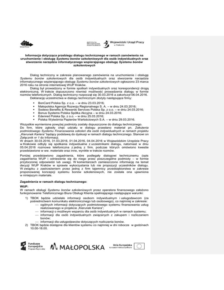 Informacja dotycząca przebiegu dialogu technicznego w ramach zamówienia na uruchomienie i obsługę Systemu bonów szkoleniowych dla osób indywidualnych oraz stworzenie narzędzia informatycznego wspierającego obsługę Systemu bonów szkoleniowych Dialog techniczny w zakresie planowanego zamówienia na uruchomienie i obsługę Systemu bonów szkoleniowych dla osób indywidualnych oraz stworzenie narzędzia informatycznego wspierającego obsługę Systemu bonów szkoleniowych ogłoszono 23 marca 2016 roku na stronie internetowej WUP Kraków. Dialog był prowadzony w formie spotkań indywidualnych oraz korespondencji drogą elektroniczną. W trakcie dopuszczono również możliwość prowadzenia dialogu w formie rozmów telefonicznych. Dialog techniczny rozpoczął się 30.03.2016 a zakończył 06.04.2016. Deklarację uczestnictwa w dialogu technicznym złożyły następujące firmy: BonCard Polska Sp. z o.o. – w dniu 23.03.2016; Małopolska Agencja Rozwoju Regionalnego S. A. – w dniu 24.03.2016; Sodexo Benefits & Rewards Services Polska Sp. z o.o. – w dniu 24.03.2016; Bonus Systems Polska Spółka Akcyjna – w dniu 24.03.2016; Edenred Polska Sp. z o.o. – w dniu 25.03.2016; Polska Wytwórnia Papierów Wartościowych S.A. – w dniu 29.03.2016. Wszystkie wymienione powyżej podmioty zostały dopuszczone do dialogu technicznego. Do firm, które zgłosiły chęć udziału w dialogu przesłano materiał pn. Założenia podmiotowego Systemu Finansowania szkoleń dla osób indywidualnych w ramach projektu „Kierunek Kariera” będący podstawą do dyskusji w ramach dialogu technicznego. Stanowi on Załącznik nr 1 do Informacji. W dniach 30.03.2016, 31.03.2016, 01.04.2016, 04.04.2016 w Wojewódzkim Urzędzie Pracy w Krakowie odbyły się spotkania indywidualne z uczestnikami dialogu, natomiast w dniu 05.04.2016 rozmowa telefoniczna z jedną z firm, podczas których omówiono kwestie przedstawione w ww. materiale oraz inne, wynikłe w trakcie rozmów. Poniżej przedstawiono zagadnienia, które podlegały dialogowi technicznemu (opis zagadnienia WUP i odniesienie się do niego przez poszczególne podmioty – w formie przytoczonej odpowiedzi lub uwag). W komentarzach zamieszczono informację na temat decyzji WUP Kraków w sprawie wykorzystania lub nie propozycji uczestników dialogu. W związku z zastrzeżeniem przez jedną z firm tajemnicy przedsiębiorstwa w zakresie proponowanej koncepcji systemu bonów szkoleniowych, nie została ona ujawniona w niniejszym materiale. Zagadnienia w ramach dialogu technicznego: WUP: W ramach obsługi Systemu bonów szkoleniowych przez operatora finansowego założono funkcjonowanie Telefonicznego Biura Obsługi Klienta spełniającego następujące warunki: 1) TBOK będzie udzielało informacji osobom indywidualnym i usługodawcom (za pośrednictwem komunikatu elektronicznego lub osobowego), co najmniej w zakresie: ogólnych informacji dotyczących podmiotowego systemu finansowania usług realizowanego w projekcie „Kierunek Kariera”; informacji o możliwym wsparciu dla osób indywidualnych w ramach systemu; informacji dla osób indywidualnych związanych z zakupem i rozliczaniem bonów; informacji dla usługodawców dotyczących rozliczania bonów. 2) TBOK będzie dostępne dla klientów systemu co najmniej w dni robocze w godzinach 10.00-18.00. 3) TBOK będzie prowadzone pod wydzielonym na potrzeby obsługi klientów systemu bonowego numerem telefonu. 4) Połączenie i rozmowa z TBOK będą opłacane przez osobę dzwoniącą zgodnie z cennikiem operatora sieci telefonicznej. 5) Po połączeniu z TBOK klient usłyszy powitanie, z którego będzie jasno wynikało, że dodzwonił się do TBOK systemu bonowego. Klient dzwoniący poza godzinami pracy TBOK usłyszy komunikat dot. tego, że dodzwonił się do TBOK systemu bonowego i w jakich godzinach TBOK pracuje. W przypadku, gdy linia będzie zajęta klient usłyszy komunikat, że wszystkie linie są zajęte i należy oczekiwać na połączenie z Operatorem finansowym. W przypadku, gdy czas oczekiwania na połączenie przekroczy 1 minutę, klient usłyszy powiadomienie o przewidywanym czasie oczekiwania. 6) W ramach TBOK utworzony zostanie adres e-mail dedykowany do użytkowników Systemu bonów szkoleniowych. Jakie są inne możliwe sposoby komunikowania się użytkowników systemu z Operatorem finansowym. Proszę o odniesienie się do powyższej propozycji. Odpowiedź nr 1: Realizacja opisanych założeń jest możliwa. Rekomendowane jest jednak ograniczenie zakresu udzielanych informacji do działań operacyjnych związanych z obsługą systemu bonowego (bez ogólnych informacji dotyczących podmiotowego systemu finansowania usług realizowanego w projekcie „Kierunek Kariera” oraz informacji o możliwym wsparciu dla osób indywidualnych w ramach systemu). Z komentarzem [BS1]: Z uwagi na kosztochłonność tego elementu zamówienia zrezygnowano z tworzenia profesjonalnego call center na rzecz obsługi telefonicznej i mailowej użytkowników systemu w zakresie realizowanych przez Operatora działań operacyjnych. WUP: Głównym założeniem Zamawiającego w odniesieniu do bonów wykorzystywanych w projekcie „Kierunek Kariera” jest spełnienie poniższych warunków: a) zabezpieczenie bonów przed sfałszowaniem oraz defraudacją; b) umożliwienie identyfikacji osób korzystających ze wsparcia w projekcie przez usługodawcę; c) umożliwienie usługodawcy bieżącego monitoringu zrealizowanej ilości godzin szkoleniowych; d) umożliwienie przekazania płatności za zrealizowane usługi po dokonaniu rozliczenia przez Operatora finansowego; e) zabezpieczenie środków publicznych przed nadużyciami ze strony uczestników projektu oraz usługodawców. Powyższe założenia systemu oparto na doświadczeniach WUP Kraków w realizacji projektu pilotażowego pn. „PFK – Podmiotowe Finansowanie Kształcenia”, w ramach którego wykorzystywano bony papierowe. Proszę o przedstawienie innych a