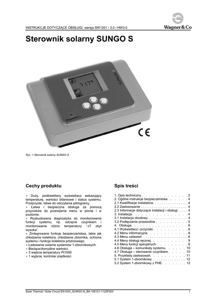 INSTRUKCJE DOTYCZĄCE OBSŁUGI, wersja SW1201 / 3.0 / HW3.0 Sterownik solarny SUNGO S Ryc. 1 Sterownik solarny SUNGO S Cechy produktu Spis treści ● Duży, podświetlany wyświetlacz wskazujący temperaturę, wartości bilansowe i status systemu. Przejrzyste, łatwe do odczytania piktogramy. ● Łatwa i bezpieczna obsługa za pomocą przycisków do przewijania menu w pionie i w poziomie. ● Rozbudowana diagnostyka do monitorowania funkcji systemu, np. odcięcie czujnikiem i monitorowanie różnic temperatury “ T zbyt wysoka”. ● Zintegrowane funkcje bezpieczeństwa, takie jak chłodzenie kolektora, chłodzenie zbiornika, ochrona systemu i funkcja kolektora próżniowego. ● Ładowanie solarne systemów 1-zbiornikowych. ● Bieżące/domyślne wartości. ● 3 wejścia temperatury Pt1000 ● 1 wyjście, kontroler prędkości 1. Opis techniczny . . . . . . . . . . . . . 2 2. Ogólne instrukcje bezpieczeństwa . . . . . . 4 2.1 Kwalifikacje instalatora. . . . . . . . . . . . . . . . . . . 4 2.2 Zastosowanie . . . . . . . . . . . . . . . . . . . . . . . . . 4 2.3 Informacje dotyczące instalacji i obsługi . . . . . 4 3. Instalacja. . . . . . . . . . . . . . . . 4 3.1 Instalacja obudowy . . . . . . . . . . . . . . . . . . . . . 4 3.2 Podłączenie przewodów . . . . . . . . . 5 4. Obsługa. . . . . . . . . . . . . . . . . . . 6 4.1 Wyświetlacz i przyciski . . . . . . . . . . 6 4.2 Menu informacyjne. . . . . . . . . . . . 8 4.3 Menu ustawień . . . . . . . . . . . . . . . . . . . . . . . . . 8 4.4 Menu obsługi ręcznej. . . . . . . . . . . 9 4.5 Menu funkcji specjalnych . . . . . . . . . 9 4.6 Obsługa – komunikaty systemu. . . . . . 10 4.7 Obsługa – sterowanie czujnikiem. . . . . 10 5. Przykłady zastosowań. . . . . . . . . . 11 5.1 System 1-zbiornikowy. . . . . . . . . . . . . . . . . . . 12 5.2 System 1-zbiornikowy z PHE. . . . . . . 12 Solar Thermal / Solar Circuit EN-XXX_SUNGO-S_BA-100121-1122P200 1 1. Opis techniczny Sterownik solarny SUNGO S Materiał W 100% przetwarzalna obudowa ABS do montażu naściennego Wymiary (dł. x wys. x szer. 173 x 130 x 51) w mm) Typ ochrony IP40 wg VDE 0470 Stopień zakłóceń radiowych N wg VDE 0875 Sieć zasilająca 230 V AC; 50 Hz; -10% do +15% Max. rozmiar kabli dla 2,5 mm2 skręcony / połączeń 230V pojedynczy Czujnik temperatury / Pt1000; 1000Ω przy 0°C; zakres temperatury Zakres: -30°C do +225°C Naprężenie czujnika Sprawdź, czy kabel nie powoduje naprężenia czujnika; nie wolno powodować mechanicznego naprężenia czujnika, jeśli temperatura przekracza 60°C Napięcie testowe 4 kV dla 1 min. wg VDE 0631 Napięcie łączeniowe 230 V AC Parametry wyj. łączników 1A / 230 VA dla cos φ=0,7-1,0 Bezpiecznik, wewnętrzny Bezpiecznik niskoprądowy 5x20 mm 2 A/T (2 ampery, powolny) Temp. pracy (wewnętrzna), 0° do +50°C / -10° do +65°C temp. przechowywania Waga ok. 360 g Ładowanie solarne Pompa obiegu solarnego jest włączana i wyłączana poprzez kontrolę różnicy temperatur. Elementami kontrolnymi są czujniki T1 (kolektor) i T2 (zasobnik, dolna część). Warunki włączania/wyłączania oraz ograniczenie temperatury można zmienić w menu ustawień. Uwaga: ograniczenie temperatury zawsze dotyczy czujnika T2 (zasobnik, dolna połowa). Kontrola prędkości Pompą obiegu solarnego można sterować poprzez kontrolę prędkości (w tym przypadku kontrolę pakietem impulsów). Oznacza to, że pojedyncze półfale prądu przemiennego są włączane lub wyłączane w zależności od różnicy temperatur. Dzięku temu prędkość można zmieniać w zakresie, co skutkuje dłuższym czasem przebiegu systemu. Prędkość minimalną można ustawić manualnie. Czujnik T3 (zasobnik, górna połowa) Czujnik T3 (zasobnik, górna połowa) jest czujnikiem wskazującym temperaturę w górnej części zbiornika. Nie posiada funkcji przełączania i nie jest monitorowany przez system diagnostyczny. Wartości bilansowe Poza faktycznymi wskazaniami czujników T1 (kolektor) i T2 (zbiornik, dolna połowa), wyświetlacz wskazuje również wartości bilansowe przedstawiające min. i max. wartości temperatury dla każdego czujnika. Po zresetowaniu wyświetlana jest aktualna faktyczna temperatura. Solar Thermal / Solar Circuit EN-XXX_SUNGO-S_BA-100121-1122P200 Obsługa ręczna Obsługa ręczna pozwala na manualne włączanie i wyłączanie kanałów wejścia i wyjścia. Po wyjściu z menu obsługi ręcznej, oprogramowanie powraca do pracy automatycznej. Menu obsługi ręcznej może być używane przez maksymalnie 8 godzin. Po tym czasie oprogramowanie automatycznie przełącza się z powrotem na obsługę automatyczną w menu informacyjnym. Funkcja ręcznego opóźnienia W celu sprawdzenia wartości temperatury w menu informacyjnym, także gdy kanały wyjścia zostały ustawione ręcznie, w funkcji ręcznego opóźnienia w menu obsługi ręcznej należy wybrać opóźnienie. Po wyjściu z menu obsługi ręcznej, opóźnienie występuje raz, a następnie jest ustawiane z powrotem na zero. W tym trybie, w menu informacyjnym widoczny jest mrugający symbol obsługi ręcznej. Chłodzenie kolektora Zasobnik jest załadowany do granicy wstępnie ustawionej temperatury, która to granica dotyczy czujnika T2 (zasobnik, dolna część). Jeśli wstępnie ustawiona temperatura graniczna zostanie przekroczona, wyjście A1 (pompa obiegu solarnego) wyłącza się. Jeśli temperatura T1 (kolektora) wzrośnie następnie powyżej regulowanej wartości standardowej 110°C, pompa obiegu solarnego załącza się, aby chłodzić kolektor. Wyłącza się ponownie, gdy temperatura w czujniku kolektora zmniejszy się o 10 K. Ta przerywana praca pompy obiegu solarnego oznacza, że kolektor nigdy lub bardzo rzadko znajduje się w stanie bezczynności. Jeśli wstępnie ustawiona temperatura graniczna zbiornika zostanie przekroczona o 5 K, funkcja chłodzenia kolektora zostanie stłumiona. System wyłączy się całkowicie. Chłodzenie zasobnika Chłodzenie zasobnika o