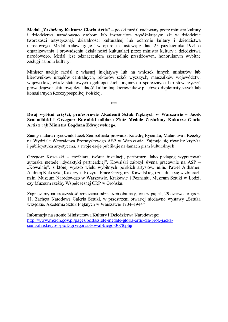 Medal „Zasłużony Kulturze Gloria Artis” – polski medal nadawany przez ministra kultury i dziedzictwa narodowego osobom lub instytucjom wyróżniającym się w dziedzinie twórczości artystycznej, działalności kulturalnej lub ochronie kultury i dziedzictwa narodowego. Medal nadawany jest w oparciu o ustawę z dnia 25 października 1991 o organizowaniu i prowadzeniu działalności kulturalnej przez ministra kultury i dziedzictwa narodowego. Medal jest odznaczeniem szczególnie prestiżowym, honorującym wybitne zasługi na polu kultury. Minister nadaje medal z własnej inicjatywy lub na wniosek innych ministrów lub kierowników urzędów centralnych, rektorów szkół wyższych, marszałków województw, wojewodów, władz statutowych ogólnopolskich organizacji społecznych lub stowarzyszeń prowadzących statutową działalność kulturalną, kierowników placówek dyplomatycznych lub konsularnych Rzeczypospolitej Polskiej. *** Dwaj wybitni artyści, profesorowie Akademii Sztuk Pięknych w Warszawie – Jacek Sempoliński i Grzegorz Kowalski odbiorą Złote Medale Zasłużony Kulturze Gloria Artis z rąk Ministra Bogdana Zdrojewskiego. Znany malarz i rysownik Jacek Sempoliński prowadzi Katedrę Rysunku, Malarstwa i Rzeźby na Wydziale Wzornictwa Przemysłowego ASP w Warszawie. Zajmuje się również krytyką i publicystyką artystyczną, a swoje eseje publikuje na łamach pism kulturalnych. Grzegorz Kowalski – rzeźbiarz, twórca instalacji, performer. Jako pedagog wypracował autorską metodę „dydaktyki partnerskiej”. Kowalski założył słynną pracownię na ASP – „Kowalnię”, z której wyszło wielu wybitnych polskich artystów, m.in. Paweł Althamer, Andrzej Kokoszka, Katarzyna Kozyra. Prace Grzegorza Kowalskiego znajdują się w zbiorach m.in. Muzeum Narodowego w Warszawie, Krakowie i Poznaniu, Muzeum Sztuki w Łodzi, czy Muzeum rzeźby Współczesnej CRP w Orońsku. Zapraszamy na uroczystość wręczenia odznaczeń obu artystom w piątek, 29 czerwca o godz. 11. Zachęta Narodowa Galeria Sztuki, w przestrzeni otwartej niedawno wystawy „Sztuka wszędzie. Akademia Sztuk Pięknych w Warszawie 1904–1944” Informacja na stronie Ministerstwa Kultury i Dziedzictwa Narodowego: http://www.mkidn.gov.pl/pages/posts/zlote-medale-gloria-artis-dla-prof.-jackasempolinskiego-i-prof.-grzegorza-kowalskiego-3078.php