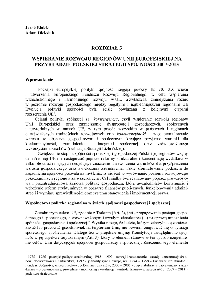 Jacek Białek Adam Oleksiuk ROZDZIAŁ 3 WSPIERANIE ROZWOJU REGIONÓW UNII EUROPEJSKIEJ NA PRZYKŁADZIE POLSKIEJ STRATEGII SPÓJNOŚCI 2007-2013 Wprowadzenie Początki europejskiej polityki spójności sięgają połowy lat 70. XX wieku i utworzenia Europejskiego Funduszu Rozwoju Regionalnego, w celu wspierania wszechstronnego i harmonijnego rozwoju w UE, a zwłaszcza zmniejszania różnic w poziomie rozwoju gospodarczego między bogatymi i najbiedniejszymi regionami UE Ewolucja polityki spójności była ściśle powiązana z kolejnymi etapami rozszerzenia UE1. Celami polityki spójności są: konwergencja, czyli wspieranie rozwoju regionów Unii Europejskiej oraz zmniejszanie dysproporcji gospodarczych, społecznych i terytorialnych w ramach UE, w tym przede wszystkim w państwach i regionach o największych trudnościach rozwojowych oraz konkurencyjność a więc stymulowanie wzrostu w obszarze gospodarczym i społecznym kreujące przyjazne warunki dla konkurencyjności, zatrudnienia i integracji społecznej oraz zrównoważonego wykorzystania zasobów (realizacja Strategii Lizbońskiej). Zwiększanie stopnia spójności społecznej i gospodarczej Polski i jej regionów względem średniej UE ma następować poprzez reformy strukturalne i koncentrację wydatków w kilku obszarach mających decydujące znaczenie dla tworzenia warunków dla przyśpieszenia wzrostu gospodarczego oraz zwiększania zatrudnienia. Takie sformułowanie podejścia do zagadnienia spójności pozwala na myślenie, iż nie jest to wyrównanie poziomu rozwojowego poszczególnych regionów za wszelką cenę. Cel miałby być realizowany poprzez prowzrostową i prozatrudnieniową krajową politykę gospodarczą, która uwzględniłaby kontynuację i wdrożenie reform strukturalnych w obszarze finansów publicznych, funkcjonowania administracji i wymiaru sprawiedliwości oraz systemu stanowienia i implementacji prawa. Wspólnotowa polityka regionalna w świetle spójności gospodarczej i społecznej Zasadniczym celem UE, zgodnie z Traktem (Art. 2), jest „propagowanie postępu gospodarczego i społecznego, o zrównoważonym i trwałym charakterze (...) za sprawą umocnienia spójności gospodarczej i społecznej.” Wynika z tego, że ludzie, którym zdarzyło się zamieszkiwać lub pracować gdziekolwiek na terytorium Unii, nie powinni znajdować się w sytuacji społecznego upośledzenia. Dlatego też w projekcie unijnej Konstytucji uwzględniono spójność w jej aspekcie terytorialnym (Art. 3), który to element stanowi w ten sposób uzupełnienie celów Unii dotyczących spójności gospodarczej i społecznej. Znaczeniu tego elementu 1 1975 – 1985 - początki polityki strukturalnej, 1985 – 1993 - rozwój i rozszerzenie - zasady: koncentracji środków, dodatkowości i partnerstwa, 1992 - jednolity rynek europejski, 1994 – 1999 - Fundusze strukturalne i Fundusz Spójności, więcej środków, celów, instrumentów, 2000 – 2006 - etap stabilizacji, usprawnienie zarządzania – programowanie, procedury - monitoring i ewaluacja, kontrola finansowa, zasada n+2, 2007 – 2013 podejście strategiczne 32 Jacek Białek, Adam Oleksiuk dano również wyraz w art. 16 („Zasady”) Traktatu, w którym uznano, że obywatele winni mieć dostęp do podstawowych usług, podstawowej infrastruktury i wiedzy, dzięki podkreśleniu wagi usług będących przedmiotem ogólnego zainteresowania czynników gospodarczych dla propagowania spójności społecznej i terytorialnej. Koncepcja spójności terytorialnej rozciąga się poza obszar pojęcia spójności gospodarczej i społecznej, stanowiąc jej uzupełnienie i wzmocnienie zarazem2. W kategoriach realizowanej polityki celem jest pomoc w osiągnięciu bardziej zrównoważonego rozwoju, za sprawą zmniejszania występujących, zapobiegania stanom nierównowagi terytorialnej oraz zwiększania spójności kierunków polityki realizowanej wobec sektorów czy branż jak i polityki regionalnej. Istotna jest tu także poprawa integracji terytorialnej i tworzenie zachęt do współpracy międzyregionalnej (http://www.ec.europa.eu/regional_policy). Znaczenie polityki spójności dla zrównoważonego rozwoju Unii Europejskiej docenił również Parlament Europejski formułując rezolucję, w której przyjęto stwierdzenie, że spójność terytorialna stanowi fundamentalny cel zagospodarowania przestrzennego Unii i że nadaje ona znaczenie polityce rozwoju regionalnego (http://www.europarl.europa.eu/sides) Rozwój instytucji samorządu terytorialnego w Polsce, poszerzanie jego kompetencji i odpowiedzialności za podejmowane decyzje znalazły odbicie w zasadach prowadzenia polityki regionalnej. Wyrazem tego jest 16 Regionalnych Programów Operacyjnych, będących głównym instrumentem realizacji polityki regionalnej na szczeblu regionalnym. Politykę regionalną stanowią zatem skoordynowane działania w ramach: a) prowadzonej przez rząd polityki międzyregionalnej, zorientowanej na regulowanie międzyregionalnych dysproporcji rozwoju i zwiększanie spójności, realizowanej poprzez programy operacyjne inicjowane i koordynowane przez rząd, b) prowadzonej przez samorządy województw polityki wewnątrzregionalnej, nakierowanej na realizację własnych celów, na bazie własnych środków i na własną odpowiedzialność, ale ze wsparciem finansowym ze środków budżetu państwa i Unii Europejskiej. Wspólnotowa polityka regionalna jest kluczowym instrumentem dla spójności gospodarczej i społecznej, dla konwergencji gospodarczej i, ogólnie, dla procesu integracji europejskiej. Za prowadzeniem wspólnej polityki regionalnej przemawiały znaczne rozpiętości w poziomie rozwoju gospodarczego pomiędzy poszczególnymi regionami, występujące od chwili powstania tej organizacji, które w trakcie procesów integracyjnych nie ulegały ograniczeniu, lecz wręcz przeciwnie – pogłębiły się. Regiony centralne rozwijały się w EWG znacznie szybciej niż regiony peryferyjne. Produ