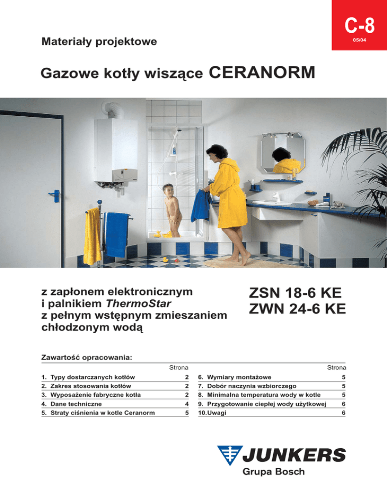 C-8 Materia³y projektowe 05/04 Gazowe kot³y wisz¹ce CERANORM z zap³onem elektronicznym i palnikiem ThermoStar z pe³nym wstêpnym zmieszaniem ch³odzonym wod¹ ZSN 18-6 KE ZWN 24-6 KE Zawartoœæ opracowania: Strona 1. 2. 3. 4. 5. Typy dostarczanych kot³ów Zakres stosowania kot³ów Wyposa¿enie fabryczne kot³a Dane techniczne Straty ciœnienia w kotle Ceranorm 2 2 2 4 5 Strona 6. Wymiary monta¿owe 7. Dobór naczynia wzbiorczego 8. Minimalna temperatura wody w kotle 9. Przygotowanie ciep³ej wody u¿ytkowej 10.Uwagi 5 5 5 6 6 Ceranorm ZSN 18-6 KE i ZWN 24-6 KE 1. Typy dostarczanych kot³ów ZSN/ZWN 18/24-6 KE Typ kot³a Nr katalogowy Rodzaj gazu ZWN 24-6 KE ZSN 18-6 KE 7 716 010 173 7 716 010 174 GZ 50 GZ 50 C-8 05/04 Oznaczenia: Z S = wisz¹cy kocio³ c.o. = przy³¹cze zasobnika c.w.u. (wbudowany zawór trójdrogowy do wspó³pracy z zasobnikiem) W = kocio³ 2-funkcyjny z wymiennikiem c.w.u. N = Ceranorm 18/24 = nominalna moc cieplna 18 lub 24 kW -6 = generacja urz¹dzenia K = pod³¹czenie do komina E = zap³on elektroniczny 23 = przystosowany fabrycznie na gaz GZ 50 Istnieje mo¿liwoœæ przezbrojenia kot³a na inne rodzaje gazu: GZ 50, GZ 35, GZ 41,5 i gaz p³ynny (propan). Dostêpne s¹ nastêpuj¹ce zestawy przezbrojeniowe: Typ Gaz Nr katalogowy ZSN 18-6 KE GZ 41,5 7 710 229 034 ZSN 18-6 KE propan 7 710 249 088 ZWN 24-6 KE propan 7 710 249 089 ZWN 24-6 KE GZ 41,5 7 710 229 035 2. Zakres stosowania kot³ów Kot³y Ceranorm ZSN/ZWN... przeznaczone s¹ do stosowania w niskotemperaturowych zamkniêtych instalacjach c.o. o maksymalnej temperaturze zasilania 90°C i maksymalnym ciœnieniu roboczym do 3 bar. Najczêœciej maj¹ zastosowanie do centralnego ogrzewania domów jednorodzinnych, mieszkañ eta¿owych itd. Kocio³ montowany jest na œcianie i dziêki temu nie wymaga dodatkowego miejsca stoj¹cego. U³atwia to póŸniejszy monta¿ urz¹dzenia w przypadku modernizacji starego budownictwa. Otwarte instalacje c.o. trzeba przebudowaæ na systemy zamkniête (wg PN-91/B-02414). W grawitacyjnych systemach c.o. kocio³ nale¿y pod³¹czyæ do istniej¹cej instalacji poprzez sprzêg³o hydrauliczne. W wersji jednofunkcyjnej ZSN 18-6 KE oprócz funkcji c.o. s¹ fabrycznie przystosowane do pod³¹czenia zasobnika pojemnoœciowego ciep³ej wody u¿ytkowej. 2 W wersji dwufunkcyjnej ZWN 24-6 KE oprócz funkcji c.o. umo¿liwia podgrzewanie c.w.u. w sposób przep³ywowy. Przy zastosowaniu regulatora TA270 lub TA300 (patrz C-0 pkt.5.6) istnieje mo¿liwoœæ pracy 2-5 kot³ów w uk³adzie kaskadowym. 3. Wyposa¿enie fabryczne kot³a Ceranorm Kot³y Ceranorm ZSN/ZWN z zap³onem elektronicznym, wyposa¿one s¹ w palnik lamelowy ThermoStar, atmosferyczny ze stali nierdzewnej, z pe³nym wstêpnym zmieszaniem, ch³odzony wod¹, o p³ynnej modulacji, przystosowany do spalania gazów ziemnych i p³ynnych. Palnik ten wyposa¿ony jest w automatyczny aparat zap³onowy, czujnik Infolinia 0801 600 801 Ceranorm ZSN 18-6 KE i ZWN 24-6 KE Ð dwa tryby poboru ciep³ej wody: komfortowy (z wstêpnym podgrzaniem c.w.u. w regulowanym zakresie 40-60°C) i ekonomiczny bez wstêpnego podgrzania (wersja dwufunkcyjna ZWN), Ð funkcjê zdalnego sygnalizowania zapotrzebowania na ciep³¹ wodê (tzw. „rozkaz”), wersja ZWN, Ð efektywny uk³ad separacji powietrza upraszczaj¹cy rozruch kot³a. Gazowy kocio³ wisz¹cy Ceranorm ZSN/ZWN jest sterowany przez uk³ad regulacyjny Bosch ® Heatronic , umo¿liwiaj¹cy pe³n¹ kontroli awarii. Na wyœwietlaczu wielofunkcyjnym mo¿na odczytaæ temperatury zasilania c.o., wody u¿ytkowej, kody awarii, odczytaæ oraz zaprogramowaæ ró¿ne parametry serwisowe. Kocio³ mo¿e wspó³pracowaæ z systemem Bosch Domotic (tzw. inteligentne budynki). Kocio³ wyposa¿ony jest tak¿e w funkcjê ochrony pompy przed blokowaniem (pompa w³¹cza siê co 24 h) oraz system ochrony przeciw zamarzaniu, kocio³ w³¹czy siê gdy temperatura na czujniku zasilania spadnie poni¿ej 10°C. Kocio³ jest wyposa¿ony w atmosferyczny palnik ThermoStar ze zmieszaniem wstêpnym ch³odzony wod¹ zapewniaj¹cy wysok¹ sprawnoœæ urz¹dzenia oraz nisk¹ emisjê substancji szkodliwych (NOX i CO) w spalinach. Palnik ten mo¿na w bardzo prosty i szybki sposób wymontowaæ z kot³a celem np. wyczyszczenia. Kombinacja z regulatorem pokojowym lub pogodowym pozwala na osi¹gniêcie bardzo wysokiego komfortu. Moc urz¹dzenia regulowana jest p³ynnie zgodnie z zapotrzebowaniem na ciep³o. Gazowy kocio³ wisz¹cy wykonany jest fabrycznie jako niskotemperaturowe Ÿród³o ciep³a, w którym temperatura zasilania obiegu c.o. wynosi 75°C. Temperaturê zasilania mo¿na podwy¿szyæ do max. 90°C. Rozszerzenie zakresu regulacji oraz u³atwienie prac monta¿owych zapewnia zastosowanie osprzêtu dodatkowego, którego zestawienie wraz ze szczegó³owym opisem znajduje siê w czêœci C-0 pkt. 4 i 5. p³omienia z elektrod¹ jonizacyjn¹ oraz dodatkowy czujnik ci¹gu kominowego. Specjalna konstrukcja palnika obni¿a temperaturê p³omienia redukuj¹c iloœæ NOx i CO w spalinach - znak „B³êkitny Anio³”. Niewielka iloœæ dysz oraz du¿a œrednica rur mieszacza palnika zapewnia bardzo cich¹ pracê urz¹dzenia (zaledwie 36dB). Wymiennik ciep³a, którego lamele wykonane s¹ ze stali szlachetnej nierdzewnej zapewnia d³ug¹ ¿ywotnoœæ kot³a oraz umo¿liwia bezpoœrednie pod³¹czenie ogrzewania pod³ogowego do kot³a Ceranorm bez koniecznoœci stosowania zaworu trójdrogowego. Ka¿dy kocio³ jest kompletnym urz¹dzeniem i dostarczany jest w stanie gotowoœci do pracy i jest wyposa¿ony w nastêpuj¹ce elementy regulacyjne, bezpieczeñstwa i obs³ugi: Ð termostat kot³a umo¿liwiaj¹cy nastawienie temperatury na c.o. w zakresie od 35-90°C, Ð regulator temperatury c.w.u. w zakresie 40-60°C (wersja dwufunkcyjna ZWN) oraz 10-70°C (wersja jednofunkcyjna ZSN; mo¿liwoœæ wygrzania zasobnika do 70°C tzw. dezynfekcja), Ð g³ówny wy³¹cznik sieciowy (zasilania elektrycznego), Ð wyœwietlacz wielofunkcyjny, Ð ogran