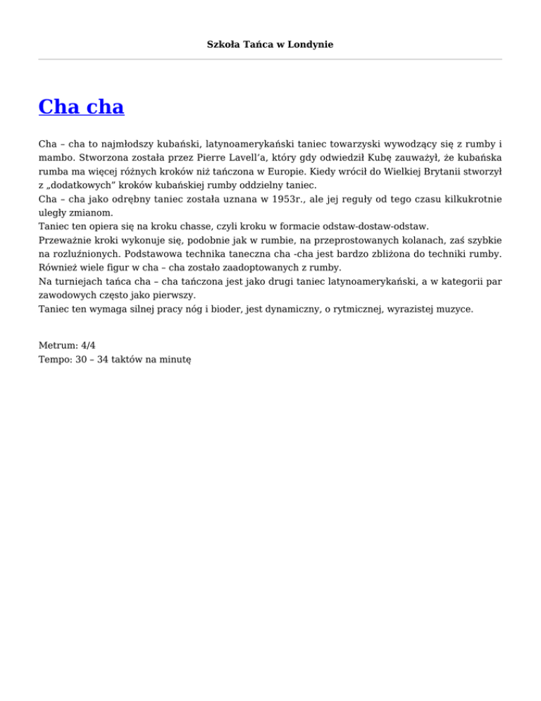 Szkoła Tańca w Londynie Cha cha Cha – cha to najmłodszy kubański, latynoamerykański taniec towarzyski wywodzący się z rumby i mambo. Stworzona została przez Pierre Lavell’a, który gdy odwiedził Kubę zauważył, że kubańska rumba ma więcej różnych kroków niż tańczona w Europie. Kiedy wrócił do Wielkiej Brytanii stworzył z „dodatkowych” kroków kubańskiej rumby oddzielny taniec. Cha – cha jako odrębny taniec została uznana w 1953r., ale jej reguły od tego czasu kilkukrotnie uległy zmianom. Taniec ten opiera się na kroku chasse, czyli kroku w formacie odstaw-dostaw-odstaw. Przeważnie kroki wykonuje się, podobnie jak w rumbie, na przeprostowanych kolanach, zaś szybkie na rozluźnionych. Podstawowa technika taneczna cha -cha jest bardzo zbliżona do techniki rumby. Również wiele figur w cha – cha zostało zaadoptowanych z rumby. Na turniejach tańca cha – cha tańczona jest jako drugi taniec latynoamerykański, a w kategorii par zawodowych często jako pierwszy. Taniec ten wymaga silnej pracy nóg i bioder, jest dynamiczny, o rytmicznej, wyrazistej muzyce. Metrum: 4/4 Tempo: 30 – 34 taktów na minutę