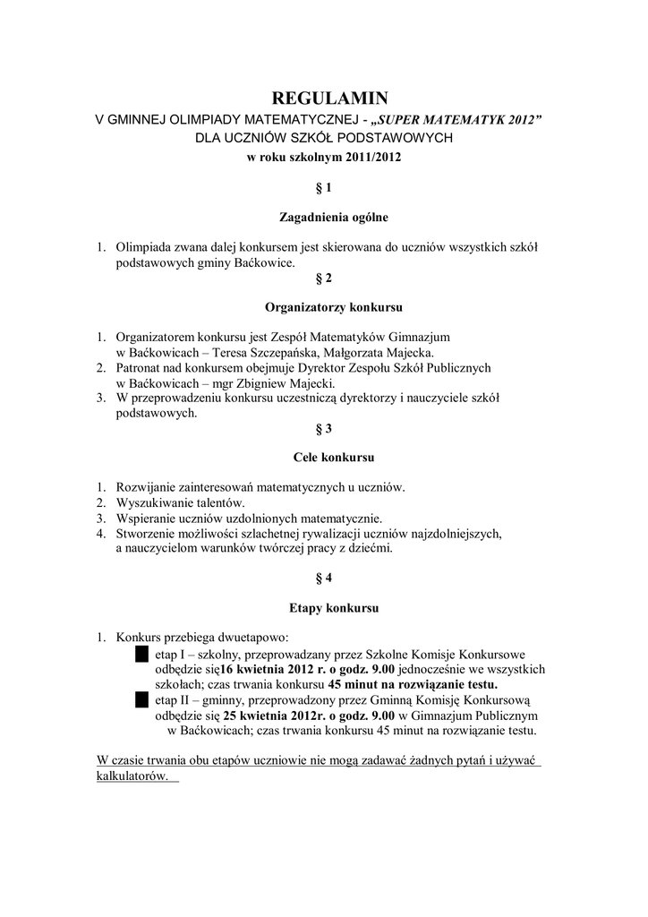 REGULAMIN V GMINNEJ OLIMPIADY MATEMATYCZNEJ - „SUPER MATEMATYK 2012” DLA UCZNIÓW SZKÓŁ PODSTAWOWYCH w roku szkolnym 2011/2012 §1 Zagadnienia ogólne 1. Olimpiada zwana dalej konkursem jest skierowana do uczniów wszystkich szkół podstawowych gminy Baćkowice. §2 Organizatorzy konkursu 1. Organizatorem konkursu jest Zespół Matematyków Gimnazjum w Baćkowicach – Teresa Szczepańska, Małgorzata Majecka. 2. Patronat nad konkursem obejmuje Dyrektor Zespołu Szkół Publicznych w Baćkowicach – mgr Zbigniew Majecki. 3. W przeprowadzeniu konkursu uczestniczą dyrektorzy i nauczyciele szkół podstawowych. §3 Cele konkursu 1. 2. 3. 4. Rozwijanie zainteresowań matematycznych u uczniów. Wyszukiwanie talentów. Wspieranie uczniów uzdolnionych matematycznie. Stworzenie możliwości szlachetnej rywalizacji uczniów najzdolniejszych, a nauczycielom warunków twórczej pracy z dziećmi. §4 Etapy konkursu 1. Konkurs przebiega dwuetapowo: etap I – szkolny, przeprowadzany przez Szkolne Komisje Konkursowe odbędzie się16 kwietnia 2012 r. o godz. 9.00 jednocześnie we wszystkich szkołach; czas trwania konkursu 45 minut na rozwiązanie testu. etap II – gminny, przeprowadzony przez Gminną Komisję Konkursową odbędzie się 25 kwietnia 2012r. o godz. 9.00 w Gimnazjum Publicznym w Baćkowicach; czas trwania konkursu 45 minut na rozwiązanie testu. W czasie trwania obu etapów uczniowie nie mogą zadawać żadnych pytań i używać kalkulatorów. §5 Komisja konkursowa jej zadania i tryb powoływania 1. Szkolna Komisja Konkursowa składa się z dyrektora szkoły oraz dwóch nauczycieli w tym nauczyciela matematyki, powołanych przez dyrektora szkoły. 2. Do zadań Szkolnej Komisji Konkursowej należy: a) zabezpieczenie zestawów zadań do dnia konkursu; b) powielenie w dniu konkursu odpowiedniej liczby zestawów zadań oraz kart odpowiedzi; c) sprawdzenie rozwiązań zgodnie z punktacją; d) sporządzenie protokółu z listą uczestników i liczbą uzyskanych punktów; e) przekazanie protokółu, oraz kart odpowiedzi uczniów, którzy uzyskali co najmniej 60% punktów ( w przypadku gdy żaden z uczniów nie uzyskał 60%, cztery najlepsze wyniki), najpóźniej do dnia 19 marca 2012 r. §6 Zgłoszenia do konkursu 1. Szkoły nie mają obowiązku przesyłać jakiegokolwiek zgłoszenia do konkursu. 2. Przyjmuje się, że każda szkoła jest zgłoszona do konkursu i otrzymuje zestaw zadań, kartę odpowiedzi, regulamin i wzór protokółu. §7 Kryteria kwalifikowania uczestników do II etapu konkursu 1. Udział uczniów w etapie szkolnym jest dobrowolny i powinien wynikać z decyzji ucznia. 2. Szkolna Komisja Konkursowa kwalifikuje do II etapu konkursu wszystkich uczniów, którzy zdobyli, co najmniej 60% możliwych punktów lub czterech najlepszych uczniów ze szkoły, pod warunkiem, że ci uczniowie zdobyli, co najmniej 50% możliwych punktów. §8 Organizacja konkursu 1. Zakres wiedzy i umiejętności na poszczególne etapy konkursu a) Działania na liczbach wymiernych. b) Obliczenia procentowe. c) Podstawowe wiadomości o figurach geometrycznych. 2. Przygotowanie uczniów do konkursu. W obu etapach zakres wiedzy i umiejętności nie wykracza poza Podstawę Programową kształcenia ogólnego. Zalecana literatura: - „Matematyka z wesołym kangurem” 3. Test: - wielokrotnego wyboru. Do każdego zadania proponowane są cztery odpowiedzi, z których każda może być prawdziwa, mogą być prawdziwe trzy odpowiedzi, dwie odpowiedzi, jedna odpowiedź lub może nie być prawdziwej odpowiedzi. - przygotowany jest przez Zespół Matematyków Gimnazjum w Baćkowicach. 4. Odpowiedzi: - uczeń zaznacza wyraźnie odpowiedzi na specjalnej karcie (tzw. karcie odpowiedzi). - uczeń musi być pewny tego, co zaznacza, gdyż raz zaznaczona odpowiedź nie może być już zmieniona. Zabrania się wycierania odpowiedzi i zaznaczania innej. - nie wolno używać korektorów. 5. Punktacja: - uczeń określa, czy dana odpowiedź jest prawdziwa, czy nieprawdziwa. - za poprawne stwierdzenie otrzymuje 1 punkt. - gdy wstrzyma się od odpowiedzi (nie zaznacza żadnego pola), wtedy nie otrzymuje punktu. - jeśli zaznaczy błędnie traci 1 punkt. §9 Nagrody 1. Laureaci V Gminnej Olimpiady Matematycznej „SUPER MATEMATYK” otrzymują dyplomy i nagrody ufundowane przez organizatorów i sponsorów. 2. Dla wszystkich uczestników i nauczycieli przewidziane są dyplomy. Regulamin opracowały: mgr Teresa Szczepańska, mgr Małgorzata Majecka