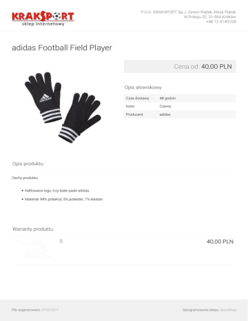 P.H.U. KRAKSPORT Sp.J. Zenon Piętak, Alicja Piętak Al.Pokoju 32, 31-564 Kraków +48 12 4140108 adidas Football Field Player Cena od: 40,00 PLN Opis słownikowy Czas dostawy 48 godzin Kolor Czarny Producent adidas Opis produktu Cechy produktu: Haftowane logo, trzy białe paski adidas. Materiał: 94% poliakryl, 5% poliester, 1% elastan. Warianty produktu S Plik wygenerowano: 07-03-2017 40,00 PLN Oprogramowanie sklepu: AptusShop P.H.U. KRAKSPORT Sp.J. Zenon Piętak, Alicja Piętak Al.Pokoju 32, 31-564 Kraków +48 12 4140108 Plik wygenerowano: 07-03-2017 Powered by TCPDF (www.tcpdf.org) M 40,00 PLN L 40,00 PLN Oprogramowanie sklepu: AptusShop