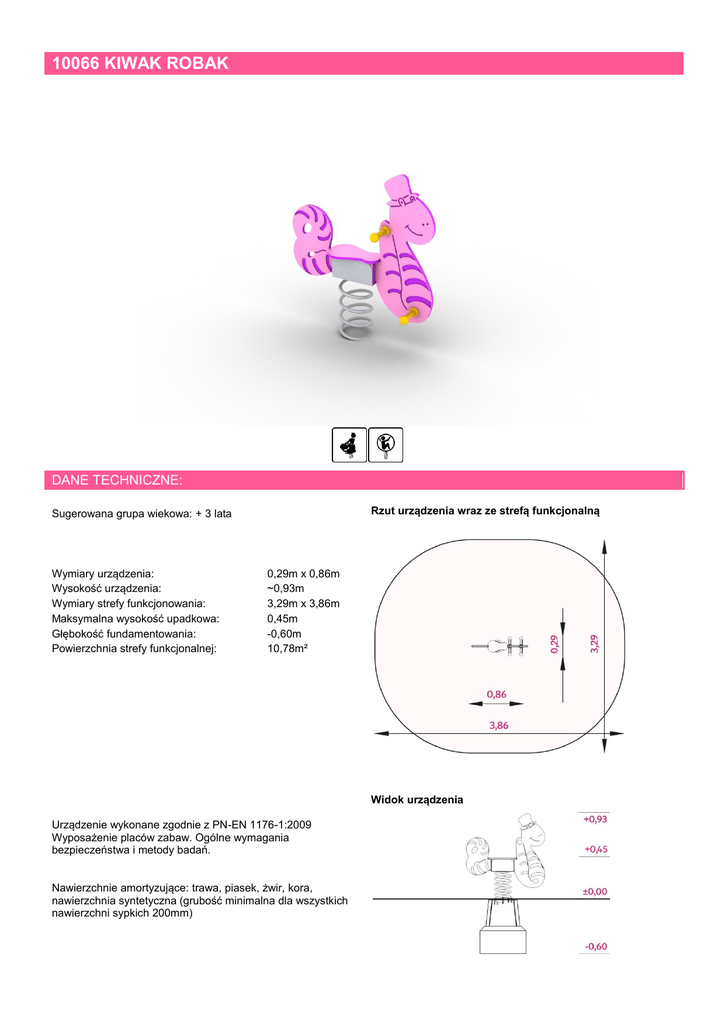 10066 KIWAK ROBAK DANE TECHNICZNE: Rzut urządzenia wraz ze strefą funkcjonalną Sugerowana grupa wiekowa: + 3 lata Wymiary urządzenia: Wysokość urządzenia: Wymiary strefy funkcjonowania: Maksymalna wysokość upadkowa: Głębokość fundamentowania: Powierzchnia strefy funkcjonalnej: 0,29m x 0,86m ~0,93m 3,29m x 3,86m 0,45m -0,60m 10,78m² Widok urządzenia Urządzenie wykonane zgodnie z PN-EN 1176-1:2009 Wyposażenie placów zabaw. Ogólne wymagania bezpieczeństwa i metody badań. Nawierzchnie amortyzujące: trawa, piasek, żwir, kora, nawierzchnia syntetyczna (grubość minimalna dla wszystkich nawierzchni sypkich 200mm) MATERIAŁY: Całość urządzenia: płyty HDPE Uchwyty, podpory na nogi: tworzywo sztuczne Elementy stalowe: stal ocynkowana kąpielowo, malowana proszkowo Sprężyna: stal ocynkowana kąpielowo, malowana proszkowo Zaślepki: tworzywo sztuczne Podstawa fundamentowa: ażurowa konstrukcja stalowa Fundamenty: beton klasy min. B-15 SATERNUS DISTRIBUTION Sp. z o.o. sp. k. ul. Nowa 32 41-500 Chorzów SATERNUS DISTRIBUTION Sp. z o.o. sp. k. zastrzega sobie wszelkie prawa do ochrony praw autorskich na podstawie Ustawy z dnia 04.02.1994 r. o prawie autorskim i prawach pokrewnych ( DZ. U. Nr 28 poz. 83) a zwłaszcza art. 78 i 79 tejże ustawy. Właściciel certyfikatu: Producent: Dystrybutor: GRUPA SATERNUS Sp. z o.o. S. K. A. (następca prawny Place Zabaw Saternus Sp. z o.o.) Saternus Production Sp. z o.o. sp. k. Saternus Distribution Sp. z o.o. sp. k.