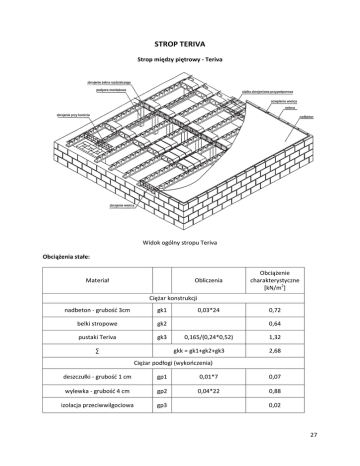STROP TERIVA Strop między piętrowy - Teriva Widok ogólny stropu Teriva Obciążenia stałe: Materiał Obliczenia Obciążenie charakterystyczne [kN/m2] Ciężar konstrukcji nadbeton - grubość 3cm gk1 belki stropowe gk2 pustaki Teriva gk3 ∑ 0,03*24 0,72 0,64 0,165/(0,24*0,52) gkk = gk1+gk2+gk3 1,32 2,68 Ciężar podłogi (wykończenia) deszczułki - grubość 1 cm gp1 0,01*7 0,07 wylewka - grubość 4 cm gp2 0,04*22 0,88 izolacja przeciwwilgociowa gp3 0,02 27 izolacja (styropian) - grubość 3 cm gp4 0,03*0,45 0,0135 tynk - grubość 1,5 cm gp5 0,015*19 0,285 ∑ gpk = gp1+gp2+gp3+gp4+gp5 1,269 Ciężar stropu Gk = gkk + gpk 3,95 Obciążenia zmienne: Kategoria A Obciążenie użytkowe: qk = 2 kN/m2 Całkowite obciążenie stropu między piętrowego: fk = Gk + qk = 3,95 + 2 = 5,95 kN/m2 Przekrój poprzeczny przez strop Teriva 4,0/1 Wymiary pustaka stropu Teriva 4,0/1 28 Najwyższy strop – Teriva Obciążenia stałe: Materiał Obliczenia Obciążenie charakterystyczne [kN/m2] 0,03*24 0,72 Ciężar konstrukcji nadbeton - grubość 3cm gk1 belki stropowe gk2 pustaki Teriva gk3 ∑ 0,64 0,165/(0,24*0,52) gkk = gk1+gk2+gk3 1,32 2,68 Ciężar podłogi (wykończenia) izolacja (styropian) - grubość 16 cm gp1 0,16*0,45 0,072 paroizolacja gp2 wylewka cementowa - grubość 3,5 cm gp3 0,035*22 0,77 tynk - grubość 1,5 cm gp4 0,015*19 0,285 0,02 ∑ gpk = gp1+gp2+gp3+gp4 1,147 Ciężar stropu Gk = gkk + gpk 3,83 Obciążenia zmienne: Obciążenie użytkowe dla poddasza: qk = 1,5 kN/m2 Całkowite obciążenie najwyższego stropu: fk = Gk + qk = 3,83 + 1,5 = 5,33 kN/m2 29 STROP KLEINA Płyta ceglana półciężka z żeberkami Obciążenie: Materiał Obliczenia Obciążenie charakterystyczne [kN/m2] Ciężar konstrukcji płyta ceglana - typ półciężki gk1 (0,065+(0,15/0,44)*0,055)*18 1,508 wypełnienie - keramzyt gk2 (0,08+(0,29/0,44)*0,055)*12 1,395 belki stalowe I200 gk3 0,263/1,3 0,202 legary - wysokość 6 cm (2sztuki między belkami) gk4 2*0,06*0,063*4,6/1,3 0,027 ∑ gkk = gk1+gk2+gk3+gk4 3,132 Ciężar podłogi (wykończenia) deski - grubość 2,5 cm gp1 0,025*4,6 0,115 papier podłogowy gp2 deszczułki podłogowe grubość 1cm gp3 0,01*7 0,07 tynk cementowo-wapienny grubość 1,5 cm gp4 0,015*19 0,285 0,02 ∑ gpk = gp1+gp2+gp3+gp4 0,49 Ciężar stropu Gk 3,622 30 Obciążenie zmienne użytkowe – kategoria użytkowania A: qk = 2 kN/m2 Całkowite obciążenie stropu: fk = Gk + qk = 3,622 + 2 = 5,622 kN/m2 Nośność płyty ceglanej stropu Kleina Materiały: cegła ceramiczna pełna (25 x 12 x 6,5 cm): f b = 10 M Pa (grupa 1 elementów murowych) zaprawa cementowo – wapienna M2,5: f m = 2,5 M Pa wytrzymałość charakterystyczna płyty na ściskanie: f k = 3 M Pa (wg EC6-3: Tablica NA.3) kategoria produkcji elementów murowych (cegły) I: γ m = 2,2 (wg EC6: Tablica NA.1) zaprawa przepisana klasa wykonania robót B f d = f k / γ m = 3/2,2 = 1,36 M Pa Materiał belek: Stal S275, dla której: fy = 275 M Pa (wg EC3: Tablica 3.1) Nośność płyty ceglanej zbrojonej Rozpiętość płyty jest równa rozstawowi belek stalowych: l = 1,3 m 31 Kombinacja oddziaływań: Rodzaj obciążenia Obciążenie charakterystyczne [kN/m] Obciążenie stałe 3,622 1,35 1,15 4,889 4,165 Obciążenie zmienne 2 1,05 1,5 2,100 3,000 qd 6,989 7,165 Współczynnik obciążenia ∑ Obciążenie obliczeniowe [kN/m] M sd = M max = qd * l2/8 = 7,165 kN/m * (1,3 m)2 / 8 = 1,514 kNm Przyjmuję zbrojenie bednarką (płaskownikiem): 1 x 20 mm Zbrojenie w jednym żebrze: As1 = 3 * 0,1 cm * 2 cm = 0,6 cm2 Zbrojenie w płycie o szerokości 1m: As = As1 * 100/a = 0,6*100/44 = 1,364 cm2/m b = b1 * 100/a = 15*100/44 = 34,09 cm/m d = 12 – (1+2/2) = 10 cm – odległość od skrajnych włókien ściskanych do środka bednarki z = d*[1 – 0,5*(As*fyd)/(b*d*fd)] = 10*[1-0,5*(1,364*19)/(34,09*10*0,136)]=7,213 cm < 0,9d=9 cm Nośność płyty: M Rd1 = fyd*As*z = 19*1,364*0,07213 = 1,869 kNm > Mmax = 1,514 kNm M Rd2 = 0,4*fd*b*d2 = 0,4*0,136*34,09*102 = 1,860 kNm ≈ M Rd1 > Mmax = 1,514 kNm 32 BELKA STALOWA STROPU KLEINA Rozpiętość obliczeniowa: ls = 6 m – rozpiętość w świetle ścian nośnych l o = 1,05 * 6 = 6,3 m Rozstaw belek: l = 1,3 m Obciążenie charakterystyczne działające na belkę Kombinacja oddziaływań: qd2=qd*l=7,165*1,3=9,314 kN/m Materiał: Stal S275, dla której: fy=275 M Pa, E = 210 G Pa, G = 81 G Pa (wg EC3: Tablica 3.1 i pkt. 3.2.6) RA = RB = 0,5*lo*qd2 = 0,5*6,3*9,314 = 29,34 kN MyED = Mmax = qd2*lo2 /8 = 9,314 * (6,3)2 /8 = 46,21 kNm Me,Rd = M pl,Rd = Wpl * fy / γMo γMo = 1,00 Wpl = Me,Rd* γMo/fd = 4621 kNcm/ 27,5 kN/cm2 = 168,037 cm3 Przyjmuję belkę IPE200, dla której: Wy = 194 cm3 I y = 1940 cm4 Stan graniczny użytkowalności Ugięcie graniczne: = 250 = 630 = 2,52 250 33 Kombinacja oddziaływań: Stałe: gk = 3,622*1,3 = 4,708 kN/m Zmienne: pk = 2,0*1,3 = 2,600 kN/m Obciążenie: qk = gk + pk = 4,708 + 2,6 = 7,308 kN/m Ugięcie końcowe: = 5 ∗ 384 ∗ ∗ = 5 0,07308 ∗ 630 ∗ = 3,68 384 21000 ∗ 1940 > , = 2,52 , = 2,52 Warunek nie jest spełniony, dlatego przyjmuję belkę IPE240, dla której: Wy = 324 cm3 Iy = 3890 cm4 Stan graniczny użytkowalności Ugięcie graniczne: = 250 = 630 = 2,52 250 Kombinacja oddziaływań: Stałe: gk = 3,622*1,3=4,708 kN/m Zmienne: pk = 2,0*1,3 = 2,600 kN/m Obciążenie: qk = gk + pk = 4,708 + 2,6 = 7,308 kN/m = 5 ∗ 384 ∗ ∗ = 5 0,07308 ∗ 630 ∗ = 1,84 384 21000 ∗ 3890 < SPRAWDZENIE BELKI POD ŚCIANĄ DZIAŁOWĄ Ciężar 1m2 ścianki działowej (z betonu komórkowego t=12 cm): qk’ = 9,0*0,08+0,5+0,03*19,0 = 1,79 kN/m2 Obciążenie charakterystyczne działające na belkę: Stałe: gk = 4,708 kN/m Zmienne: pk = 2,6 + 1,79*2,78 = 7,576 kN/m 34 hs = 2,78 m – wysokość ścianki działowej Kombinacja oddziaływań: qd3 = qd*l +qk’*hs*1,5 = 7,165*1,3+1,79*2,78*1,5 = 16,78 kN/m Moment maksymalny: ! ,"# = !$%& = ∗ 8 #' ( = 16,78 ∗ 630( = 83,24)* 8 Wskaźnik plastyczny: +,- = !$%& 8324)* = = 302,70 )* . 27,5 ( ' Przyjmuję belkę 2IPE2