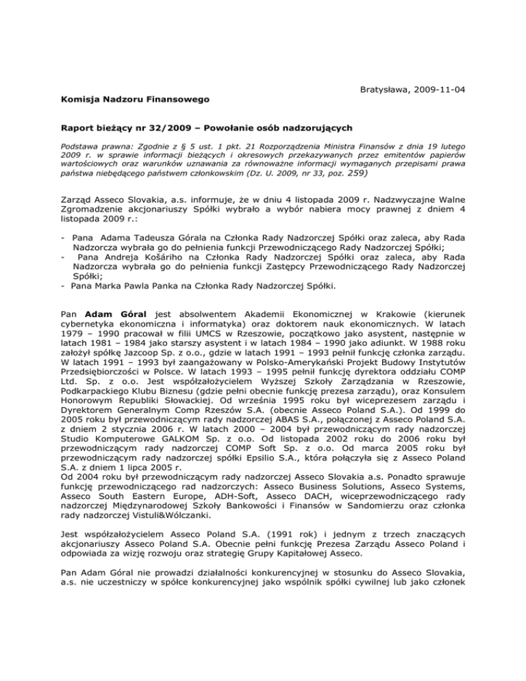 Bratysława, 2009-11-04 Komisja Nadzoru Finansowego Raport bieŜący nr 32/2009 – Powołanie osób nadzorujących Podstawa prawna: Zgodnie z § 5 ust. 1 pkt. 21 Rozporządzenia Ministra Finansów z dnia 19 lutego 2009 r. w sprawie informacji bieŜących i okresowych przekazywanych przez emitentów papierów wartościowych oraz warunków uznawania za równowaŜne informacji wymaganych przepisami prawa państwa niebędącego państwem członkowskim (Dz. U. 2009, nr 33, poz. 259) Zarząd Asseco Slovakia, a.s. informuje, Ŝe w dniu 4 listopada 2009 r. Nadzwyczajne Walne Zgromadzenie akcjonariuszy Spółki wybrało a wybór nabiera mocy prawnej z dniem 4 listopada 2009 r.: - Pana Adama Tadeusza Górala na Członka Rady Nadzorczej Spółki oraz zaleca, aby Rada Nadzorcza wybrała go do pełnienia funkcji Przewodniczącego Rady Nadzorczej Spółki; Pana Andreja Košáriho na Członka Rady Nadzorczej Spółki oraz zaleca, aby Rada Nadzorcza wybrała go do pełnienia funkcji Zastępcy Przewodniczącego Rady Nadzorczej Spółki; - Pana Marka Pawla Panka na Członka Rady Nadzorczej Spółki. Pan Adam Góral jest absolwentem Akademii Ekonomicznej w Krakowie (kierunek cybernetyka ekonomiczna i informatyka) oraz doktorem nauk ekonomicznych. W latach 1979 – 1990 pracował w filii UMCS w Rzeszowie, początkowo jako asystent, następnie w latach 1981 – 1984 jako starszy asystent i w latach 1984 – 1990 jako adiunkt. W 1988 roku załoŜył spółkę Jazcoop Sp. z o.o., gdzie w latach 1991 – 1993 pełnił funkcję członka zarządu. W latach 1991 – 1993 był zaangaŜowany w Polsko-Amerykański Projekt Budowy Instytutów Przedsiębiorczości w Polsce. W latach 1993 – 1995 pełnił funkcję dyrektora oddziału COMP Ltd. Sp. z o.o. Jest współzałoŜycielem WyŜszej Szkoły Zarządzania w Rzeszowie, Podkarpackiego Klubu Biznesu (gdzie pełni obecnie funkcję prezesa zarządu), oraz Konsulem Honorowym Republiki Słowackiej. Od września 1995 roku był wiceprezesem zarządu i Dyrektorem Generalnym Comp Rzeszów S.A. (obecnie Asseco Poland S.A.). Od 1999 do 2005 roku był przewodniczącym rady nadzorczej ABAS S.A., połączonej z Asseco Poland S.A. z dniem 2 stycznia 2006 r. W latach 2000 – 2004 był przewodniczącym rady nadzorczej Studio Komputerowe GALKOM Sp. z o.o. Od listopada 2002 roku do 2006 roku był przewodniczącym rady nadzorczej COMP Soft Sp. z o.o. Od marca 2005 roku był przewodniczącym rady nadzorczej spółki Epsilio S.A., która połączyła się z Asseco Poland S.A. z dniem 1 lipca 2005 r. Od 2004 roku był przewodniczącym rady nadzorczej Asseco Slovakia a.s. Ponadto sprawuje funkcję przewodniczącego rad nadzorczych: Asseco Business Solutions, Asseco Systems, Asseco South Eastern Europe, ADH-Soft, Asseco DACH, wiceprzewodniczącego rady nadzorczej Międzynarodowej Szkoły Bankowości i Finansów w Sandomierzu oraz członka rady nadzorczej Vistuli&Wólczanki. Jest współzałoŜycielem Asseco Poland S.A. (1991 rok) i jednym z trzech znaczących akcjonariuszy Asseco Poland S.A. Obecnie pełni funkcję Prezesa Zarządu Asseco Poland i odpowiada za wizję rozwoju oraz strategię Grupy Kapitałowej Asseco. Pan Adam Góral nie prowadzi działalności konkurencyjnej w stosunku do Asseco Slovakia, a.s. nie uczestniczy w spółce konkurencyjnej jako wspólnik spółki cywilnej lub jako członek organu władz spółki kapitałowej oraz nie uczestniczy w innej konkurencyjnej osobie prawnej jako członek jej organu. Pan Adam Góral nie został wpisany do Rejestru DłuŜników Niewypłacalnych prowadzonego na podstawie Ustawy o Krajowym Rejestrze Sądowym. Pan Andrej Košári ukończył Słowacki Uniwersytet Techniczny w Bratysławie, Wydział InŜynierii Elektrycznej. Uzyskał równieŜ dyplom w zakresie komunikacji elektronicznej w EDV Schule Siemens AG Muenchen. Od 1973 do 1979 pracował jako technik w Siemens computers. W 1979 rozpoczął pracę dla Narodowego Banku Słowacji na stanowisku Dyrektora Departamentu InŜynierii Układowej. Pozostał na tym stanowisku do roku 1990, kiedy został Zastępcą Dyrektora Generalnego w Centrali Post Bank, a.s. Od 1990 był Przewodniczącym Rady Nadzorczej ASSET, a.s. a w latach 1992-1999 był Dyrektorem Zarządzającym ASSET, spol s.r.o. Pan Andrej Košári był zastępcą Przewodniczącego Rady Nadzorczej od 29 listopada 2004. Pan Andrej Košári nie prowadzi działalności konkurencyjnej w stosunku do Asseco Slovakia, a.s. nie uczestniczy w spółce konkurencyjnej jako wspólnik spółki cywilnej lub jako członek organu władz spółki kapitałowej oraz nie uczestniczy w innej konkurencyjnej osobie prawnej jako członek jej organu. Pan Andrej Košári nie został wpisany do Rejestru DłuŜników Niewypłacalnych prowadzonego na podstawie Ustawy o Krajowym Rejestrze Sądowym. Pan Marek Panek jest absolwentem Wydziału Budowy Maszyn i Lotnictwa Politechniki Rzeszowskiej. W latach 1993 – 1995 był zatrudniony w Zakładzie Elektroniki Gantel Sp. z o.o. W roku 1995 rozpoczął pracę jako specjalista ds. Marketingu w COMP Ltd. Sp. z o.o. Oddział w Rzeszowie. W latach 1998 – 1999 pełnił funkcję Prezesa Zarządu COMP Soft Sp. z o.o. z siedzibą w Rzeszowie. W latach 2001 – 2003 pełnił funkcję członka rady nadzorczej ARMA Sp. z o.o. W Asseco Poland S.A. pracuje od 1995 roku kolejno na stanowiskach Specjalisty ds. Marketingu (1995–1996), Dyrektora ds. Marketingu Asseco (1996–marca 2003), Dyrektora Działu SprzedaŜy i Marketingu (2003–2004), Członka Zarządu i Dyrektora Działu SprzedaŜy i Marketingu . Obecnie pełni funkcję Wiceprezesa Zarządu, odpowiada za: Dział Koordynacji SprzedaŜy i Współpracy z Partnerami, Dział PR i Relacji Inwestorskich, Dział Marketingu, Dział Logistyki, Biuro Projektów Unijnych. Ponadto jest Prezesem Zarządu Asseco DACH SA oraz Członkiem Rady Nadzorczej Logos i Arbor. Pan Marek Panek nie prowadzi działalności konkurencyjnej w stosunku do Asseco Slovakia, a.s. nie uczestniczy w spółce 