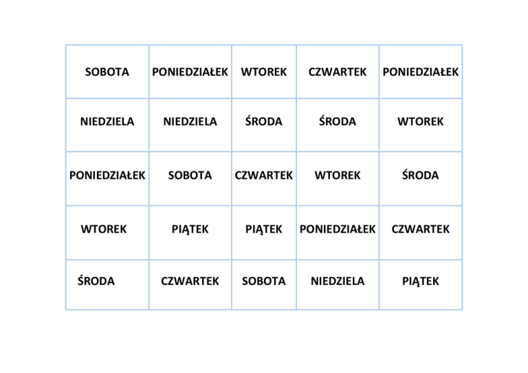 SOBOTA PONIEDZIAŁEK WTOREK CZWARTEK PONIEDZIAŁEK NIEDZIELA NIEDZIELA ŚRODA ŚRODA WTOREK PONIEDZIAŁEK SOBOTA CZWARTEK WTOREK ŚRODA WTOREK PIĄTEK PIĄTEK PONIEDZIAŁEK CZWARTEK CZWARTEK SOBOTA NIEDZIELA PIĄTEK ŚRODA