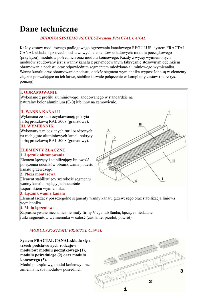 Dane techniczne BUDOWA SYSTEMU REGULUS-system FRACTAL CANAL Każdy zestaw modułowego podłogowego ogrzewania kanałowego REGULUS -system FRACTAL CANAL składa się z trzech podstawowych elementów składowych: modułu początkowego (przyłącza), modułów pośrednich oraz modułu końcowego. Każdy z wyżej wymienionych modułów zbudowany jest z wanny kanału z przymocowanym fabrycznie stosownym odcinkiem obramowania podestu oraz odpowiednim segmentem miedziano-aluminiowego wymiennika. Wanna kanału oraz obramowanie podestu, a także segment wymiennika wyposażone są w elementy złączne pozwalające na ich łatwe, stabilne i trwałe połączenie w kompletny zestaw (patrz rys. poniżej). I. OBRAMOWANIE Wykonane z profilu aluminiowego; anodowanego w standardzie na naturalny kolor aluminium (C-0) lub inny na zamówienie. II. WANNA KANAŁU Wykonana ze stali ocynkowanej; pokryta farbą proszkową RAL 5008 (granatowy). III. WYMIENNIK Wykonany z miedzianych rur i osadzonych na nich gęsto aluminiowych lamel; pokryty farbą proszkową RAL 5008 (granatowy). ELEMENTY ZŁĄCZNE 1. Łącznik obramowania Element łączący i stabilizujący liniowość połączenia odcinków obramowania podestu kanału grzewczego. 2. Płoza montażowa Element stabilizujący szerokość segmentu wanny kanału, będący jednocześnie wspornikiem wymiennika. 3. Łącznik wanny kanału Element łączący poszczególne segmenty wanny kanału grzewczego oraz stabilizacja liniowa wymiennika. 4. Mufa łączeniowa Zaprasowywane mechanicznie mufy firmy Viega lub Sanha, łączące miedziane rurki segmentów wymiennika w całość (zasilanie, przelot, powrót). MODUŁY SYSTEMU FRACTAL CANAL System FRACTAL CANAL składa się z trzech podstawowych rodzajów modułów: modułu początkowego (1), modułu pośredniego (2) oraz modułu końcowego (3). Moduł początkowy, moduł końcowy oraz zmienna liczba modułów pośrednich tworzą kompletne zestawy kanałów grzewczych o łatwej do obliczenia, określonej długości i mocy grzewczej. MODUŁ POCZĄTKOWY (zasilający) Segment wanny wraz obramowaniem podestu o długości całkowitej 400 mm, z zabudowanym modułem wymiennika posiadającym przyłącze instalacyjne GW 3/4” oraz odpowietrznik. Z drugiej strony wymiennik zakończony jest kikutami rur (DN 15). Moduły początkowe: - dla typu DUO 100 – oznaczenie – DS040 - dla typu QUATTRO 150 – oznaczenie – QS040 MODUŁ POŚREDNI (przelotowy) Segment wanny wraz z obramowania podestu występujący w czterech długościach. Zainstalowany w module pośrednim człon wymiennika posiada ze swojego jednego końca fabrycznie zaprasowane mufy złączne firmy Viega (292 690) lub opcjonalnie Sanha, natomiast ze swojego drugiego końca kikuty rury (DN15), na które są nasuwane mufy złączne kolejnego członu wymiennika. Moduły pośrednie dla typu DUO 100 (długość całkowita) oznaczenie: - DM060 – 600 mm - DM080 – 800 mm - DM100 – 1000 mm - DM120 – 1200 mm Moduły pośrednie dla typu QUATTRO 150 (długość całkowita) oznaczenie: - QM060 – 600 mm - QM080 – 800 mm - QM100 – 1000 mm - QM120 – 1200 mm
