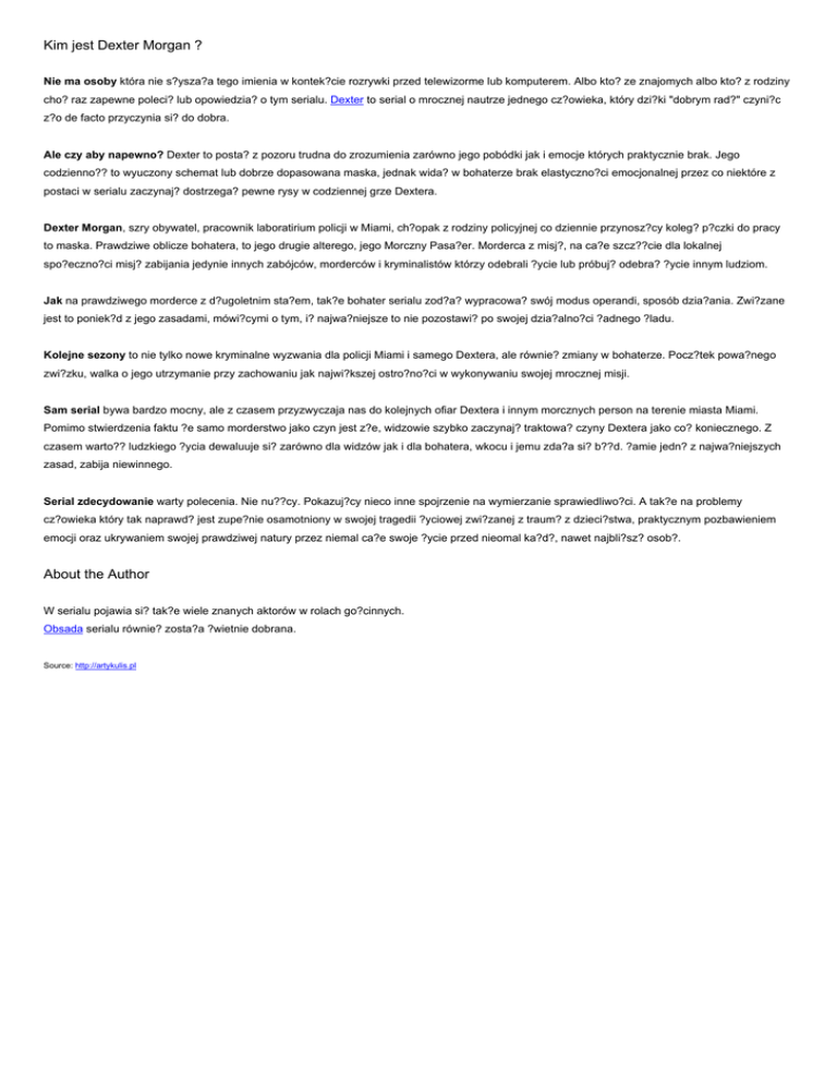Kim jest Dexter Morgan ? Nie ma osoby która nie s?ysza?a tego imienia w kontek?cie rozrywki przed telewizorme lub komputerem. Albo kto? ze znajomych albo kto? z rodziny cho? raz zapewne poleci? lub opowiedzia? o tym serialu. Dexter to serial o mrocznej nautrze jednego cz?owieka, który dzi?ki "dobrym rad?" czyni?c z?o de facto przyczynia si? do dobra. Ale czy aby napewno? Dexter to posta? z pozoru trudna do zrozumienia zarówno jego pobódki jak i emocje których praktycznie brak. Jego codzienno?? to wyuczony schemat lub dobrze dopasowana maska, jednak wida? w bohaterze brak elastyczno?ci emocjonalnej przez co niektóre z postaci w serialu zaczynaj? dostrzega? pewne rysy w codziennej grze Dextera. Dexter Morgan, szry obywatel, pracownik laboratirium policji w Miami, ch?opak z rodziny policyjnej co dziennie przynosz?cy koleg? p?czki do pracy to maska. Prawdziwe oblicze bohatera, to jego drugie alterego, jego Morczny Pasa?er. Morderca z misj?, na ca?e szcz??cie dla lokalnej spo?eczno?ci misj? zabijania jedynie innych zabójców, morderców i kryminalistów którzy odebrali ?ycie lub próbuj? odebra? ?ycie innym ludziom. Jak na prawdziwego morderce z d?ugoletnim sta?em, tak?e bohater serialu zod?a? wypracowa? swój modus operandi, sposób dzia?ania. Zwi?zane jest to poniek?d z jego zasadami, mówi?cymi o tym, i? najwa?niejsze to nie pozostawi? po swojej dzia?alno?ci ?adnego ?ladu. Kolejne sezony to nie tylko nowe kryminalne wyzwania dla policji Miami i samego Dextera, ale równie? zmiany w bohaterze. Pocz?tek powa?nego zwi?zku, walka o jego utrzymanie przy zachowaniu jak najwi?kszej ostro?no?ci w wykonywaniu swojej mrocznej misji. Sam serial bywa bardzo mocny, ale z czasem przyzwyczaja nas do kolejnych ofiar Dextera i innym morcznych person na terenie miasta Miami. Pomimo stwierdzenia faktu ?e samo morderstwo jako czyn jest z?e, widzowie szybko zaczynaj? traktowa? czyny Dextera jako co? koniecznego. Z czasem warto?? ludzkiego ?ycia dewaluuje si? zarówno dla widzów jak i dla bohatera, wkocu i jemu zda?a si? b??d. ?amie jedn? z najwa?niejszych zasad, zabija niewinnego. Serial zdecydowanie warty polecenia. Nie nu??cy. Pokazuj?cy nieco inne spojrzenie na wymierzanie sprawiedliwo?ci. A tak?e na problemy cz?owieka który tak naprawd? jest zupe?nie osamotniony w swojej tragedii ?yciowej zwi?zanej z traum? z dzieci?stwa, praktycznym pozbawieniem emocji oraz ukrywaniem swojej prawdziwej natury przez niemal ca?e swoje ?ycie przed nieomal ka?d?, nawet najbli?sz? osob?. About the Author W serialu pojawia si? tak?e wiele znanych aktorów w rolach go?cinnych. Obsada serialu równie? zosta?a ?wietnie dobrana. Source: http://artykulis.pl