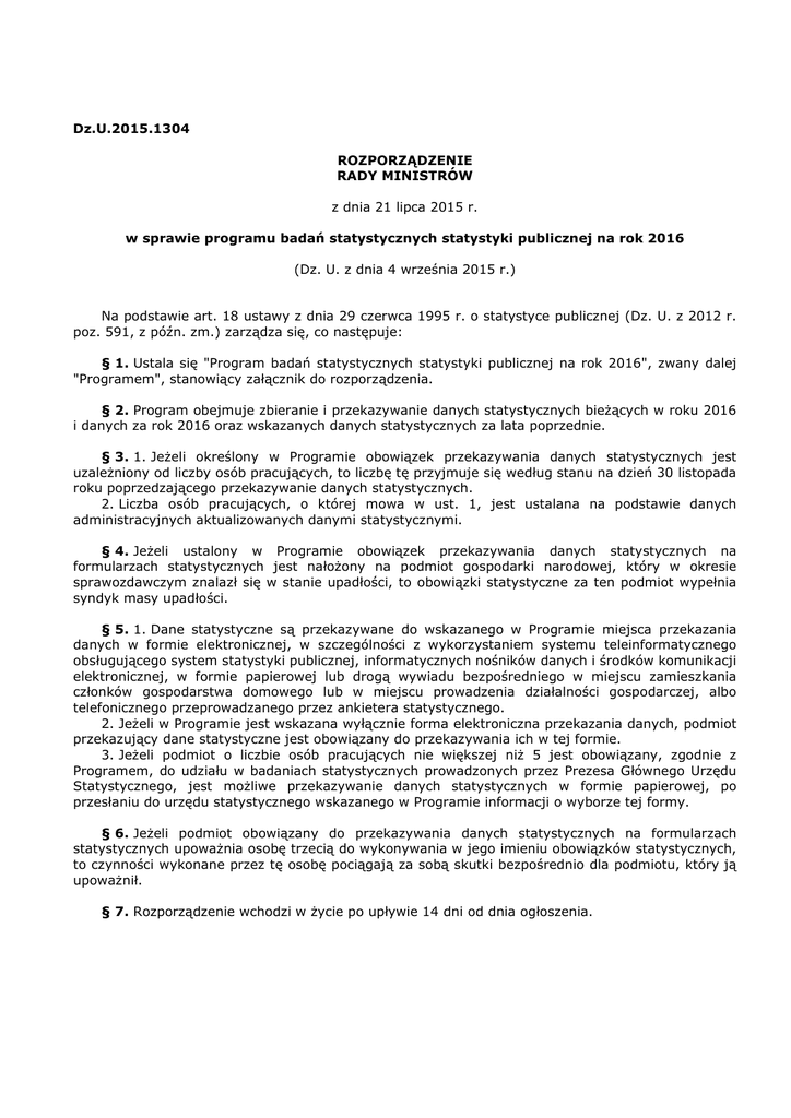 Dz.U.2015.1304 ROZPORZĄDZENIE RADY MINISTRÓW z dnia 21 lipca 2015 r. w sprawie programu badań statystycznych statystyki publicznej na rok 2016 (Dz. U. z dnia 4 września 2015 r.) Na podstawie art. 18 ustawy z dnia 29 czerwca 1995 r. o statystyce publicznej (Dz. U. z 2012 r. poz. 591, z późn. zm.) zarządza się, co następuje: § 1. Ustala się "Program badań statystycznych statystyki publicznej na rok 2016", zwany dalej "Programem", stanowiący załącznik do rozporządzenia. § 2. Program obejmuje zbieranie i przekazywanie danych statystycznych bieżących w roku 2016 i danych za rok 2016 oraz wskazanych danych statystycznych za lata poprzednie. § 3. 1. Jeżeli określony w Programie obowiązek przekazywania danych statystycznych jest uzależniony od liczby osób pracujących, to liczbę tę przyjmuje się według stanu na dzień 30 listopada roku poprzedzającego przekazywanie danych statystycznych. 2. Liczba osób pracujących, o której mowa w ust. 1, jest ustalana na podstawie danych administracyjnych aktualizowanych danymi statystycznymi. § 4. Jeżeli ustalony w Programie obowiązek przekazywania danych statystycznych na formularzach statystycznych jest nałożony na podmiot gospodarki narodowej, który w okresie sprawozdawczym znalazł się w stanie upadłości, to obowiązki statystyczne za ten podmiot wypełnia syndyk masy upadłości. § 5. 1. Dane statystyczne są przekazywane do wskazanego w Programie miejsca przekazania danych w formie elektronicznej, w szczególności z wykorzystaniem systemu teleinformatycznego obsługującego system statystyki publicznej, informatycznych nośników danych i środków komunikacji elektronicznej, w formie papierowej lub drogą wywiadu bezpośredniego w miejscu zamieszkania członków gospodarstwa domowego lub w miejscu prowadzenia działalności gospodarczej, albo telefonicznego przeprowadzanego przez ankietera statystycznego. 2. Jeżeli w Programie jest wskazana wyłącznie forma elektroniczna przekazania danych, podmiot przekazujący dane statystyczne jest obowiązany do przekazywania ich w tej formie. 3. Jeżeli podmiot o liczbie osób pracujących nie większej niż 5 jest obowiązany, zgodnie z Programem, do udziału w badaniach statystycznych prowadzonych przez Prezesa Głównego Urzędu Statystycznego, jest możliwe przekazywanie danych statystycznych w formie papierowej, po przesłaniu do urzędu statystycznego wskazanego w Programie informacji o wyborze tej formy. § 6. Jeżeli podmiot obowiązany do przekazywania danych statystycznych na formularzach statystycznych upoważnia osobę trzecią do wykonywania w jego imieniu obowiązków statystycznych, to czynności wykonane przez tę osobę pociągają za sobą skutki bezpośrednio dla podmiotu, który ją upoważnił. § 7. Rozporządzenie wchodzi w życie po upływie 14 dni od dnia ogłoszenia. 1.29. ZDROWIE I OCHRONA ZDROWIA 1. 2. 3. 4. 5. Symbol badania: 1.29.03(095) Temat badania: Hospitalizacja Rodzaj badania: Badanie stałe Prowadzący badanie: Minister właściwy do spraw zdrowia Cel badania Badanie jest źródłem informacji o przyczynach hospitalizacji, stosowanych procedurach oraz długości hospitalizacji dla wszystkich osób leczonych w szpitalach bez względu na ich status ubezpieczenia i miejsce zamieszkania w kraju lub za granicą. Dostarcza ono informacji o poszczególnych pacjentach z uwzględnieniem ich charakterystyki demograficzno społecznej, a jego wyniki są wykorzystywane w sektorze zdrowia na potrzeby planowania i analiz opieki szpitalnej, a także ocen stanu zdrowia ludności i zaspokojenia potrzeb zdrowotnych. Dane są przekazywane również do organizacji międzynarodowych (Eurostat, OECD, WHO). Zakres podmiotowy Podmioty wykonujące działalność leczniczą udzielające stacjonarnych i całodobowych świadczeń zdrowotnych. Zakres przedmiotowy Osoby chore leczone w podmiotach wykonujących działalność leczniczą udzielających stacjonarnych i całodobowych świadczeń zdrowotnych według przyczyn, płci, wieku, długości pobytu, miejsca leczenia, miejsca zamieszkania, a ponadto w karcie psychiatrycznej według wykształcenia, źródła utrzymania, stopnia niepełnosprawności, rodzaju opieki. Do kodowania jednostek chorobowych stosuje się Międzynarodową Klasyfikację Chorób i Problemów Zdrowotnych Rewizja 10. Do kodowania procedur medycznych stosuje się Międzynarodową Klasyfikację Procedur Medycznych. Źródła danych Indywidualne karty statystyczne MZ: MZ/Szp-11 i MZ/Szp-11B. Dane z systemów informatycznych szpitali. 6. 7. 8. Lp. Podmioty przekazujące dane statystyczne Forma przekazania danych Częstotliwość i termin 8.0 8.1 8.2 8.3 1 szpitale - przedsiębiorstwa podmiotu leczniczego, w których podmiot wykonuje działalność leczniczą w rodzaju świadczenie szpitalne, w tym samodzielne publiczne zakłady opieki zdrowotnej MSW, z wyjątkiem szpitali i oddziałów psychiatrycznych, stacji dializ, zakładów/oddziałów pielęgnacyjno-opiekuńczych, zakładów/oddziałów pielęgnacyjno-opiekuńczych psychiatrycznych, zakładów/oddziałów opiekuńczo-leczniczych, zakładów/oddziałów opiekuńczo-leczniczych psychiatrycznych, hospicjów stacjonarnych, oddziałów medycyny paliatywnej zakładów/oddziałów dziennych pielęgnacyjno-opiekuńczych psychiatrycznych, zakładów/oddziałów dziennych opiekuńczo-leczniczych psychiatrycznych, zespołów MZ/Szp-11 - karta statystyczna szpitalna ogólna; w formie elektronicznej; metoda pełna; obowiązkowe raz w miesiącu do 20 dni po okresie sprawozdawczym Miejsce przekazania danych 8.4 komórka właściwa w sprawach statystyki medycznej wskazana przez wojewodę, Narodowy Instytut Zdrowia Publicznego - Państwowy Zakład Higieny (część, lub wszystkie szpitale w województwie, odpowiednio do decyzji kierownika komórki właściwej w sprawach statystyki medycznej). opieki domowej przy zakładzie/oddziale pielęgnacyjno-opiekuńczym, szpitali uzdrowiskowych, szpitali uzdrowiskowyc