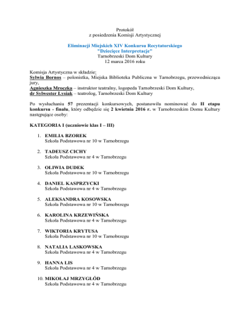 Protokół z posiedzenia Komisji Artystycznej Eliminacji Miejskich XIV Konkursu Recytatorskiego "Dziecięce Interpretacje" Tarnobrzeski Dom Kultury 12 marca 2016 roku Komisja Artystyczna w składzie: Sylwia Bornos – polonistka, Miejska Biblioteka Publiczna w Tarnobrzegu, przewodnicząca jury, Agnieszka Mroczka – instruktor teatralny, logopeda Tarnobrzeski Dom Kultury, dr Sylwester Łysiak – teatrolog, Tarnobrzeski Dom Kultury Po wysłuchaniu 57 prezentacji konkursowych, postanowiła nominować do II etapu konkursu - finału, który odbędzie się 2 kwietnia 2016 r. w Tarnobrzeskim Domu Kultury następujące osoby: KATEGORIA I (uczniowie klas I – III) 1. EMILIA BZOREK Szkoła Podstawowa nr 10 w Tarnobrzegu 2. TADEUSZ CICHY Szkoła Podstawowa nr 4 w Tarnobrzegu 3. OLIWIA DUDEK Szkoła Podstawowa nr 10 w Tarnobrzegu 4. DANIEL KASPRZYCKI Szkoła Podstawowa nr 4 w Tarnobrzegu 5. ALEKSANDRA KOSOWSKA Szkoła Podstawowa nr 10 w Tarnobrzegu 6. KAROLINA KRZEWIŃSKA Szkoła Podstawowa nr 4 w Tarnobrzegu 7. WIKTORIA KRYTUSA Szkoła Podstawowa nr 10 w Tarnobrzegu 8. NATALIA LASKOWSKA Szkoła Podstawowa nr 4 w Tarnobrzegu 9. HANNA LIS Szkoła Podstawowa nr 4 w Tarnobrzegu 10. MIKOŁAJ MRZYGŁÓD Szkoła Podstawowa nr 4 w Tarnobrzegu 11. GABRIELA OLENIACZ Szkoła Podstawowa nr 10 w Tarnobrzegu 12. MAJA PIOTROWSKA Szkoła Podstawowa nr 10 w Tarnobrzegu 13. BARTOSZ RĘKAS Szkoła Podstawowa nr 4 w Tarnobrzegu 14. MAŁGORZATA ZAJĄC Szkoła Podstawowa nr 10 w Tarnobrzegu KATEGORIA I (uczniowie klas IV– VI) 1. WIKTORIA DEREŃ Szkoła Podstawowa nr 4 w Tarnobrzegu 2. GABRIELA HOMAROWICZ Społeczna Szkoła Podstawowa im. Małego Księcia w Tarnobrzegu 3. ALEKSANDRA JABŁOŃSKA Szkoła Podstawowa nr 8 w Tarnobrzegu 4. MICHAŁ KOSTĘPSKI Szkoła Podstawowa nr 4 w Tarnobrzegu 5. KACPER MASZKOWSKI Społeczna Szkoła Podstawowa im. Małego Księcia w Tarnobrzegu 6. KATARZYNA MAZURKIEWICZ Szkoła Podstawowa nr 10 w Tarnobrzegu 7. MIŁOSZ MUREK Szkoła Podstawowa nr 4 w Tarnobrzegu 8. DOMINIKA SOBOL Społeczna Szkoła Podstawowa im. Małego Księcia w Tarnobrzegu 9. MATEUSZ SAMCZAK Szkoła Podstawowa nr 10 w Tarnobrzegu 10. NATALIA URA Szkoła Podstawowa nr 4 w Tarnobrzegu 11. KATARZYNA ZARZYCKA Szkoła Podstawowa nr 3 w Tarnobrzegu Komisja Artystyczna składa podziękowanie uczestnikom za prezentacje konkursowe oraz nauczycielom i opiekunom za przygotowanie dzieci do konkursu.