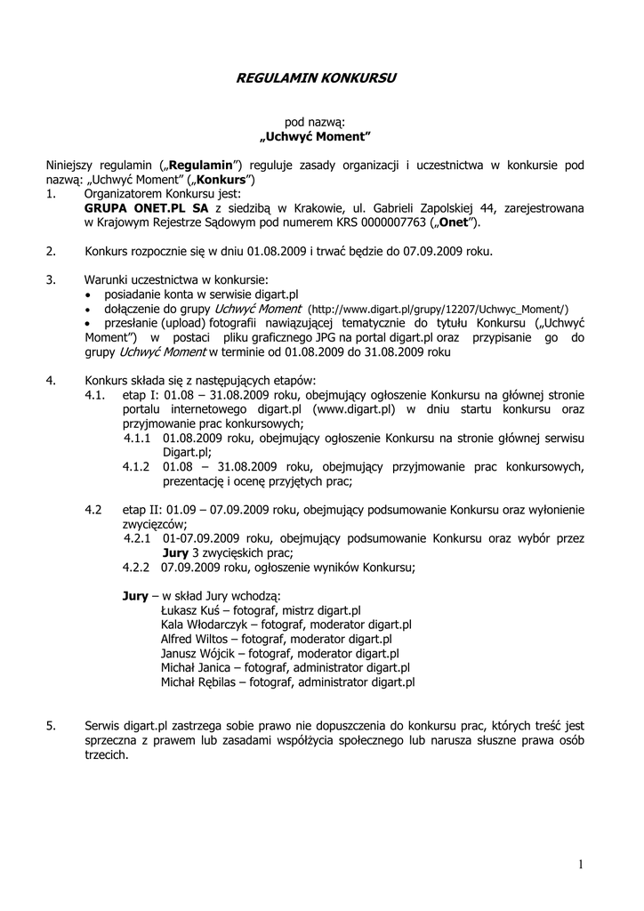 REGULAMIN KONKURSU pod nazwą: „Uchwyć Moment” Niniejszy regulamin („Regulamin”) reguluje zasady organizacji i uczestnictwa w konkursie pod nazwą: „Uchwyć Moment” („Konkurs”) 1. Organizatorem Konkursu jest: GRUPA ONET.PL SA z siedzibą w Krakowie, ul. Gabrieli Zapolskiej 44, zarejestrowana w Krajowym Rejestrze Sądowym pod numerem KRS 0000007763 („Onet”). 2. Konkurs rozpocznie się w dniu 01.08.2009 i trwać będzie do 07.09.2009 roku. 3. Warunki uczestnictwa w konkursie: • posiadanie konta w serwisie digart.pl • dołączenie do grupy Uchwyć Moment (http://www.digart.pl/grupy/12207/Uchwyc_Moment/) • przesłanie (upload) fotografii nawiązującej tematycznie do tytułu Konkursu („Uchwyć Moment”) w postaci pliku graficznego JPG na portal digart.pl oraz przypisanie go do grupy Uchwyć Moment w terminie od 01.08.2009 do 31.08.2009 roku 4. Konkurs składa się z następujących etapów: 4.1. etap I: 01.08 – 31.08.2009 roku, obejmujący ogłoszenie Konkursu na głównej stronie portalu internetowego digart.pl (www.digart.pl) w dniu startu konkursu oraz przyjmowanie prac konkursowych; 4.1.1 01.08.2009 roku, obejmujący ogłoszenie Konkursu na stronie głównej serwisu Digart.pl; 4.1.2 01.08 – 31.08.2009 roku, obejmujący przyjmowanie prac konkursowych, prezentację i ocenę przyjętych prac; 4.2 etap II: 01.09 – 07.09.2009 roku, obejmujący podsumowanie Konkursu oraz wyłonienie zwycięzców; 4.2.1 01-07.09.2009 roku, obejmujący podsumowanie Konkursu oraz wybór przez Jury 3 zwycięskich prac; 4.2.2 07.09.2009 roku, ogłoszenie wyników Konkursu; Jury – w skład Jury wchodzą: Łukasz Kuś – fotograf, mistrz digart.pl Kala Włodarczyk – fotograf, moderator digart.pl Alfred Wiltos – fotograf, moderator digart.pl Janusz Wójcik – fotograf, moderator digart.pl Michał Janica – fotograf, administrator digart.pl Michał Rębilas – fotograf, administrator digart.pl 5. Serwis digart.pl zastrzega sobie prawo nie dopuszczenia do konkursu prac, których treść jest sprzeczna z prawem lub zasadami współżycia społecznego lub narusza słuszne prawa osób trzecich. 1 6. Nagrody: Nagrodami w konkursie są: I miejsce: Album fotograficzny Joe McNally „Uchwycić moment” – 1 sztuka o wartości 49,99 zł brutto Album fotograficzny Grand Press Photo 2008 - 1 sztuka o wartości 49,00 zł brutto Album fotograficzny Grand Press Photo 2006 - 1 sztuka o wartości 30,00 zł brutto II miejsce: Album fotograficzny Joe McNally „Uchwycić moment” – 1 sztuka o wartości 49,99 zł brutto Album fotograficzny Grand Press Photo 2008 - 1 sztuka o wartości 49,00 zł brutto III miejsce: Album fotograficzny Joe McNally „Uchwycić moment” – 1 sztuka o wartości 49,99 zł brutto; 6.1 6.2 6.3 6.4 6.5 6.6 6.7 7. Nagrody nie podlegają zamianie na ich równowartość pieniężną. Uczestnikowi konkursu przysługuje tylko jedna nagroda. Jakiekolwiek roszczenia uczestników Konkursu z tytułu nieotrzymania nagród, które nie zostały im przyznane, są wyłączone. Prawo do nagrody nie może być scedowane na inną osobę. Informacje o wynikach Konkursu, pierwszej jego części oraz o przyznaniu nagrody głównej będą rozpowszechniane na stronach serwisu digart.pl. Ponadto do nagrodzonego zostanie wysłana wiadomość pocztą elektroniczną na adres wskazany podczas rejestracji w portalu digart.pl. Wiadomość zostanie wysłana najpóźniej w ciągu 5 dni po rozstrzygnięciu Konkursu. W ciągu 24 godzin po otrzymaniu od Onet.pl potwierdzenia przydzielenia nagrody, Uczestnik jest zobowiązany potwierdzić pocztą elektroniczną na adres [email protected] przyjęcie nagrody. Jeśli takie potwierdzenie nie nastąpi w określonym w zdaniu poprzedzającym terminie, nagroda przepada i przechodzi na następna osobę pod względem ilości zgromadzonych punktów. Nad prawidłowością przebiegu Konkursu czuwać będzie Komisja Konkursowa, do której zadań należeć będzie nadzór nad przestrzeganiem Regulaminu. Od decyzji Komisji nie przysługuje odwołanie. Odbiór nagród: 7.1. Po potwierdzeniu przyjęcia nagrody, nagroda zostanie przesłana pocztą do zwycięzcy na adres korespondencyjny podany podczas zgłoszenia. 7.2. Wysyłka nagród odbędzie się na koszt Onet.pl SA. 7.3. W przypadku braku możliwości skontaktowania się ze Zwycięzcą po otrzymaniu potwierdzenia przyjęcia nagrody w terminie 7 dni od momentu ogłoszenia wyników, nagroda tego Zwycięzcy przepada i przechodzi na następną osobę pod względem ilości zgromadzonych punktów. 8. Regulamin jest dostępny w siedzibie Organizatora – Grupa Onet.pl SA w Krakowie, przy ul. Gabrieli Zapolskiej 44, oraz na stronie konkursowej w Portalu internetowym digart.pl pod adresem http://digart.pl/pliki/UchwycMoment-regulamin.pdf 9. Regulamin jest jedynym dokumentem określającym zasady Konkursu. 2 10. Reklamacje dotyczące przebiegu i organizacji Konkursu mogą być składane przez uczestników Konkursu w terminie 5 dni od dnia ogłoszenia finalistów – zdobywców nagród głównych. Reklamacje rozpatrują Organizatorzy w terminie 14 dni od dnia otrzymania reklamacji. O rozpatrzeniu reklamacji uczestnik ją składający zostaje zawiadomiony na adres poczty elektronicznej podany w zgłoszeniu. Warunkiem dochodzenia roszczeń na drodze sadowej jest wyczerpanie drogi reklamacji. 11. Wszelkie roszczenia rozpoznaje sąd powszechny właściwy dla siedziby Grupa Onet.pl SA. 12. Wszelkie doręczenia dla Organizatorów powinny być dokonywane pod Grupa Onet.pl SA, ul. Gabrieli Zapolskiej 44, 30-126 Kraków z dopiskiem: „digart.pl”. adres: Kraków, dnia 31.07.2009 roku 3