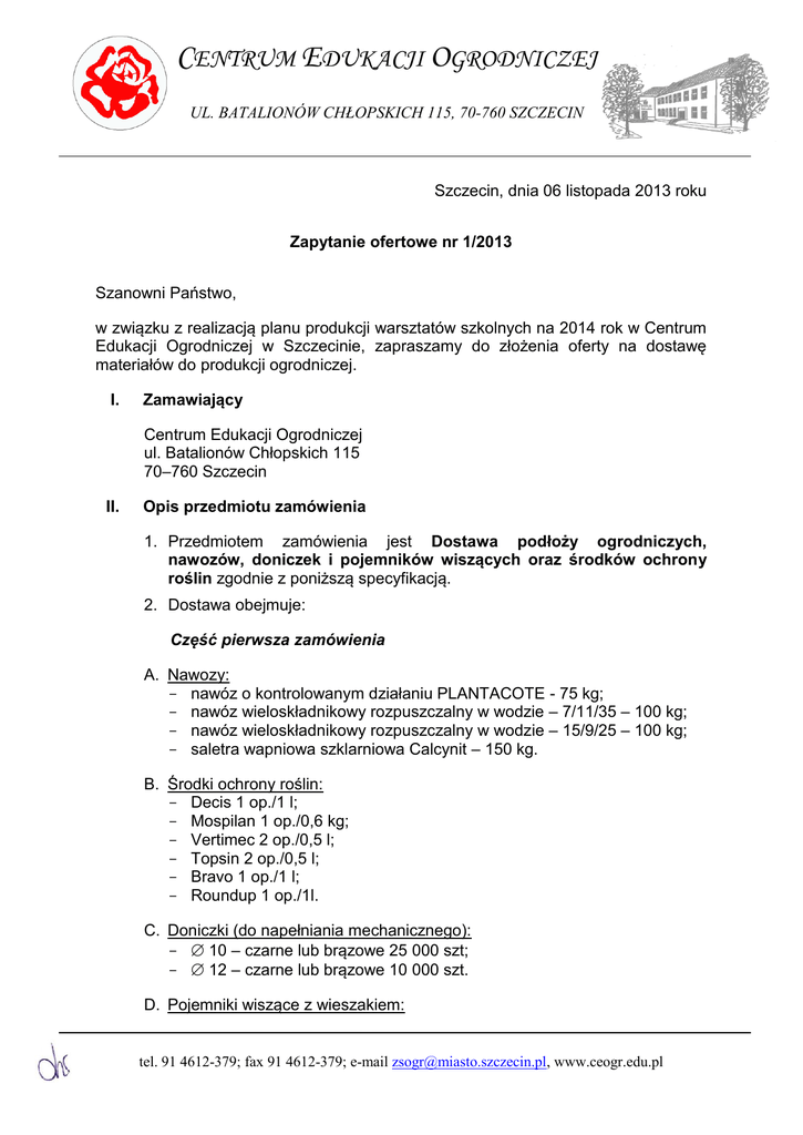 CENTRUM EDUKACJI OGRODNICZEJ UL. BATALIONÓW CHŁOPSKICH 115, 70-760 SZCZECIN Szczecin, dnia 06 listopada 2013 roku Zapytanie ofertowe nr 1/2013 Szanowni Państwo, w związku z realizacją planu produkcji warsztatów szkolnych na 2014 rok w Centrum Edukacji Ogrodniczej w Szczecinie, zapraszamy do złożenia oferty na dostawę materiałów do produkcji ogrodniczej. I. Zamawiający Centrum Edukacji Ogrodniczej ul. Batalionów Chłopskich 115 70–760 Szczecin II. Opis przedmiotu zamówienia 1. Przedmiotem zamówienia jest Dostawa podłoży ogrodniczych, nawozów, doniczek i pojemników wiszących oraz środków ochrony roślin zgodnie z poniższą specyfikacją. 2. Dostawa obejmuje: Część pierwsza zamówienia A. Nawozy: nawóz o kontrolowanym działaniu PLANTACOTE - 75 kg; nawóz wieloskładnikowy rozpuszczalny w wodzie – 7/11/35 – 100 kg; nawóz wieloskładnikowy rozpuszczalny w wodzie – 15/9/25 – 100 kg; saletra wapniowa szklarniowa Calcynit – 150 kg. B. Środki ochrony roślin: Decis 1 op./1 l; Mospilan 1 op./0,6 kg; Vertimec 2 op./0,5 l; Topsin 2 op./0,5 l; Bravo 1 op./1 l; Roundup 1 op./1l. C. Doniczki (do napełniania mechanicznego): 10 – czarne lub brązowe 25 000 szt; 12 – czarne lub brązowe 10 000 szt. D. Pojemniki wiszące z wieszakiem: tel. 91 4612-379; fax 91 4612-379; e-mail [email protected], www.ceogr.edu.pl CENTRUM EDUKACJI OGRODNICZEJ UL. BATALIONÓW CHŁOPSKICH 115, 70-760 SZCZECIN 25 – brązowe lub białe 2 000 szt. E. Podłoża: do siewu i pikowania 70 worków po 80 l; do kwiatów rabatowych podłoże TS-1 po 200 l - 60 worków; do warzyw 70 worków po 80 l; do pelargonii podłoże TS-2 po 200 l - 50 worków; do kwiatów balkonowych uprawianych w pojemnikach wiszących podłoże TS-3 po 200 l - 40 worków. Cześć druga zamówienia A. Opakowania: misa brązowa Ø 21 – 2000 szt; misa brązowa Ø 23 – 1000 szt; doniczka czarna Ø 16 – 2000 szt; doniczka czarna Ø 10 – 12000 szt. B. Podłoże torfowe pod uprawę chryzantem i kwiatów dwuletnich: podłoże TS-2 – 40 worków po 200 l; podłoże TS-3 – 40 worków po 200 l; podłoże TS-1 – 40 worków po 200 l. C. Podłoże do uprawy Poinsecji: podłoże cyklamenowe – 32 worki po 80 l. D. Nawozy rozpuszczalne w wodzie: saletra wapniowa szklarniowa – 200 kg; nawóz wieloskładnikowy rozpuszczalny w wodzie 7/11/35 – 200 kg. E. Środki ochrony roślin: Vertimec 0,5 l – 2 op.; Mospilan 0,6 kg – 2 op.; Decis 1l – 2 op.; Bumper 1 l – 1 op.; Topsin 0,5 l – 1 op.; Biospin 0,5 l – 2 op.; Skarlacz ARAL – 1,5 kg. F. Folia: tunelowa dwusezonowa – 12x33 mb. – 2 rolki; folia antykondensacyjna perforowana 3,2x100 mb. – 2 rolki. tel. 91 4612-379; fax 91 4612-379; e-mail [email protected], www.ceogr.edu.pl CENTRUM EDUKACJI OGRODNICZEJ UL. BATALIONÓW CHŁOPSKICH 115, 70-760 SZCZECIN 3. Oferent zobowiązuje się zorganizować dostawę towaru własnym transportem lub zlecić dostawę innemu przewoźnikowi na koszt i ryzyko Oferenta. 4. Towar ma być dostarczony przez Oferenta na koszt własny w oryginalnych opakowaniach. Oferent ponosi całkowitą odpowiedzialność za wady jakościowe i ilościowe dostarczonego towaru oraz wszelkie wynikające z tego tytułu skutki prawne. 5. Zamawiający zastrzega sobie prawo do ustalenia szczegółów dostawy pod względem ilości poszczególnych elementów zamówienia telefonicznie, co najmniej na dwa dni przed złożeniem zamówienia. III. Termin i miejsce realizacji zamówienia: 1. miejsce dostawy: Centrum Edukacji Ogrodniczej ul. Batalionów Chłopskich 115, 70 – 760 Szczecin. w Szczecinie, 2. termin dostawy: części pierwszej od 25 stycznia 2014 roku do 30 marca 2014 roku; części drugiej od 25 czerwca 2014 roku do 30 lipca 2014 roku. IV. Warunki płatności: 1. zapłata za wykonanie dostawy będzie zrealizowana na podstawie rachunku lub faktury prawidłowo wystawionej po zrealizowaniu dostawy przedmiotu zamówienia; 2. uregulowanie powyższej należności nastąpi przelewem na konto Oferenta w terminie 14 dni od daty otrzymania faktury lub rachunku. V. Specyfikacja dokumentacji, którą Oferent musi dołączyć do oferty: 1. wypełniony druk stanowiący załącznik nr 1 – „Formularz ofertowy”; 2. wypełniony druk stanowiący załącznik nr 2 – „Kalkulacja cenowa dla zamówienia”; 3. wypełniony druk stanowiący załącznik nr 3 – „Oświadczenie oferenta o braku powiązań osobowych i kapitałowych”; 4. dokumenty potwierdzone za zgodność z oryginałem dotyczące numerów NIP, REGON, PKD. tel. 91 4612-379; fax 91 4612-379; e-mail [email protected], www.ceogr.edu.pl CENTRUM EDUKACJI OGRODNICZEJ UL. BATALIONÓW CHŁOPSKICH 115, 70-760 SZCZECIN VI. Odrzucenie ofert Zostaną odrzucone oferty tych Oferentów, którzy: 1. nie spełniają warunków udziału w zapytaniu ofertowym, 2. nie załączyli wymaganych dokumentów, 3. załączyli dokumenty przygotowane określonymi w zapytaniu ofertowym. VII. niezgodnie z wymaganiami Kryterium oceny ofert Oferty zostaną ocenione z poniższym kryterium: za pomocą systemu punktowego, zgodnie Cena – całkowity koszt za wykonanie przedmiotu zamówienia Najniższa oferta otrzyma 100 punktów, natomiast pozostałe oferty proporcjonalnie na podstawie wzoru: (cena najniższej oferty / cena badanej oferty) x 100. Oferent może zaproponować tylko jedną cenę całkowitą i nie może jej zmienić po złożeniu oferty. VIII. Termin i miejsce składania dokumentów: 1. wymagane dokumenty należy składać do dnia 30 listopada 2013 roku do godziny 1500 w sekretariacie Centrum Edukacji Ogrodniczej w Szczecinie, ul. Batalionów Chłopskich 115, 70–760 Szczecin; 2. oferta winna znajdować się w zamkniętej kopercie, na której należy umieścić napis: Oferta na Dostawę podłoży ogrodniczych, nawozów, doniczek i pojemników wiszących oraz środków ochrony roślin; 3. każdy Oferent może złożyć tylko jedną ofertę; 4. oferty powinny być przygotowane i złożone zgodnie z wymaganiami zawar