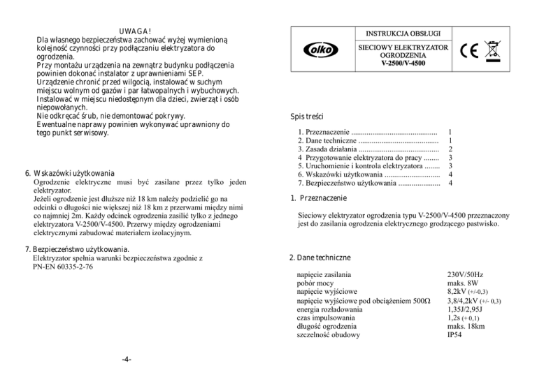 UWAGA! Dla własnego bezpieczeństwa zachować wyżej wymienioną kolejność czynności przy podłączaniu elektryzatora do ogrodzenia. Przy montażu urządzenia na zewnątrz budynku podłączenia powinien dokonać instalator z uprawnieniami SEP. Urządzenie chronić przed wilgocią, instalować w suchym miejscu wolnym od gazów i par łatwopalnych i wybuchowych. Instalować w miejscu niedostępnym dla dzieci, zwierząt i osób niepowołanych. Nie odkręcać śrub, nie demontować pokrywy. Ewentualne naprawy powinien wykonywać uprawniony do tego punkt serwisowy. 6. Wskazówki użytkowania Ogrodzenie elektryczne musi być zasilane przez tylko jeden elektryzator. Jeżeli ogrodzenie jest dłuższe niż 18 km należy podzielić go na odcinki o długości nie większej niż 18 km z przerwami między nimi co najmniej 2m. Każdy odcinek ogrodzenia zasilić tylko z jednego elektryzatora V-2500/V-4500. Przerwy między ogrodzeniami elektrycznymi zabudować materiałem izolacyjnym. 7. Bezpieczeństwo użytkowania. Elektryzator spełnia warunki bezpieczeństwa zgodnie z PN-EN 60335-2-76 Spis treści 1. Przeznaczenie ............................................. 2. Dane techniczne .......................................... 3. Zasada działania .......................................... 4 Przygotowanie elektryzatora do pracy ........ 5. Uruchomienie i kontrola elektryzatora ........ 6. Wskazówki użytkowania ............................. 7. Bezpieczeństwo użytkowania ...................... 1. Przeznaczenie Sieciowy elektryzator ogrodzenia typu V-2500/V-4500 przeznaczony jest do zasilania ogrodzenia elektrycznego grodzącego pastwisko. 2. Dane techniczne napięcie zasilania pobór mocy napięcie wyjściowe napięcie wyjściowe pod obciążeniem 500Ω energia rozładowania czas impulsowania długość ogrodzenia szczelność obudowy -4- 1 1 2 3 3 4 4 230V/50Hz maks. 8W 8,2kV (+/-0,3) 3,8/4,2kV (+/- 0,3) 1,35J/2,95J 1,2s (+ 0,1) maks. 18km IP54 4. Przygotowanie elektryzatora do pracy. Elektryzator podłączyć do ogrodzenia elektrycznego zgodnie z rysunkiem 2. Należy zwrócić szczególną uwagę na ilość zastosowanych bagnetów uziemiających w zależności od panujących warunków wilgotności gleby. 3 5 1 2 230V/50Hz 4 izolator ogrodzenie Rys. 1 Elektryzator ogrodzenia V-2500/V-4500 bagnet 1. zacisk czarny, wyjście uziemienia 2. zacisk czerwony, wyjście wysokiego napięcia 3. kontrolka zasilania LED 4. przewód zasilania sieciowego 5. otwory montażowe bagnet ziemia 3m Rys. 2. Sposób podłączenia elektryzatora V-2500/V-4500 do ogrodzenia 3. Zasada działania Elektryzator elektroniczny (pastuch elektroniczny) jest urządzeniem wytwarzającym krótkie impulsy wysokiego napięcia podawane na ogrodzenie elektryczne okalające pastwisko na którym pasą się zwierzęta hodowlane. Energia impulsu oraz jego długość są tak dobrane aby nie spowodować porażenia zwierzęcia A jedynie odstraszyć go od ogrodzenia. W przypadku dotknięcia ogrodzenia napięcie na ogrodzeniu gwałtownie maleje z 8,2kV do 3,8kV/4,2kV co przy niskiej energii impulsu zabezpiecza przed porażeniem elektrycznym, jedynie doznanie fizyczne jest nieprzyjemne dla żywego organizmu. -2- 5. Uruchomienie i kontrola elektryzatora - podłączyć elektryzator do sieci elektrycznej ~230V za pomocą przewodu zasilania (4). - Regularny dźwięk “tykania” oraz błyskanie kontrolki LED (3) świadczy o poprawnej pracy urządzenia. -3-