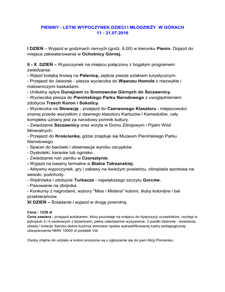 PIENINY - LETNI WYPOCZYNEK DZIECI I MŁODZIEŻY W GÓRACH 11 - 21.07.2016 I DZIEŃ – Wyjazd w godzinach rannych (godz. 6.00) w kierunku Pienin. Dojazd do miejsca zakwaterowania w Ochotnicy Górnej. II - X DZIEŃ – Wypoczynek na miejscu połączony z bogatym programem zwiedzania: - Wjazd kolejką linową na Palenicę, zejście piesze szlakiem turystycznym. - Przejazd do Jaworek - piesza wycieczka do Wąwozu Homole z niezwykle i malowniczymi kaskadami. - Unikalny spływ Dunajcem ze Sromowców Górnych do Szczawnicy. - Wycieczka piesza do Pienińskiego Parku Narodowego z uwzględnieniem zdobycia Trzech Koron i Sokolicy. - Wycieczka na Słowację - przejazd do Czerwonego Klasztoru - miejscowości znanej przede wszystkim z dawnego klasztoru Kartuzów i Kamedułów, cały kompleks uznany jest za narodowy pomnik kultury. - Zwiedzanie Szczawnicy oraz wizyta w Domu Zdrojowym i Pijalni Wód Mineralnych. - Przejazd do Krościenka, gdzie znajduje się Muzeum Pienińskiego Parku Narodowego. - Spacer do bacówki i obserwacja wyrobu oscypków. - Dyskoteki, karaoke lub ognisko. - Zwiedzanie ruin zamku w Czorsztynie. - Wyjazd na baseny termalne w Białce Tatrzanskiej. - Aktywny wypoczynek, gry i zabawy na świeżym powietrzu, olimpiada sportowa na wesoło, podchody. - Wędrówka i zdobycie Turbacza - największego szczytu Gorców. - Pasowanie na zbójnika. - Konkursy z nagrodami, wybory "Miss i Mistera" kolonii, śluby kolonijne i bal przebierańców. XI DZIEŃ – Śniadanie i wyjazd w drogę powrotną. Cena : 1230 zł Cena zawiera : przejazd autokarem, który pozostaje na miejscu do dyspozycji uczestników ,noclegi w pokojach 3 i 4 osobowych z łazienkami, pełne całodzienne wyżywienie, 3 posiłki dziennie - śniadania, obiady i kolacje /bardzo dobra kuchnia domowa/ opieka wykwalifikowanej kadry pedagogicznej. ubezpieczenie NNW 10000 zł podatek Vat Osoby chętne do udziału w koloni proszone są o zgłoszenie się do pani Alicji Pomaniec. CHORWACJA - WYSPA PAG, LETNI WYPOCZYNEK DLA MŁODZIEŻY 29.07 - 08.08.2016 I DZIEŃ : - Wyjazd grupy w godzinach południowych przez Słowację, Węgry - nocny przejazd do Chorwacji. II DZIEŃ: - Przyjazd do miejsca zakwaterowania, w godzinach przedpołudniowych, zakwaterowanie, obiad, odpoczynek nad morzem, kolacja i nocleg. III – IX DZIEŃ - Realizacja programu kolonii letnich, wypoczynek, kąpiele, plażowanie, - Wycieczka do Zadaru - Rozgrywki sportowe, spacery, dyskoteki. - Zwiedzanie Trogiru - typowe miasteczko nadmorskie - spacer po malowniczej starówce z ratuszem z przełomu XIV i XV wieku i katedrą św. Wawrzyńca z XIII w. - Zwiedzanie Splitu największego miasta Dalmacji - stare miasto: antyczny pałac cesarza Dioklecjana, ratusz miejski i malowniczy port. - Rejs statkiem. X DZIEŃ - Śniadanie, wykwaterowanie, przejazd do Parku Narodowego - Plitwickie Jeziora - spacer ok 3 - 4 godziny na obszarze porośniętym przez buki, jodły, świerki i klony, gdzie znajduje się 16 turkusowych jezior położonych tarasowo na długości 7 km i połączonych ze sobą 92 wodospadami. Obszar parku zaliczany jest do światowego dziedzictwa naturalnego i chroniony przez UNESCO, wyjazd w kierunku Polski. XI DZIEŃ - Powrót do miejsca wyjazdu w godzinach późno popołudniowych. PAG - to malownicze miasteczko położone na wyspie o tej samej nazwie, która ciągnie się wzdłuż wysokich Gór Velebit. Pag jest znaną miejscowością turystyczną z niepowtarzalną atmosferą Starego Miasta. W centrum znajdują się przytulne kawiarenki, sklepy z pamiątkami, dyskoteki, centrum sportowe z basenem, w pełni wyposażona strzeżona piaszczysto żwirkowa plaża miejska. W okolicy znajdują sie jedne z najlepszych tras rowerowych w Chorwacji. PENSJONAT TREBAM ODMOR to obiekt specjalizujący się w wypoczynku dzieci i młodzieży. Do dyspozycji pokoje z pełnym węzłem sanitarnym. Posiłki są serwowane w klimatyzowanej stołówce – śniadanie w formie bufetu, obiad i obiadokolacja serwowany). Polsko języczna obsługa. Do dyspozycji sejf w recepcji i bezpłatne wi - fi w całym obiekcie. Cena: 1740 zł/os. Cena zawiera: transport autokarem (wc, klimatyzacja, TV), wyżywienie: 3 posiłki dziennie wg programu, ubezpieczenie NNW 4000 euro, KL 10000 Euro, opieka wykwalifikowanej kadry opiekunów. Cena nie zawiera: biletów wstępu, rejsu statkiem, wycieczki do Splitu i Trogiru - 50 euro. Osoby chętne do udziału w koloni proszone są o zgłoszenie się do pani Alicji Pomaniec.