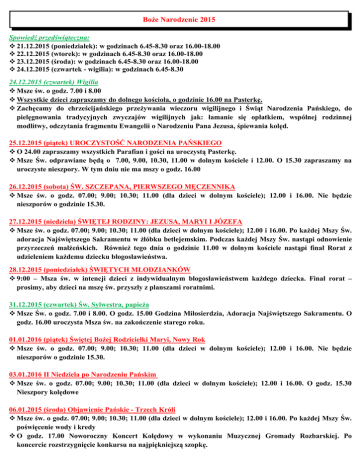 Boże Narodzenie 2015 Spowiedź przedświąteczna: 21.12.2015 (poniedziałek): w godzinach 6.45-8.30 oraz 16.00-18.00 22.12.2015 (wtorek): w godzinach 6.45-8.30 oraz 16.00-18.00 23.12.2015 (środa): w godzinach 6.45-8.30 oraz 16.00-18.00 24.12.2015 (czwartek - wigilia): w godzinach 6.45-8.30 24.12.2015 (czwartek) Wigilia Msze św. o godz. 7.00 i 8.00 Wszystkie dzieci zapraszamy do dolnego kościoła, o godzinie 16.00 na Pasterkę. Zachęcamy do chrześcijańskiego przeżywania wieczoru wigilijnego i Świąt Narodzenia Pańskiego, do pielęgnowania tradycyjnych zwyczajów wigilijnych jak: łamanie się opłatkiem, wspólnej rodzinnej modlitwy, odczytania fragmentu Ewangelii o Narodzeniu Pana Jezusa, śpiewania kolęd. 25.12.2015 (piątek) UROCZYSTOŚĆ NARODZENIA PAŃSKIEGO O 24.00 zapraszamy wszystkich Parafian i gości na uroczystą Pasterkę. Msze Św. odprawiane będą o 7.00, 9.00, 10.30, 11.00 w dolnym kościele i 12.00. O 15.30 zapraszamy na uroczyste nieszpory. W tym dniu nie ma mszy o godz. 16.00 26.12.2015 (sobota) ŚW. SZCZEPANA, PIERWSZEGO MĘCZENNIKA Msze św. o godz. 07.00; 9.00; 10.30; 11.00 (dla dzieci w dolnym kościele); 12.00 i 16.00. Nie będzie nieszporów o godzinie 15.30. 27.12.2015 (niedziela) ŚWIĘTEJ RODZINY: JEZUSA, MARYI I JÓZEFA Msze św. o godz. 07.00; 9.00; 10.30; 11.00 (dla dzieci w dolnym kościele); 12.00 i 16.00. Po każdej Mszy Św. adoracja Najświętszego Sakramentu w żłóbku betlejemskim. Podczas każdej Mszy Św. nastąpi odnowienie przyrzeczeń małżeńskich. Również tego dnia o godzinie 11.00 w dolnym kościele nastąpi finał Rorat z udzieleniem każdemu dziecku błogosławieństwa. 28.12.2015 (poniedziałek) ŚWIĘTYCH MŁODZIANKÓW 9:00 – Msza św. w intencji dzieci z indywidualnym błogosławieństwem każdego dziecka. Finał rorat – prosimy, aby dzieci na mszę św. przyszły z planszami roratnimi. 31.12.2015 (czwartek) Św. Sylwestra, papieża Msze Św. o godz. 7.00 i 8.00. O godz. 15.00 Godzina Miłosierdzia, Adoracja Najświętszego Sakramentu. O godz. 16.00 uroczysta Msza św. na zakończenie starego roku. 01.01.2016 (piątek) Świętej Bożej Rodzicielki Maryi, Nowy Rok Msze św. o godz. 07.00; 9.00; 10.30; 11.00 (dla dzieci w dolnym kościele); 12.00 i 16.00. Nie będzie nieszporów o godzinie 15.30. 03.01.2016 II Niedziela po Narodzeniu Pańskim Msze św. o godz. 07.00; 9.00; 10.30; 11.00 (dla dzieci w dolnym kościele); 12.00 i 16.00. O godz. 15.30 Nieszpory kolędowe 06.01.2015 (środa) Objawienie Pańskie - Trzech Króli Msze św. o godz. 07.00; 9.00; 10.30; 11.00 (dla dzieci w dolnym kościele); 12.00 i 16.00. Po każdej Mszy Św. poświęcenie wody i kredy O godz. 17.00 Noworoczny Koncert Kolędowy w wykonaniu Muzycznej Gromady Rozbarskiej. Po koncercie rozstrzygnięcie konkursu na najpiękniejszą szopkę.
