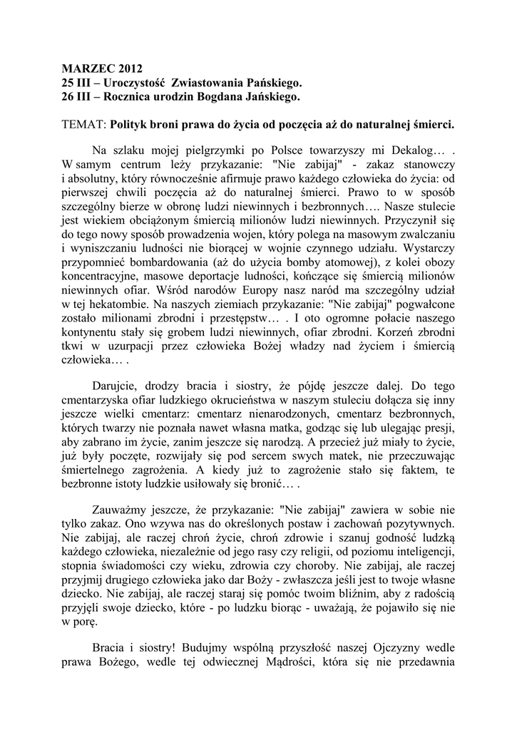 MARZEC 2012 25 III – Uroczystość Zwiastowania Pańskiego. 26 III – Rocznica urodzin Bogdana Jańskiego. TEMAT: Polityk broni prawa do życia od poczęcia aż do naturalnej śmierci. Na szlaku mojej pielgrzymki po Polsce towarzyszy mi Dekalog… . W samym centrum leży przykazanie: "Nie zabijaj" - zakaz stanowczy i absolutny, który równocześnie afirmuje prawo każdego człowieka do życia: od pierwszej chwili poczęcia aż do naturalnej śmierci. Prawo to w sposób szczególny bierze w obronę ludzi niewinnych i bezbronnych…. Nasze stulecie jest wiekiem obciążonym śmiercią milionów ludzi niewinnych. Przyczynił się do tego nowy sposób prowadzenia wojen, który polega na masowym zwalczaniu i wyniszczaniu ludności nie biorącej w wojnie czynnego udziału. Wystarczy przypomnieć bombardowania (aż do użycia bomby atomowej), z kolei obozy koncentracyjne, masowe deportacje ludności, kończące się śmiercią milionów niewinnych ofiar. Wśród narodów Europy nasz naród ma szczególny udział w tej hekatombie. Na naszych ziemiach przykazanie: "Nie zabijaj" pogwałcone zostało milionami zbrodni i przestępstw… . I oto ogromne połacie naszego kontynentu stały się grobem ludzi niewinnych, ofiar zbrodni. Korzeń zbrodni tkwi w uzurpacji przez człowieka Bożej władzy nad życiem i śmiercią człowieka… . Darujcie, drodzy bracia i siostry, że pójdę jeszcze dalej. Do tego cmentarzyska ofiar ludzkiego okrucieństwa w naszym stuleciu dołącza się inny jeszcze wielki cmentarz: cmentarz nienarodzonych, cmentarz bezbronnych, których twarzy nie poznała nawet własna matka, godząc się lub ulegając presji, aby zabrano im życie, zanim jeszcze się narodzą. A przecież już miały to życie, już były poczęte, rozwijały się pod sercem swych matek, nie przeczuwając śmiertelnego zagrożenia. A kiedy już to zagrożenie stało się faktem, te bezbronne istoty ludzkie usiłowały się bronić… . Zauważmy jeszcze, że przykazanie: "Nie zabijaj" zawiera w sobie nie tylko zakaz. Ono wzywa nas do określonych postaw i zachowań pozytywnych. Nie zabijaj, ale raczej chroń życie, chroń zdrowie i szanuj godność ludzką każdego człowieka, niezależnie od jego rasy czy religii, od poziomu inteligencji, stopnia świadomości czy wieku, zdrowia czy choroby. Nie zabijaj, ale raczej przyjmij drugiego człowieka jako dar Boży - zwłaszcza jeśli jest to twoje własne dziecko. Nie zabijaj, ale raczej staraj się pomóc twoim bliźnim, aby z radością przyjęli swoje dziecko, które - po ludzku biorąc - uważają, że pojawiło się nie w porę. Bracia i siostry! Budujmy wspólną przyszłość naszej Ojczyzny wedle prawa Bożego, wedle tej odwiecznej Mądrości, która się nie przedawnia w żadnej epoce, wedle Chrystusowej Ewangelii. Budujmy... Raczej: odbudowujmy, bo wiele zostało zrujnowane..., zrujnowane w ludziach, w ludzkich sumieniach, w obyczajach, w opinii zbiorowej, w środkach przekazu. /Jan Paweł II, Homilia w Radomiu 4 VI 1991 r./ Modlitwa Jana Pawła II z encykliki Evangelium vitae: O Maryjo, jutrzenko nowego świata, Matko żyjących, Tobie zawierzamy sprawę życia: spójrz, o Matko, na niezliczone rzesze dzieci, którym nie pozwala się przyjść na świat, ubogich, którzy zmagają się z trudnościami życia, mężczyzn i kobiet — ofiary nieludzkiej przemocy, starców i chorych zabitych przez obojętność albo fałszywą litość. Spraw, aby wszyscy wierzący w Twojego Syna potrafili otwarcie i z miłością głosić ludziom naszej epoki Ewangelię życia. Wyjednaj im łaskę przyjęcia jej jako zawsze nowego daru, radość wysławiania jej z wdzięcznością w całym życiu oraz odwagę czynnego i wytrwałego świadczenia o niej, aby mogli budować, wraz z wszystkimi ludźmi dobrej woli, cywilizację prawdy i miłości na cześć i chwałę Boga Stwórcy, który miłuje życie. ks. dr Dariusz Tułowiecki Szkoła Wyższa im. Bogdana Jańskiego Łomża Polityk broni prawa do życia od poczęcia aż do naturalnej śmierci. „Osoba ludzka jest zasadą i celem współżycia społecznego” – przypomina „Kompendium nauki społecznej Kościoła” (nr 384). Zaś człowiekiem jest się od poczęcia. Z tego faktu wynika logiczny wniosek, iż przerwanie ciąży jest zabójstwem człowieka. Zabójstwem niezależnie od okoliczności. Naukowy fakt o początku ludzkiego życia ukazuje absurd większości tzw. argumentów za aborcją. Zatem na straży życia każdego człowieka winni stać ci, których zadaniem jest troska o życie społeczne – ludzie polityki. Z nich przede wszystkim, ale także od polityków z chrześcijańskim rodowodem winna wypływać troska o życie każdego człowieka, szczególnie tego nie narodzonego. Chrześcijański polityk, z racji swej wiary, winien forsować w dyskursie publicznym wynikającą z chrześcijaństwa i z prawa natury koncepcję życia, zaś wskazywać na fałszywość argumentów wrogich życiu. To są opinie w rodzaju: „Kobieta ma prawo do własnego ciała!”, „to mój brzuch i moje ciało”. Owszem ma prawo do własnego ciała, ale nie do nienarodzonego dziecka, które nie jest częścią organizmu matki. Poczęte dziecko jest nową, odrębną istotą ludzką o nowej strukturze genetycznej i często innej grupie krwi. Matka nie ma żadnego prawa decydować o pozbawieniu życia swego dziecka na jakimkolwiek etapie jego rozwoju. Kobieta ma prawo do planowania poczęcia swego dziecka. Ale poczęte dziecko ma też prawo do życia. Inny rodzaj argumentów, z którymi zmierza się katolicki polityk to pytanie: „Czy kobieta ma prawo do decydowania o swoim losie?” Tak, to człowiek decyduje o swoim życiu, ale kobieta poddając się aborcji decyduje jednak przede wszystkim o losie swojego dziecka – nie daje mu się narodzić. Nie ma wolności bez odpowiedzialności i bez respektowania praw innych. To oczywiste. Wolność każdego człowieka jest jednak ograniczona prawem innego człowieka. Kobieta ma