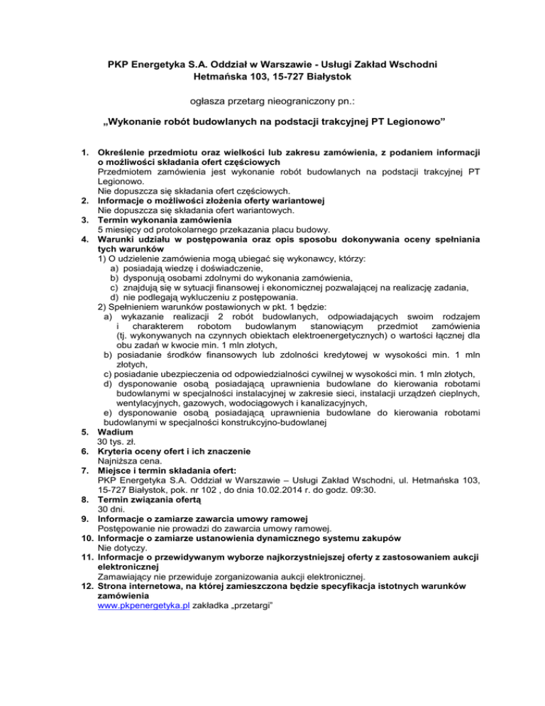 PKP Energetyka S.A. Oddział w Warszawie - Usługi Zakład Wschodni Hetmańska 103, 15-727 Białystok ogłasza przetarg nieograniczony pn.: „Wykonanie robót budowlanych na podstacji trakcyjnej PT Legionowo” 1. Określenie przedmiotu oraz wielkości lub zakresu zamówienia, z podaniem informacji o możliwości składania ofert częściowych Przedmiotem zamówienia jest wykonanie robót budowlanych na podstacji trakcyjnej PT Legionowo. Nie dopuszcza się składania ofert częściowych. 2. Informacje o możliwości złożenia oferty wariantowej Nie dopuszcza się składania ofert wariantowych. 3. Termin wykonania zamówienia 5 miesięcy od protokolarnego przekazania placu budowy. 4. Warunki udziału w postępowania oraz opis sposobu dokonywania oceny spełniania tych warunków 1) O udzielenie zamówienia mogą ubiegać się wykonawcy, którzy: a) posiadają wiedzę i doświadczenie, b) dysponują osobami zdolnymi do wykonania zamówienia, c) znajdują się w sytuacji finansowej i ekonomicznej pozwalającej na realizację zadania, d) nie podlegają wykluczeniu z postępowania. 2) Spełnieniem warunków postawionych w pkt. 1 będzie: a) wykazanie realizacji 2 robót budowlanych, odpowiadających swoim rodzajem i charakterem robotom budowlanym stanowiącym przedmiot zamówienia (tj. wykonywanych na czynnych obiektach elektroenergetycznych) o wartości łącznej dla obu zadań w kwocie min. 1 mln złotych, b) posiadanie środków finansowych lub zdolności kredytowej w wysokości min. 1 mln złotych, c) posiadanie ubezpieczenia od odpowiedzialności cywilnej w wysokości min. 1 mln złotych, d) dysponowanie osobą posiadającą uprawnienia budowlane do kierowania robotami budowlanymi w specjalności instalacyjnej w zakresie sieci, instalacji urządzeń cieplnych, wentylacyjnych, gazowych, wodociągowych i kanalizacyjnych, e) dysponowanie osobą posiadającą uprawnienia budowlane do kierowania robotami budowlanymi w specjalności konstrukcyjno-budowlanej 5. Wadium 30 tys. zł. 6. Kryteria oceny ofert i ich znaczenie Najniższa cena. 7. Miejsce i termin składania ofert: PKP Energetyka S.A. Oddział w Warszawie – Usługi Zakład Wschodni, ul. Hetmańska 103, 15-727 Białystok, pok. nr 102 , do dnia 10.02.2014 r. do godz. 09:30. 8. Termin związania ofertą 30 dni. 9. Informacje o zamiarze zawarcia umowy ramowej Postępowanie nie prowadzi do zawarcia umowy ramowej. 10. Informacje o zamiarze ustanowienia dynamicznego systemu zakupów Nie dotyczy. 11. Informacje o przewidywanym wyborze najkorzystniejszej oferty z zastosowaniem aukcji elektronicznej Zamawiający nie przewiduje zorganizowania aukcji elektronicznej. 12. Strona internetowa, na której zamieszczona będzie specyfikacja istotnych warunków zamówienia www.pkpenergetyka.pl zakładka „przetargi” będzie specyfikacja istotnych warunków zamówienia www.pkpenergetyka.pl zakładka „przetargi”.