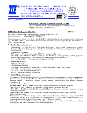 FABRYKA ELEMENTÓW HYDRAULIKI "PONAR - WADOWICE" S.A. 34-100 Wadowice, ul. Wojska Polskiego 29, POLAND tel. +48 0/.../33 8233943, +48 0/.../33 8234444, fax +48 0/.../33 8734880 http://www.ponar-wadowice.pl e-mail: [email protected] Wadowice, 24.10.2003r. KOMISJA PAPIERÓW WARTOŚCIOWYCH I GIEŁD GIEŁDA PAPIERÓW WARTOŚCIOWYCH W WARSZAWIE S.A. POLSKA AGENCJA PRASOWA S.A. RAPORT BIEŻĄCY 53 / 2003 stron: 2 Informacje o członkach Rady Nadzorczej FEH "PONAR-WADOWICE" S.A.. Podstawa prawna: § 5 ust. 1 pkt 31 "RRM GPW" Uzupełniając raport bieżący nr 51/2003 z dnia 23.10.2003 r. Spółka podaje do publicznej wiadomości, informacje wg § 37 "RRM GPW" o Członkach Rady Nadzorczej powołanych na Nadzwyczajnym Walnym Zgromadzeniu w dniu 22 października 2003 r. 1. Pan Remigiusz Adamiak, lat 35 Wykształcenie: Wydział Inżynierii Środowiska Politechniki Warszawskiej; Podyplomowe Studium Zarządzania Finansami Przedsiębiorstw - Szkoła Główna Handlowa w Warszawie. Licencja Maklera Papierów Wartościowych. Doświadczenie zawodowe: 2001 - nadal — Dyrektor Inwestycyjny PZU NFI Management Sp. z o.o. 1994-2001— Dom Maklerski Banku Zachodniego we Wrocławiu - makler giełdowy, makler specjalista, Kierownik Przedstawicielstwa Domu Maklerskiego Banku Zachodniego w Warszawie. 1994 — makler giełdowy w Centrum Operacji Kapitałowych B.H. 2. Pan Jan Antas - lat 53 Wykształcenie: średnie. Doświadczenie zawodowe: 1990-nadal – współwłaściciel w spółce PPHU ANTPOL Jasło (firma z branży spożywczej), 1978-1990 – właściciel zakładu piekarniczego 1972-1978 – właściciel firmy transportowej od1972 – prywatna działalność gospodarcza 3. Pan Waldemar Gębuś, lat 31 Wykształcenie: doktor nauk ekonomicznych – przewód doktorski przeprowadzony w Kolegium Zarządzania i Finansów Szkoły Głównej Handlowej w Warszawie. Absolwent Akademii Ekonomicznej w Krakowie – kierunek Finanse i Bankowość. Posiada licencje doradcy inwestycyjnego oraz maklera papierów wartościowych. Doświadczenie zawodowe: od 1999 - nadal — PTE DOM SA w Warszawie, dyrektor departamentu zarządzania aktywami 1997 - 1999 — PDM Pioneer SA w Warszawie, dyrektor zespołu zarządzania portfelami 1996 - 1997 — Raiffeisen Capital & Investment Polska SA w Warszawie doradca inwestycyjny w zespole zarządzania aktywami 1994 - 1996 — DM Magnus SA w Krakowie początkowo makler papierów wartościowych, następnie kierownik działu analiz. Doświadczenie w pełnieniu funkcji członka rad nadzorczych spółek publicznych: były członek Rad Nadzorczych Novita S.A. w Zielonej Górze, MCI Management S.A. we Wrocławiu, Capital Partners S.A. w Warszawie, od sierpnia 2002 do chwili obecnej – Tras Tychy S.A.w Skawinie. Członek Stowarzyszenia Maklerów i Doradców, Polskiego Stowarzyszenia Ekonomistów Biznesu oraz Rady Inwestycyjnej przy Izbie Gospodarczej Towarzystw Emerytalnych. Raport bieżący 53/2003 4. Pan Jerzy Loręcki - lat 47 Wykształcenie wyższe, mgr inż. 1982 - Absolwent Akademii Górniczo-Hutniczej w Krakowie – kierunek Inżynieria Materiałowa i Ceramika. Doświadczenie zawodowe: Wiceprezes Zarządu F.H. ALMED Sp. z o.o. Wiceprezes Zarządu EUROCEMENT CONSULTING GROUP Sp. z o.o. Przewodniczący Rady Nadzorczej F.I. LEOPARD S.A. 5. Pan Szymon Ożóg - Członek Rady Nadzorczej, lat 27 Wykształcenie: wyższe - Szkoła Główna Handlowa w Warszawie. Licencja Doradcy Inwestycyjnego. Doświadczenie zawodowe: IV 2002 - nadal — Dyrektor Inwestycyjny PZU NFI Management Sp. z o.o. VIII 2000 - IV 2002 — Menadżer Projektów w Trinity Management Sp. z o.o. I - VII 2000 — Analityk w TFI PZU S.A. Członek w Radach Nadzorczych: POLNORD S.A., ODLEWNIA ŻELIWA S.A. 6. Pani Ewa Joanna Powierża - lat 35 Wykształcenie: wyższe ekonomiczne – mgr ekonomii Absolwentka Wydziału Nauk Ekonomicznych Uniwersytetu Warszawskiego w Warszawie. Doświadczenie zawodowe: Od 11 lat zatrudniona w Ministerstwie Skarbu Państwa obecnie na stanowisku głównego specjalisty w Departamencie Prywatyzacji II, wcześniej w Departamencie Nadzoru Właścicielskiego Ministerstwa Przekształceń Własnościowych. Jest członkiem Rady Nadzorczej w Zakładach Mięsnych S.A. w Kielcach, wcześniej zasiadała w Radzie Nadzorczej w Zakładach Naprawczych Taboru Kolejowego „Nowy Sącz” S.A. 7. Pan Roman Pudełko - lat 45 Wykształcenie: wyższe 1983 - Absolwent Wydziału Transportu Politechniki Śląskiej w Katowicach. Doświadczenie zawodowe: od 2001 - nadal — S4E S.A. Kraków; Prezes Zarządu. Pracownik MCCnet Sp. z o.o. 1999 - 2001 — Compaq Computer Sp. z o.o. Warszawa, Dyrektor Sprzedaży. Członek Country Management Team. 1988 - 1999 — Koma S.A. Katowice, Prezes Zarządu, wcześniej Wiceprezes Zarządu, Dyrektor Handlowy. Wg złożonego w Spółce oświadczenia ww. Członkowie Rady Nadzorczej FEH PONAR-Wadowice" S.A. : "... nie wykonują innej działalności konkurencyjnej poza przedsiębiorstwem emitenta, nie uczestniczą w spółce konkurencyjnej jako wspólnik spółki cywilnej, spółki osobowej lub jako członek organu spółki kapitałowej lub w innej konkurencyjnej osobie prawnej jako członek jej organu. ... nie figurują jako osoby wpisane w Rejestrze Dłużników Niewypłacalnych prowadzonym na podstawie ustawy o KRS". W imieniu FEH "PONAR-Wadowice" S.A.: PREZES ZARZĄDU Jerzy Fimowicz CZŁONEK ZARZĄDU Andrzej Dzierugo