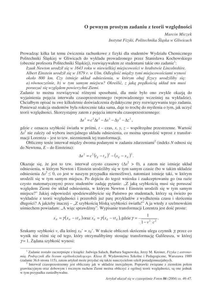 O pewnym prostym zadaniu z teorii względności Marcin Miczek Instytut Fizyki, Politechnika Śląska w Gliwicach Prowadząc kilka lat temu ćwiczenia rachunkowe z fizyki dla studentów Wydziału Chemicznego Politechniki Śląskiej w Gliwicach do wykładu prowadzonego przez Stanisława Kochowskiego (obecnie profesora Politechniki Śląskiej), rozwiązywałem ze studentami takie oto zadanie1: Izaak Newton urodził się w 1643 roku w niewielkiej miejscowości w hrabstwie Lincolnshire. Albert Einstein urodził się w 1879 r. w Ulm. Odległość między tymi miejscowościami wynosi około 800 km. Czy istnieje układ odniesienia, w którym obaj fizycy urodziliby się: a) równocześnie, b) w tym samym miejscu? Określić, z jaką prędkością układ ten musi poruszać się względem powierzchni Ziemi. Zadanie to można rozwiązywać różnymi sposobami, dla mnie było ono zwykle okazją do wyjaśnienia pojęcia interwału czasoprzestrzennego (wprowadzonego wcześniej na wykładzie). Chciałbym opisać tu swe kilkuletnie doświadczenia dydaktyczne przy rozwiązywaniu tego zadania. Ponieważ reakcja studentów była rokrocznie taka sama, daje to trochę do myślenia o tym, jak uczyć teorii względności. Skorzystajmy zatem z pojęcia interwału czasoprzestrzennego: ∆s 2 = c 2 ∆t 2 − ∆x 2 − ∆y 2 − ∆z 2 , gdzie c oznacza szybkość światła w próżni, t – czas, x, y, z – współrzędne przestrzenne. Wartość ∆s2 nie zależy od wyboru inercjalnego układu odniesienia, co można sprawdzić wprost z transformacji Lorentza – jest to tzw. niezmiennik tej transformacji. Obliczmy tenże interwał między dwoma podanymi w zadaniu zdarzeniami2 (indeks N odnosi się do Newtona, E – do Einsteina): ∆s 2 = c 2 (t E − t N ) − ( x E − x N ) . 2 2 Okazuje się, że jest to tzw. interwał czysto czasowy (∆s2 > 0), a zatem nie istnieje układ odniesienia, w którym Newton i Einstein urodziliby się w tym samym czasie (bo w takim układzie odniesienia ∆s2 ≤ 0, co jest w naszym przypadku niemożliwe), natomiast istnieje taki, w którym urodzili się w tym samym miejscu. Po dojściu do tegoż wniosku i zaakceptowaniu go (na razie czysto matematycznym) przez studentów zadaję pytanie: „Z jaką szybkością musi się poruszać względem Ziemi ów układ odniesienia, w którym Newton i Einstein urodzili się w tym samym miejscu?” Jakiej odpowiedzi spodziewalibyście się Państwo po studentach, którzy są świeżo po wykładzie z teorii względności i przerobili już parę przykładów z wydłużenia czasu i skrócenia długości? A jakżeby inaczej – „Z szybkością bliską szybkości światła!” A ja wtedy z szelmowskim uśmiechem powiadam: „A więc sprawdźmy”. Wypisanie transformacji Lorentza jest dość proste: x N' = γ ( x N − vt N ) oraz x E' = γ ( x E − vt E ), gdzie γ = 1 1− v2 c2 . Szukamy szybkości v, dla której xN’ = xE’. W trakcie obliczeń skróceniu ulega czynnik γ, przez co wynik nie różni się od tego, który otrzymalibyśmy stosując transformację Galileusza, w której γ = 1. Ż ądana szybkość wynosi: 1 Zadanie zostało zaczerpnięte z książki: Jadwiga Salach, Barbara Sagnowska, Jerzy M. Kreiner, Fizyka z astronomią. Podręcznik dla liceum ogólnokształcącego. Klasa II. Wydawnictwa Szkolne i Pedagogiczne, Warszawa 1989 (zadanie 36.6 strona 115), zatem artykuł może przydać się także nauczycielom szkół ponadgimnazjalnych. 2 Interwał czasoprzestrzenny jest obliczany jak w układzie inercjalnym. Poprawki związane z ziemskim polem grawitacyjnym oraz dobowym i rocznym ruchem Ziemi można obliczyć z ogólnej teorii względności, są one jednak w tym przypadku zaniedbywalne. Artykuł ukazał się w czasopiśmie Foton 86 (2004) ss. 46-47. v= xE − xN 800 km m mm = = 9,3 = 0,1 . tE − tN 1879 − 1643 rok dzień s Dla porównania szybkość ślimaka jest rzędu 1 mm/s. Ten zaskakujący dla studentów wynik tłumaczyłem w sposób następujący. Wyobraźmy sobie rakietę z kosmitą, który w 1643 r. znajduje się w miejscu urodzin Newtona i przez okienko swego pojazdu obserwuje narodziny twórcy klasycznej dynamiki. Następnie rakieta porusza się z obliczoną przez nas szybkością, aby w 1879 r. znaleźć się nad Ulm – wtedy kosmita przez okienko rakiety obserwuje narodziny twórcy teorii względności. I konkludując z uśmiechem oświadczam, że narodziny obu fizyków odbyły się w tym samym miejscu (w układzie odniesienia związanym z rakietą) – a mianowicie naprzeciw okienka rakiety. Zaś cały problem nie leży w rozpędzeniu rakiety do ogromnej szybkości, a w długości życia naszego obserwatora. No i jak Państwo myślicie – co na to wszystko studenci? No cóż, zwykle odpowiadają „ To jest bez sensu” . Chyba rozwiązanie okazało się zbyt banalne – cóż to za relatywistyka przy takiej podślimaczej szybkości… Kończąc już bardziej poważnie – widać, że pojęcie układu odniesienia okazuje się zaskakująco trudne dla studentów pierwszego roku, usłyszenie zaś na wykładzie o zadziwiających efektach relatywistycznych przesłania o wiele bardziej fundamentalny i zdroworozsądkowy charakter zasady względności Galileusza. Artykułukazałsię w czasopiśmie Foton 86 (2004) ss. 46-47.
