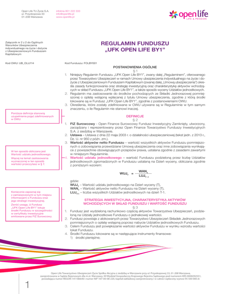 Open Life TU Życie S.A. ul. Przyokopowa 33 01-208 Warszawa infolinia 801 222 333 [email protected] www.openlife.pl REGULAMIN FUNDUSZU „UFK OPEN LIFE BY1” Załącznik nr 2 z 2 do Ogólnych Warunków Ubezpieczenia indywidualnego na życie i dożycie z Ubezpieczeniowym Funduszem Kapitałowym Kod OWU: UB_OLIJ114 Kod Funduszu: FOLBY001 POSTANOWIENIA OGÓLNE § 1 1. Niniejszy Regulamin Funduszu „UFK Open Life BY1”, zwany dalej „Regulaminem”, oferowanego przez Towarzystwo Ubezpieczeń w ramach Umowy ubezpieczenia indywidualnego na życie i dożycie z Ubezpieczeniowym Funduszem Kapitałowym (zwanej dalej „Umową ubezpieczenia”) określa zasady funkcjonowania oraz strategię inwestycyjną oraz charakterystykę aktywów wchodzących w skład Funduszu „UFK Open Life BY1”, a także sposób wyceny Udziałów jednostkowych. 2. Regulamin ma zastosowanie do środków pochodzących ze Składki Jednorazowej pomniejszonej o opłatę wstępną wpłacanej z tytułu Umowy ubezpieczenia, zgodnie z którą środki lokowane są w Fundusz „UFK Open Life BY1”, zgodnie z postanowieniami OWU. 3. Określenia, które zostały zdefiniowane w OWU używane są w Regulaminie w tym samym znaczeniu, o ile Regulamin nie stanowi inaczej. Poniższe definicje stanowią uzupełnienie pojęć zdefiniowanych w OWU. 1. 2. 3. W ten sposób obliczana jest Wartość udziału jednostkowego. Więcej na temat zastosowania wyznaczonej w ten sposób wartości przeczytasz w § 7. 4. DEFINICJE § 2 FIZ Surowcowy - Open Finance Surowcowy Fundusz Inwestycyjny Zamknięty, utworzony, zarządzany i reprezentowany przez Open Finance Towarzystwo Funduszy Inwestycyjnych S.A. z siedzibą w Warszawie. Ustawa – Ustawa z dnia 22 maja 2003 r. o działalności ubezpieczeniowej (tekst jedn. z 2013 r., Dz. U. nr 950 z późn. zm.). Wartość aktywów netto Funduszu – wartość wszystkich aktywów Funduszu pomniejszonych o zobowiązania przewidziane Umową ubezpieczenia oraz inne zobowiązania wynikające z powszechnie obowiązujących przepisów prawa, ustalana zgodnie z zasadami zawartymi w niniejszym Regulaminie. Wartość udziału jednostkowego – wartość Funduszu podzieloną przez liczbę Udziałów jednostkowych zgromadzonych w Funduszu ustalaną na Dzień wyceny, obliczana zgodnie z poniższym wzorem: WUJT = gdzie: WUJT – Wartość udziału jednostkowego na Dzień wyceny (T), WANT – Wartość aktywów netto Funduszu na Dzień wyceny (T), LUJT-1 – liczba wszystkich Udziałów jednostkowych na dzień T-1. Koniecznie zapoznaj się z zamieszczonymi w tym miejscu informacjami o Funduszu oraz jego strategii inwestycyjnej. Zwróć uwagę, iż Fundusz „UFK Open Life BY1” lokuje środki Funduszu w szczególności w certyfikaty inwestycyjne emitowane przez FIZ Surowcowy. 1. 2. 3. 4. 1 WANT LUJT -1 STRATEGIA INWESTYCYJNA, CHARAKTERYSTYKA AKTYWÓW WCHODZĄCYCH W SKŁAD FUNDUSZU I WARTOŚĆ FUNDUSZU § 3 Fundusz jest wydzieloną rachunkowo częścią aktywów Towarzystwa Ubezpieczeń, podzieloną na Udziały jednostkowe Funduszu o jednakowej wartości. Fundusz powstaje z alokowanych przez Towarzystwo Ubezpieczeń Składek Jednorazowych pomniejszonych o opłatę wstępną poprzez nabycie Udziałów jednostkowych Funduszu. Celem Funduszu jest powiększanie wartości aktywów Funduszu w wyniku wzrostu wartości lokat Funduszu. Środki Funduszu lokowane są w następujące instrumenty finansowe: 1) środki pieniężne; Open Life Towarzystwo Ubezpieczeń Życie Spółka Akcyjna z siedzibą w Warszawie przy ul. Przyokopowej 33, 01-208 Warszawa, zarejestrowana w Sądzie Rejonowym dla m.st. Warszawy, XII Wydział Gospodarczy Krajowego Rejestru Sądowego pod numerem KRS 0000292551, posiadająca numer REGON 141186640 i numer NIP 107-00-08-220, kapitał zakładowy zarejestrowany i w całości wpłacony wynosi 95 500 000 zł. Open Life TU Życie S.A. ul. Przyokopowa 33 01-208 Warszawa infolinia 801 222 333 [email protected] www.openlife.pl 2) dłużne papiery wartościowe emitowane lub gwarantowane przez Skarb Państwa lub Narodowy Bank Polski; 3) jednostki uczestnictwa lub certyfikaty inwestycyjne funduszy pieniężnych lub funduszy obligacji; 4) certyfikaty inwestycyjne emitowane przez FIZ Surowcowy, przy czym w przypadkach określonych w ust. 13, Towarzystwo Ubezpieczeń w Okresie ubezpieczenia dokonuje zmian, o których mowa w ust. 11, z zastrzeżeniem limitów zaangażowania określonych w ust. 5 - 7. 5. Do 10% środków Funduszu lokowane jest w środki pieniężne lub dłużne papiery wartościowe emitowane lub gwarantowane przez Skarb Państwa lub Narodowy Bank Polski lub jednostki uczestnictwa lub certyfikaty inwestycyjne funduszy pieniężnych lub funduszy obligacji, z zastrzeżeniem postanowień ust. 7 i ust. 11. 6. Co najmniej 90% środków Funduszu lokowane jest w certyfikaty inwestycyjne emitowane przez FIZ Surowcowy, z zastrzeżeniem ust. 7 i ust. 11. 7. Limity udziału poszczególnych aktywów Funduszu, o których mowa w ust. 5 - 6, mogą ulegać przekroczeniu w następujących okresach: 1) przez okres do trzech miesięcy kalendarzowych od pierwszej wyceny Funduszu oraz 2) przez okres do dwóch miesięcy kalendarzowych w trakcie trwania Okresu ubezpieczenia, podczas których do 100% środków Funduszu może zostać ulokowane w środki pieniężne. 8. W przypadku przekroczenia limitu, o którym mowa w ust. 7, Towarzystwo Ubezpieczeń doprowadzi strukturę aktywów do struktury opisanej w ust. 5 - 6: 1) w terminie 30 dni od pierwszego Dnia wyceny przypadającego po okresie przekroczenia, o którym mowa w ust. 7 pkt 1; 2) w terminie 30 dni od Dnia wyceny, na który wystąpiło przekroczenie, określone w ust. 7 pkt 2. 9. Środki pieniężne, o których mowa w ust. 4 pkt 1, są aktywami pieniężnymi w formie krajowych środków płatniczych, znajdujące się w obrocie gotówkowym lub w obrocie następującym za pośrednictwem bieżących rachunków bankowych lub depozytów płatnych na żądanie. 10.Certyfikaty inwestycyjn