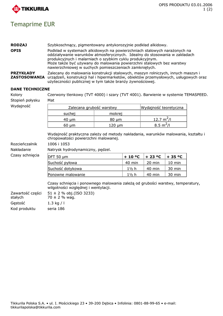 OPIS PRODUKTU 03.01.2006 1 (2) Temaprime EUR RODZAJ Szybkoschnący, pigmentowany antykorozyjnie podkład alkidowy. OPIS Podkład w systemach alkidowych na powierzchniach stalowych narażonych na oddziaływanie warunków atmosferycznych. Idealny do stosowania w zakładach produkcyjnych i malarniach o szybkim cyklu produkcyjnym. Może także być używany do malowania powierzchni stalowych bez warstwy nawierzchniowej w suchych pomieszczeniach zamkniętych. PRZYKŁADY Zalecany do malowania konstrukcji stalowych, maszyn rolniczych, innych maszyn i ZASTOSOWANIA urządzeń, konstrukcji hal i hipermarketów, obiektów przemysłowych, usługowych oraz użyteczności publicznej w tym także branży żywnościowej. DANE TECHNICZNE Kolory Czerwony tlenkowy (TVT 4000) i szary (TVT 4001). Barwienie w systemie TEMASPEED. Stopień połysku Mat Wydajność Zalecana grubość warstwy Wydajność teoretyczna suchej mokrej 40 µm 80 µm 12.7 m /l 60 µm 120 µm 8.5 m /l 2 2 Wydajność praktyczna zależy od metody nakładania, warunków malowania, kształtu i chropowatości powierzchni malowanej. Rozcieńczalnik 1006 i 1053 Nakładanie Natrysk hydrodynamiczny, pędzel. Czasy schnięcia DFT 50 µm + 10 ºC + 23 ºC + 35 ºC 40 min 20 min 10 min Suchość dotykowa 1½ h 40 min 30 min Ponowne malowanie 1½ h 40 min 30 min Suchość pyłowa Czasy schnięcia i ponownego malowania zależą od grubości warstwy, temperatury, wilgotności względnej i wentylacji. Zawartość części stałych 51 ± 2 % obj.(ISO 3233) 70 ± 2 % wag. Gęstość 1.3 kg / l Kod produktu seria 186 Tikkurila Polska S.A. • ul. I. Mościckiego 23 • 39-200 Dębica • Infolinia: 0801-88-99-65 • e-mail: [email protected] OPIS PRODUKTU 03.01.2006 2 (2) Temaprime EUR INSTRUKCJE STOSOWANIA Warunki nakładania Powierzchnia musi być sucha. Temperatura otoczenia, powierzchni malowanej i farby nie powinna być niższa od +5 °C w czasie malowania i suszenia. Wilgotność względna nie powinna przekraczać 80 %. Temperatura malowanej powierzchni stalowej powinna być wyższa o min. 3 °C od punktu rosy. Przygotowanie Usunąć oleje, tłuszcze, sole i inne zanieczyszczenia odpowiednim detergentem. Powierzchnię spłukać dokładnie wodą i wysuszyć. (PN-EN ISO 12944-4). Powierzchnie stalowe:Obrabiać strumieniowo-ściernie do stopnia Sa2. Przy niewielkich zaprawkach ręczne bądź mechaniczne oczyszczenie do stopnia St2 jest wystarczające (PN - ISO 8501 - 1). Powierzchnie zagruntowane: Usunąć tłuszcze i zanieczyszczenia. Powierzchnię zmyć dokładnie wodą i wysuszyć.Naprawić uszkodzone miejsca w warstwie podkładu. Zwracać uwagę na czasy przemalowań podkładu. (PN-EN ISO 12944-4). Powłoka gruntująca TEMAPRIME EUR. Powłoka nawierzchniowa TEMALAC, FONTECRYL oraz FONTELAC. Malowanie Natrysk hydrodynamiczny, pędzel. Przed użyciem farbę dokładnie wymieszać. W zależności od techniki nakładania, farba może być rozcieńczona w granicach 0 – 20 %. Dysza urządzenia hydrodynamicznego o średnicy 0,011 - 0,015”, a kąt natrysku dobrać do kształtu malowanego przedmiotu. Czyszczenie narzędzi Rozcieńczalnik 1006. Limity emisji LZO (EU VOC 2004/ 42/EC) Zawartość Lotnych Związków Organicznych wynosi 440 /litr. Maksymalna zawartość LZO w gotowej do użycia farbie (rozcieńczonej 15 % obj.) wynosi 495 g/l. BEZPIECZEŃSTWO Zawsze zwracać uwagę na napisy ostrzegawcze na opakowaniach. Dalsze informacje o zagrożeniach i zapobieganiu im ujęte są w Karcie Charakterystyki produktu, która dostępna jest na życzenie Klienta. Powyższe informacje opierają się na badaniach laboratoryjnych oraz doświadczeniu praktycznym i są miarodajne na dzień podany na karcie katalogowej wyrobu. Jakość wyrobu zagwarantowana jest naszym systemem produkcji opartym na wymaganiach norm ISO 9001 i ISO 14001. Jako producent nie ponosimy odpowedzialności za jakiekolwiek szkody spowodowane użyciem wyrobu w sposób niezgodny z zaleceniami i w niewłaściwych celach. Tikkurila Polska S.A. • ul. I. Mościckiego 23 • 39-200 Dębica • Infolinia: 0801-88-99-65 • e-mail: [email protected]