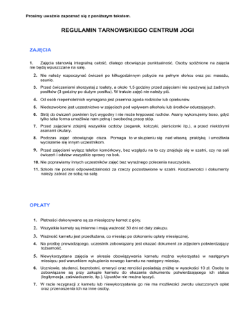 Prosimy uważnie zapoznać się z poniższym tekstem. REGULAMIN TARNOWSKIEGO CENTRUM JOGI ZAJĘCIA 1. Zajęcia stanowią integralną całość, dlatego obowiązuje punktualność. Osoby spóźnione na zajęcia nie będą wpuszczane na salę. 2. Nie należy rozpoczynać ćwiczeń po kilkugodzinnym pobycie na pełnym słońcu oraz po: masażu, saunie. 3. Przed ćwiczeniami skorzystaj z toalety, a około 1,5 godziny przed zajęciami nie spożywaj już żadnych posiłków (3 godziny po dużym posiłku). W trakcie zajęć nie należy pić. 4. Od osób niepełnoletnich wymagana jest pisemna zgoda rodziców lub opiekunów. 5. Niedozwolone jest uczestnictwo w zajęciach pod wpływem alkoholu lub środków odurzających. 6. Strój do ćwiczeń powinien być wygodny i nie może krępować ruchów. Asany wykonujemy boso, gdyż tylko taka forma umożliwia nam pełną i swobodną pracę stóp. 7. Przed zajęciami zdejmij wszystkie ozdoby (zegarek, kolczyki, pierścionki itp.), a przed niektórymi asanami okulary. 8. Podczas zajęć obowiązuje cisza. Pomaga to w skupieniu się nad własną praktyką i umożliwia wyciszenie się innym uczestnikom. 9. Przed zajęciami wyłącz telefon komórkowy, bez względu na to czy znajduje się w szatni, czy na sali ćwiczeń i odstaw wszystkie sprawy na bok. 10. Nie poprawiamy innych uczestników zajęć bez wyraźnego polecenia nauczyciela. 11. Szkoła nie ponosi odpowiedzialności za rzeczy pozostawione w szatni. Kosztowności i dokumenty należy zabrać ze sobą na salę. OPŁATY 1. Płatności dokonywane są za miesięczny karnet z góry. 2. Wszystkie karnety są imienne i mają ważność 30 dni od daty zakupu. 3. Ważność karnetu jest przedłużana, co miesiąc po dokonaniu opłaty miesięcznej. 4. Na prośbę prowadzącego, uczestnik zobowiązany jest okazać dokument ze zdjęciem potwierdzający tożsamość. 5. Niewykorzystane zajęcia w okresie obowiązywania karnetu można wykorzystać w następnym miesiącu pod warunkiem wykupienia nowego karnetu na następny miesiąc. 6. Uczniowie, studenci, bezrobotni, emeryci oraz renciści posiadają zniżkę w wysokości 10 zł. Osoby te zobowiązane są przy zakupie karnetu do okazania dokumentu potwierdzającego ich status (legitymacja, zaświadczenie, itp.). Upustów nie można łączyć. 7. W razie rezygnacji z karnetu lub niewykorzystania go nie ma możliwości zwrotu uiszczonych opłat oraz przenoszenia ich na inne osoby. ZDROWIE 1. Wszelkie dolegliwości, schorzenia, przebyte urazy wpływające na ograniczenia sprawności fizycznej i psychicznej należy zgłaszać nauczycielowi przed rozpoczęciem zajęć. 2. W przypadku poważnych schorzeń uczestniczenie w zajęciach możliwe jest po przedstawieniu zaświadczenia lekarskiego o braku przeciwwskazań do praktyki jogi. 3. Podczas praktyki nie powinno się odczuwać napięcia w: mięśniach twarzy; uszach; oczach. 4. Asany należy wykonywać bardzo starannie według wskazówek nauczyciela, przy zachowaniu maksymalnej koncentracji. Pozwala to na bezpieczne ich praktykowanie. 5. Podczas zajęć oddychaj przez nos. Zachowuj rozluźnioną twarz i podbrzusze. 6. Szkoła jogi nie ponosi odpowiedzialności za uaktywnienie i zaostrzenie się schorzeń i chorób, na które cierpią uczestnicy. Ryzyko związane z możliwością powstania urazów ponosi wyłącznie uczestnik zajęć. 7. W przypadku wystąpienia niepokojących objawów w trakcie ćwiczeń (pogorszenie samopoczucia, mdłości, bóle kręgosłupa, stawów lub chorych miejsc), należy przerwać wykonywanie ćwiczeni i zgłosić dolegliwości prowadzącemu. 8. Osoby z chorobami stóp lub otwartymi ranami dłoni lub/i stóp zobowiązane są do korzystania z własnej maty. 9. Należy zachować szczególną ostrożność przy ćwiczeniach, w których może dojść do kontuzji uczestnika (stanie na rękach, stanie na głowie) oraz w ćwiczeniach z wykorzystaniem: lin, klocków, krzeseł. 10. Ważna informacja dla pań: Ponieważ w czasie miesiączki nie można wykonywać pewnych pozycji jogi, prosimy o zgłaszanie niedyspozycji nauczycielowi przed zajęciami. 11. Panie w ciąży, ćwiczące wcześniej jogę mogą uczestniczyć w zajęciach przestrzegając ścisłych zaleceń instruktora. Panie w ciąży, niepraktykujące wcześniej jogi, nie powinny rozpoczynać w tym okresie ćwiczeń. 12. Do uzyskania oczekiwanych rezultatów w sferze psychicznej i fizycznej konieczna jest regularna praktyka. 13. Wszelkie wątpliwości, co do praktyki można wyjaśniać z nauczycielem w czasie wolnym przed lub po zajęciach. 14. Uczestnictwo w zajęciach jest jednocześnie zobowiązaniem do przestrzeganie powyższego regulaminu. …………………………………………………………………………………………………………… Imię i nazwisko uczestnika* ………………………………………………………………………………………………………………. Adres do korespondencji …………………………………. E-mail ………………………….. nr telefonu Wyrażam /nie wyrażam / zgodę na przetwarzanie moich danych osobowych zgodnie z ustawą z dnia 29.08.1997r. Ochronie Danych Osobowych /dz. U. nr 133, poz. 883/ ** ZAPOZNAŁEM SIĘ Z REGULAMINEM I AKCEPTUJĘ GO. ………………………………. Podpis Uczestnika. Tarnów, dnia ………………. *Administratorem podanych danych jest Tarnowskie Centrum Jogi. Służą one realizacji naszych celów statystycznych oraz marketingowych i nie będą udostępniane innym podmiotom. ** Niewłaściwe skreślić.