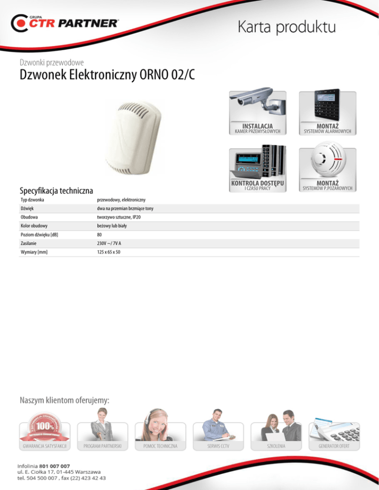 Dzwonki przewodowe Dzwonek Elektroniczny ORNO 02/C INSTALACJA KAMER PRZEMYSŁOWYCH KONTROLA DOSTĘPU I CZASU PRACY Specyfikacja techniczna Typ dzwonka przewodowy, elektroniczny Dźwięk dwa na przemian brzmiące tony Obudowa tworzywo sztuczne, IP20 Kolor obudowy beżowy lub biały Poziom dźwięku [dB] 80 Zasilanie 230V ~/ 7V A Wymiary [mm] 125 x 65 x 50 MONTAŻ SYSTEMÓW ALARMOWYCH MONTAŻ SYSTEMÓW P.POŻAROWYCH Naszym klientom oferujemy: GWARANCJA SATYSFAKCJI PROGRAM PARTNERSKI POMOC TECHNICZNA SERWIS CCTV SZKOLENIA GENERATOR OFERT