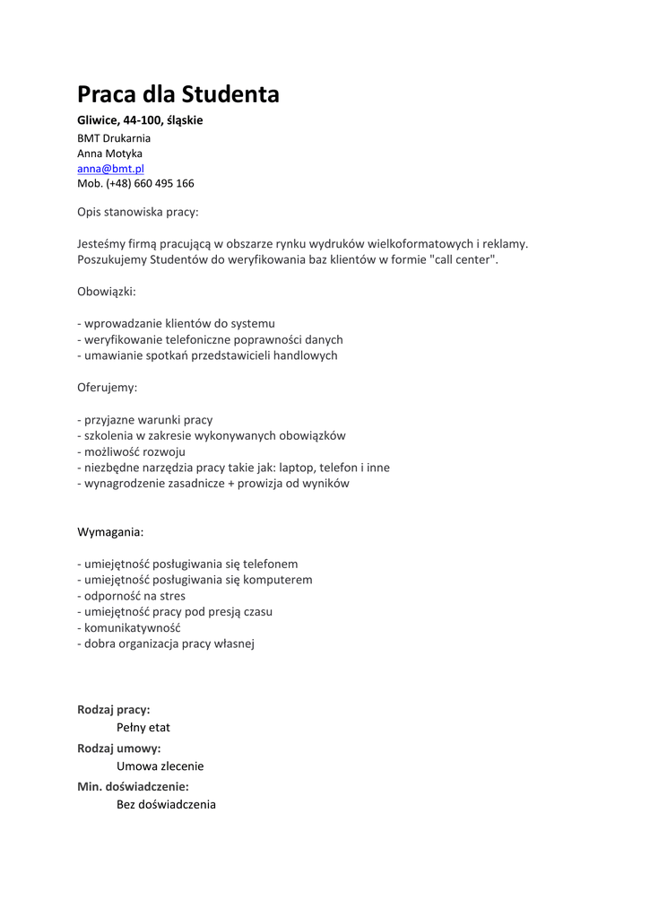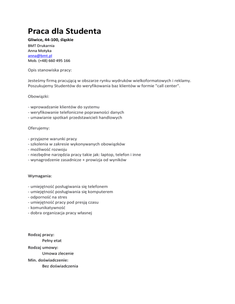 Praca dla Studenta Gliwice, 44-100, śląskie BMT Drukarnia Anna Motyka [email protected] Mob. (+48) 660 495 166 Opis stanowiska pracy: Jesteśmy firmą pracującą w obszarze rynku wydruków wielkoformatowych i reklamy. Poszukujemy Studentów do weryfikowania baz klientów w formie "call center". Obowiązki: - wprowadzanie klientów do systemu - weryfikowanie telefoniczne poprawności danych - umawianie spotkań przedstawicieli handlowych Oferujemy: - przyjazne warunki pracy - szkolenia w zakresie wykonywanych obowiązków - możliwość rozwoju - niezbędne narzędzia pracy takie jak: laptop, telefon i inne - wynagrodzenie zasadnicze + prowizja od wyników Wymagania: - umiejętność posługiwania się telefonem - umiejętność posługiwania się komputerem - odporność na stres - umiejętność pracy pod presją czasu - komunikatywność - dobra organizacja pracy własnej Rodzaj pracy: Pełny etat Rodzaj umowy: Umowa zlecenie Min. doświadczenie: Bez doświadczenia
