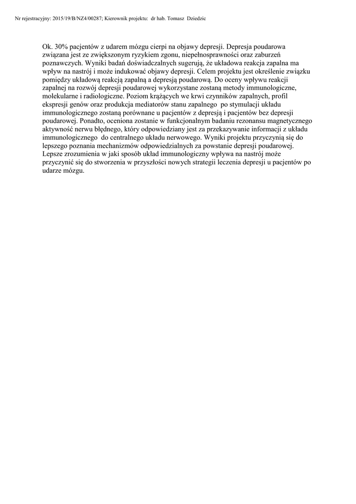 Nr rejestracyjny: 2015/19/B/NZ4/00287; Kierownik projektu: dr hab. Tomasz Dziedzic Ok. 30% pacjentów z udarem mózgu cierpi na objawy depresji. Depresja poudarowa związana jest ze zwiększonym ryzykiem zgonu, niepełnosprawności oraz zaburzeń poznawczych. Wyniki badań doświadczalnych sugerują, że układowa reakcja zapalna ma wpływ na nastrój i może indukować objawy depresji. Celem projektu jest określenie związku pomiędzy układową reakcją zapalną a depresją poudarową. Do oceny wpływu reakcji zapalnej na rozwój depresji poudarowej wykorzystane zostaną metody immunologiczne, molekularne i radiologiczne. Poziom krążących we krwi czynników zapalnych, profil ekspresji genów oraz produkcja mediatorów stanu zapalnego po stymulacji układu immunologicznego zostaną porównane u pacjentów z depresją i pacjentów bez depresji poudarowej. Ponadto, oceniona zostanie w funkcjonalnym badaniu rezonansu magnetycznego aktywność nerwu błędnego, który odpowiedziany jest za przekazywanie informacji z układu immunologicznego do centralnego układu nerwowego. Wyniki projektu przyczynią się do lepszego poznania mechanizmów odpowiedzialnych za powstanie depresji poudarowej. Lepsze zrozumienia w jaki sposób układ immunologiczny wpływa na nastrój może przyczynić się do stworzenia w przyszłości nowych strategii leczenia depresji u pacjentów po udarze mózgu.