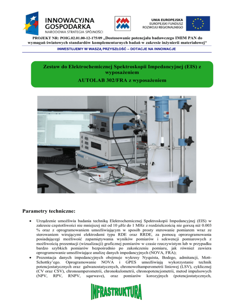 PROJEKT NR: POIG.02.01.00-12-175/09 „Dostosowanie potencjału badawczego IMIM PAN do wymagań światowych standardów komplementarnych badań w zakresie inżynierii materiałowej" INWESTUJEMY W WASZĄ PRZYSZŁOŚĆ – DOTACJE NA INNOWACJE Zestaw do Elektrochemicznej Spektroskopii Impedancyjnej (EIS) z wyposażeniem AUTOLAB 302/FRA z wyposażeniem Parametry techniczne: Urządzenie umożliwia badania techniką Elektrochemicznej Spektroskopii Impedancyjnej (EIS) w zakresie częstotliwości nie mniejszej niż od 10 μHz do 1 MHz z rozdzielczością nie gorszą niż 0.003 % oraz z oprogramowaniem umożliwiającym w sposób prosty sterowanie pomiarem wraz ze sterowaniem wirującymi elektrodami typu RDE oraz RRDE, za pomocą oprorogramowania posiadającegi możliwość zapamiętywania wyników pomiarów i sekwencji pomiarowych z możliwością prezentacji (wizualizacji) graficznej pomiarów w czasie rzeczywistym lub w przypadku bardzo szybkich pomiarów bezpośrednio po zakończeniu pomiaru, jak również zawiera oprogramowanie umożliwiające analizę danych impedancyjnych (NOVA, FRA); Prezentacja danych impedancyjnych obejmuje wykresy Nyquista, Bodego, admitancji, MottSchottky’ego. Oprogramowanie NOVA i GPES umożliwiają wykorzystanie technik potencjostatycznych oraz galwanostatycznych, chronowoltamperometrii liniowej (LSV), cyklicznej (CV oraz CSV), chronoamperometrii, chronokulometrii, chronopotencjometrii, metod impulsowych (NPV, RPV, RNPV, sqarwave), oraz pomiarów korozyjnych (potencjostatycznych, Elektrochemiczny Mikroskop ze Skanującą Sondą (EC-SPM) potencjodynamicznych, galwanostatycznych, galwanodynamicznych, potencjału korozyjnego, analizy Tafela) i innych. Oprogramowanie do analizy danych impedancyjnych NOVA/FRA umożliwiają symulację obwodów zastępczych wraz z możliwością dopasowywania parametrów obwodów do danych doświadczalnych; Warunki licencyjne dla dostarczonego oprogramowania umożliwiają na wykorzystanie oprogramowanie również w badaniach prowadzonych komercyjnie (w ZLB) i bezpłatną aktualizację w okresie gwarancyjnym; urządzenie umożliwia pracę w układzie, z co najmniej dwu, trój- oraz czteroelektrodowym układem pomiarowym, również jako bipotencjostat z możliwością zasilania wirującej elektrody z pierścieniem (pomiar z co najmniej dwoma niezależnymi elektrodami pracującymi i możliwością skanowania potencjałowego jednej z elektrod). prąd maksymalny urządzenia jest w zakresie : -2 A do 2 A, napięcie maksymalne między elektrodą pracującą i przeciwelektrodą w zakresie -30V do 30V. urządzenie posiada funkcję automatycznego przełączania zakresów prądowych w trakcie pomiarów (9 zakresów pomiarowych), całkowity zakres pomiaru prądu jest nie mniejszy niż: 10nA-1A, dokładność pomiaru prądu, co najmniej ± 0.2% zakresu prądu, rozdzielczość co najmniej 0.0003 % zakresu dla zakresów powyżej 10nA); urządzenie posiada analogowy integrator ze stałymi czasowymi, co najmniej 0.01 s, 0.1 s oraz 1 s. impedancja wejściowa elektrometru jest większa od 1T, zakres pracy elektrody badanej jest nie mniejszy niż -10 V do +10V (z rozdzielczością ok. 150μV, dokładnością +/- 2mV); maksymalna szybkość narastania napięcia większa niż: 200 V/s (co najmniej 100mV/s z aktywną korekcją); pasmo przenoszenia: >1 MHz dla potencjostatu oraz >4 MHz dla elektrometru; metody kompensacji iR: CI (Current Interrupt), PF (Positive Feedback) oraz dynamiczna korekcja iR. interfejs łączący zestaw z komputerem sterującym: USB; możliwość synchronicznego pomiaru dowolnych sygnałów analogowych (+/-10V) w tym możliwość podłączenia mikrowagi kwarcowej UELKO (synchroniczne wejście sygnału analogowego +/-10V wykorzystywane przez oprogramowanie potencjostatu/galwanostatu); wyposażenie do techniki EHIS (ElectroHydrodynamic Impedance Spectroscopy) z elektrodą wirująca sterowaną za pomocą oprogramowania urządzenia EIS (RDE/RRDE firmy PINE) . reaktory szklane do pomiarów EIS: sterowanie i akwizycja danych przy użyciu komputera osobistego typu PC z monitorem (możliwość kolorowych wydruków z drukarką laserową) urządzenie posiada procedurę certyfikacji polegającą na potwierdzeniu, że urządzenie ma deklarowane parametry techniczne (w tym zachowaną liniowość w trybie galwanostatu i potencjostatu) w oparciu o certyfikowany multimetr i certyfikowane naczyńko zastępcze (nowe urządzenie zostało dostarczone z certyfikatem jakości); urządzenie zawierać niezbędne okablowanie; zasilanie 230 V, 50Hz; Kontakt: Dr hab. Piotr Ozga, prof. PAN Instytut Metalurgii i Inżynierii Materiałowej Polska Akademia Nauk ul. Reymonta 25, 30-059 Kraków tel: +48 12 29 52 818; fax: +48 12 29 52 804; [email protected]