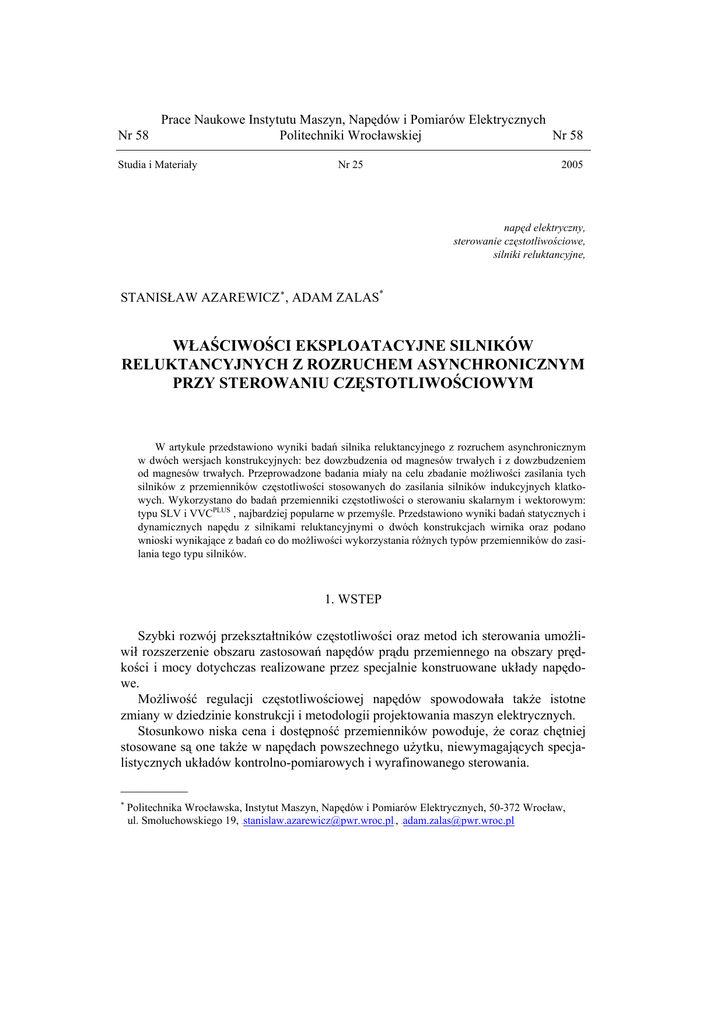 Nr 58 Prace Naukowe Instytutu Maszyn, Napędów i Pomiarów Elektrycznych Politechniki Wrocławskiej Nr 58 Studia i Materiały Nr 25 2005 napęd elektryczny, sterowanie częstotliwościowe, silniki reluktancyjne, STANISŁAW AZAREWICZ ∗ , ADAM ZALAS* F F WŁAŚCIWOŚCI EKSPLOATACYJNE SILNIKÓW RELUKTANCYJNYCH Z ROZRUCHEM ASYNCHRONICZNYM PRZY STEROWANIU CZĘSTOTLIWOŚCIOWYM W artykule przedstawiono wyniki badań silnika reluktancyjnego z rozruchem asynchronicznym w dwóch wersjach konstrukcyjnych: bez dowzbudzenia od magnesów trwałych i z dowzbudzeniem od magnesów trwałych. Przeprowadzone badania miały na celu zbadanie możliwości zasilania tych silników z przemienników częstotliwości stosowanych do zasilania silników indukcyjnych klatkowych. Wykorzystano do badań przemienniki częstotliwości o sterowaniu skalarnym i wektorowym: typu SLV i VVCPLUS , najbardziej popularne w przemyśle. Przedstawiono wyniki badań statycznych i dynamicznych napędu z silnikami reluktancyjnymi o dwóch konstrukcjach wirnika oraz podano wnioski wynikające z badań co do możliwości wykorzystania różnych typów przemienników do zasilania tego typu silników. 1. WSTEP Szybki rozwój przekształtników częstotliwości oraz metod ich sterowania umożliwił rozszerzenie obszaru zastosowań napędów prądu przemiennego na obszary prędkości i mocy dotychczas realizowane przez specjalnie konstruowane układy napędowe. Możliwość regulacji częstotliwościowej napędów spowodowała także istotne zmiany w dziedzinie konstrukcji i metodologii projektowania maszyn elektrycznych. Stosunkowo niska cena i dostępność przemienników powoduje, że coraz chętniej stosowane są one także w napędach powszechnego użytku, niewymagających specjalistycznych układów kontrolno-pomiarowych i wyrafinowanego sterowania. __________ ∗ Politechnika Wrocławska, Instytut Maszyn, Napędów i Pomiarów Elektrycznych, 50-372 Wrocław, ul. Smoluchowskiego 19, [email protected] , [email protected] HU UH HU U Tendencja ta stawia przed realizatorami napędów nowe zadania, a przede wszystkim wymagania co do prostoty sterowania i energooszczędności układu. Jednym z istotniejszych problemów do rozwiązania w napędzie indukcyjnym sterowanym częstotliwościowo jest odtwarzanie prędkości w układach, w których z różnych powodów nie może być stosowany jej pomiar. Rozwiązaniem problemu dla napędów powszechnego użytku sterowanych częstotliwościowo może być zastosowanie silników reluktancyjnych z rozruchem asynchronicznym. Silniki te łączą w sobie cechy klasycznego silnika indukcyjnego klatkowego i silnika reluktancyjnego. Rozruch tych silników odbywa się w sposób analogiczny jak silnika klatkowego, a przy sprzyjającym momencie obciążenia silnik ulega synchronizacji i dalej pracuje jako synchroniczny z prędkością proporcjonalną do częstotliwości napięcia zasilającego [3]. Serie informacyjne silników reluktancyjnych małej mocy zrealizowano w Zakładach „Besel”. Silniki reluktancyjne wykonano na bazie silników indukcyjnych klatkowych dokonując odpowiednich zmian w konstrukcji wirnika [8]. Na rysunku 1 przedstawiono silniki reluktancyjne małej mocy z dodatkowymi magnesami trwałymi i bez magnesów. a) b) Rys.1. Schematy magnetowodów silników reluktancyjnych: a) bez dowzbudzenia od magnesów trwałych: 1 – blacha wirnika, 2 – blacha stojana, 3 i 4 – małe i duże pręty uzwojenia wirnika, 5 – uzwojenie stojana, b) z dowzbudzeniem od magnesów trwałych. Fig.1. Diagram of reluctance motor magnetic circuits a) with no permanent magnet excitation: 1 – rotor sheet, 2 – stator sheet, 3 and 4 – small and large rotor winding bars, 5 – stator winding, b) with permanent magnet excitation. Zmiana konstrukcji wirnika, a przede wszystkim wprowadzenie dodatkowych magnesów trwałych, wpływa na parametry eksploatacyjne tych silników, zarówno przy zasilaniu z sieci jak i przy zasilaniu z przemienników częstotliwości. Poznanie zjawisk zachodzących w tego typu silnikach oraz wybranie optymalnej metody sterowania falownikiem MSI dla tych silników ma istotne znaczenie zarówno eksploatacyjne, jak również dostarczy niezbędnych informacji do optymalizacji ich konstrukcji. 2. MOMENT ELEKTROMAGNETYCZNY SILNIKÓW RELUKTANCYJNYCH O ROZRUCHU ASYCHRONICZNYM Ze względu na dwie odmiany konstrukcji silników [2], bez dowzbudzenia od magnesów trwałych i z dowzbudzeniem od magnesów trwałych w wirniku, moment elektromagnetyczny dla maszyn bez dowzbudzenia wyrazi się zależnością : M Re l = 3U sin δ ω0 X d ⎛ Xd ⎞ ⎜ − 1⎟U cos δ ⎜X ⎟ ⎝ q ⎠ (1) natomiast dla maszyn z dowzbudzeniem zależnością: Me = ⎛U * E ⎞ U 2 Xd − Xq *⎜ * sin δ + * * sin 2δ ⎟ ⎟ ω 0 ⎜⎝ X d 2 Xd * Xq ⎠ 3 (2) gdzie: U – napięcie fazowe sieci zasilającej, If – składowa prądu generowana w uzwojeniu stojana, Xd, Xq – reaktancje w osiach podłużnej i poprzecznej, δ – kąt mocy, E – wartość skuteczna napięcia indukowanego w fazie uzwojenia twornika przez wirujące magnesy trwałe, ω0 – synchroniczna prędkość obrotowa silnika. Różnice rozwiązań konstrukcyjnych skutkują także różnicami w przebiegu charakterystyki kątowej momentu tych silników. Rys.2. Przykładowa charakterystyka kątowa momentu silnika reluktancyjnego bez dowzbudzenia od magnesów trwałych. Fig. 2. Exemplary angle characteristisc of reluctance motor torque with no permanent magnet excitation. Rys.3 Charakterystyka momentu silnika synchronicznego (LSPMSM) w funkcji kąta mocy, Ts = f(δ). Fig. 3. Synchronous motor torque characteristis (LSPMSM) in function of power angle Ts = f(δ). 3. BADANIA SILNIKÓW RELUKTANCYJNYCH O ROZRUCHU ASYNCHRONICZNYM PRZY STEROWANIU CZĘSTOTLIWOŚCIOWYM W przemyśle stosowane są trzy podstawowe konstrukcje przemienników częstotliwości: o sterowaniu skalarnym, o sterowaniu wektorowym i bezpośrednim sterowaniu momentem silnika indukcyjnego