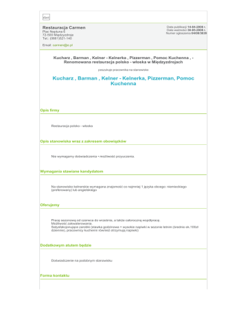 praca, oferty pracy Data publikacji 14-04-2008 r. Data ważności 30-05-2008 r. Numer ogłoszenia 04/08/3839 Restauracja Carmen Plac Neptuna 6 72-500 Międzyzdroje Tel.: (0661)521-140 Email: [email protected] Kucharz , Barman , Kelner - Kelnerka , Pizzerman , Pomoc Kuchenna , Renomowana restauracja polsko - włoska w Międzyzdrojach poszukuje pracownika na stanowisko Kucharz , Barman , Kelner - Kelnerka, Pizzerman, Pomoc Kuchenna Opis firmy Restauracja polsko - włoska Opis stanowiska wraz z zakresem obowiązków Nie wymagamy doświadczenia • możliwość przyuczenia. Wymagania stawiane kandydatom Na stanowisko kelnerskie wymagana znajomość co najmniej 1 języka obcego: niemieckiego (preferowany) lub angielskiego Oferujemy Pracę sezonową od czerwca do września, a także całoroczną współpracę. Możliwość zakwaterowania. Satysfakcjonujące zarobki (stawka godzinowa + wysokie napiwki w sezonie letnim (średnio ok.100zł dziennie), pracownicy kuchenni również otrzymują napiwki) Dodatkowym atutem będzie Doświadczenie na podobnym stanowisku Forma kontaktu Cv (na stanowisko kelnerskie wraz ze zdjęciem) proszę wysyłać na adres Cv (na stanowisko kelnerskie wraz ze zdjęciem) proszę wysyłać na adres [email protected] lub kontakt tel. 0661 521 140 Informacje dodatkowe Minimalne wykształcenie: dowolne Branża: Hotele i Restauracje Forma zatrudnienia: zlecenie Wymiar pracy: pełny etat Wynagrodzenie (netto): nie podano Lokalizacja: Polska Województwo: wszystkie, Miejsce pracy miasto(a) lub kraj(e): Międzyzdroje Prawo jazdy: Znajomość języka obcego: Ogłoszenie pochodzi z portalu www.i-praca.pl - Internetowy Portal Pracy ilość wyświetleń: 25005