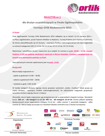 BIULETYN nr 1 dla drużyn uczestniczących w Finale Ogólnopolskim Turnieju Orlik Basketmania 2015 O finale Finał Ogólnopolski Turnieju Orlik Basketmania 2015 odbędzie się w dniach 12-14 czerwca 2015 r. na Placu Jagiellońskim, przed Teatrem Wielkim w Radomiu. Turniej finałowy jest imprezą trzydniową, do której zakwalifikowały się 32 drużyny – zwycięzcy finałów makroregionalnych (8 makroregionów) w czterech kategoriach (DZ 11-12 lat, DZ 13-14 lat, CH 11-12 lat, CH 13-14 lat). Rejestracja i weryfikacja drużyn rozpocznie się w piątek 12 czerwca w godz. 09:00 – 11:30. Uwaga! Godzina 11:30 jest godziną zamknięcia rejestracji w Biurze Zawodów. Prosimy o uwzględnienie tej kwestii przy planowaniu podróży na Finał. Start pierwszych meczów zaplanowany jest na godz. 12.00. Rozgrywki Mecze będą rozgrywane w: - piątek w godzinach 12:00 – 18:00, - sobota w godzinach 9:00 – 18:00, - niedziela w godz. 9.00-16.00. W każdej kategorii drużyny zagrają mecze grupowe systemem „każdy z każdym” (dwie grupy po cztery drużyny - zwycięzcy finałów makroregionalnych). Po zakończeniu rozgrywek grupowych wszystkie drużyny zagrają mecze o miejsca. Wszystkie mecze będą rozgrywane wg przepisów gry jak w poprzednich etapach turnieju. Wysokość koszy: 260 cm – dla kategorii 11-12 lat, 305 cm - dla kategorii 13-14 lat. Gramy piłkami Spalding dostarczonymi przez organizatora (chłopcy 13-14 lat – piłka rozmiar 7, pozostałe kategorie - piłka rozmiar 6). Mecze będą się toczyły na 3 boiskach (boisko centralne oraz 2 boiska turniejowe). W przypadku opadów deszczu rozgrywki odbędą się w halach sportowych. Wszystkie drużyny zobowiązane są do występów w strojach meczowych firmy Zina otrzymanych za zwycięstwo w finałach makroregionalnych. Stroje te zostaną przekazane uczestnikom podczas rejestracji w Biurze Zawodów. Rejestracja drużyn Zasady rejestracji drużyn obowiązujące podczas Finału Ogólnopolskiego: Każdy zespół biorący udział w finale ogólnopolskim przed startem w turnieju zostanie zweryfikowany w Biurze Zawodów. Opiekun/Trener musi okazać wszystkie wymagane dokumenty wymienione w §3 Regulaminu Turnieju Orlik Basketmania 2015. Ponadto tożsamość każdego zawodnika będzie sprawdzana indywidualnie na podstawie okazanego dokumentu ze zdjęciem, którego numer widnieje w Formularzu Zgłoszeń (weryfikacja bezpośrednia). Brak tego dokumentu i/lub oświadczenia rodziców w momencie weryfikacji skutkuje odsunięciem zawodnika od udziału w dalszych rozgrywkach turnieju Orlik Basketmania 2015. Wszystkie formularze zgłoszeń dostarczone podczas finałów makroregionalnych będą dostępne na miejscu w Biurze Zawodów. Jeżeli Opiekunowie/Trenerzy nie przewidują zmian w składach drużyn, nie muszą dostarczać ponownie wypełnionego zgłoszenia. Zalecamy, aby w składzie drużyny znalazło się 10 zawodników/-czek. Jeżeli zespół wcześniej składał się z mniejszej liczby graczy, może zgłosić dodatkowych zawodników do drużyny przestrzegając zasad zawartych w §3 Regulaminu Turnieju. Wszystkie drużyny są zobowiązane do pisemnego potwierdzenia uczestnictwa w turnieju. Potwierdzenie uczestnictwa, a także wszelkie zmiany zawodników należy przesłać e-mailem do Biura Turnieju ([email protected]) w nieprzekraczalnym terminie do 9 czerwca 2015 do godz. 16.00 , ze względu na konieczność przeprowadzenia rezerwacji hotelowej, a także weryfikacji nowych zawodników. Należy podać imię i nazwisko, a także PESEL nowych zawodników wraz z informacją kogo dany zawodnik/zawodniczka zastępuje. W przypadku pytań lub wątpliwości prosimy kontaktować się z Dyrektorem Sportowym p. Katarzyną Miłobędzką - ([email protected]). Ryczałty za dojazdy (kwoty brutto) Drużyny biorące udział w Finale Turnieju Orlik Basketmania 2015 mają możliwość skorzystania z dofinansowania zgodnie z poniższą tabelą kosztów przejazdu: drużyny miejscowe 0,00 PLN do 50 km 200,00 PLN 51-100 km 300,00 PLN 101-150 km 400,00 PLN 151-200 km 500,00 PLN 201-250 km 600,00 PLN 251-300 km 700,00 PLN 301-350 km 800,00 PLN 351 – 400 km 900,00 PLN 401 – 500 km 1000,00 PLN 501 - 600 km 1100,00 PLN 601 km i więcej 1200,00 PLN Kryterium wymierzenia odległości jest najkrótsza trasa drogowa w jedną stronę (drużyna może otrzymać maksymalnie 1200 PLN brutto). Podstawą rozliczenia jest faktura, rachunek lub nota księgowa wystawione tytułem: „przewóz osób, przejazd drużyny (nazwa + kategoria: SP lub GIM, dziewczynki, chłopcy), na Finał Turnieju Orlik Basketmania w terminie...”. Wymienione dokumenty księgowe muszą być wystawione na Fundację „Koszykówka Polska”. Fundacja zapewnia możliwość rozliczenia dokumentów gotówką na miejscu podczas turnieju finałowego. Istnieje również możliwość rozliczenia dokumentów przelewem na konto bankowe. W przypadku zakupu biletów PKP lub PKS faktura nie może przekraczać przyznanego dofinansowania na podstawie odległości mierzonej najkrótszą trasą drogową zgodnie z zatwierdzoną tabelą. Wraz z fakturą należy przesłać oświadczenie o poniesionych wydatkach z tytułu zakupionych biletów, podając nazwę drużyny i kategorię wiekową, a także numer konta, na które należy dokonać przelewu. Wszelkie pytania dot. rozliczeń prosimy kierować do p. Aleksandry Rzeźniczek ([email protected]) – Zakwaterowanie Organizator zapewnia drużynom zakwaterowanie w hotelach. Wszystkie drużyny mają możliwość skorzystania z dwóch noclegów z 12/13 i 13/14 czerwca 2015 r. Dla każdego zespołu jest zarezerwowanych 12 miejsc noclegowych w pokojach dwu, trzy lub wieloosobowych (10 zawodników, 1 trener/opiekun drużyny, 1 kierowca/trener asystent). Szczegółowy podział hoteli i dane adresowe hotelów zostaną przesłane zainteresowanym drużynom drogą mailową. Wyżywienie i napoje Posiłki (obiad i kolacja 12.06, obiad i kolacja 13.06, obiad 14.06) będą serwowane na pla