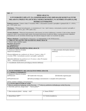 DO - 2 DEKLARACJA O WYSOKOŚCI OPŁATY ZA GOSPODAROWANIE ODPADAMI KOMUNALNYMI SKŁADANA PRZEZ WŁAŚCICIELI NIERUCHOMOŚCI, NA KTÓREJ ZNAJDUJĄ SIĘ DOMKI LETNISKOWE Podstawa prawna: Ustawa z dnia 13 września 1996r. o utrzymaniu czystości i porządku w gminach (Dz. U. z 2013r., poz. 1399 z późn. zm.). Składający: Właściciel nieruchomości, w rozumieniu art. 2 ust. 1 pkt 4 ustawy o utrzymaniu czystości i porządku w gminach (Dz. U. z 2013r., poz. 1399 z późn. zm.). Termin składania: Właściciel nieruchomości zobowiązany jest złożyć deklarację w terminie 14 dni od dnia zdarzeń mających wpływ na powstanie bądź ustanie obowiązku ponoszenia ryczałtowej opłaty za gospodarowanie odpadami komunalnymi za rok od domku letniskowego lub zdarzeń mających wpływ na wysokość tej opłaty. Miejsce składania: Urząd Miejski w Kruszwicy, ul. Nadgoplańska 4, 88-150 Kruszwica. A. ORGAN WŁAŚCIWY DO ZŁOŻENIA DEKLARACJI 1. Nazwa i adres siedziby organu Burmistrz Kruszwicy ul. Nadgoplańska 4 88-150 Kruszwica B. OBOWIĄZEK ZŁOŻENIA DEKLARACJI 2. Zaznaczyć właściwy kwadrat: pierwsza deklaracja 3. Data powstania obowiązku złożenia deklaracji nowa deklaracja (na podstawie art. 6m ust. 2 ustawy z dnia 13 września 1996r. o utrzymaniu czystości i porządku w gminach) ……………….-……………….-………………. korekta deklaracji (na podstawie art. 81 ustawy z dnia 29 sierpnia 1997r. – Ordynacja podatkowa) 4. Uzasadnienie okoliczności powodującej złożenie deklaracji C. DANE PODMIOTU SKŁADAJĄCEGO DEKLARACJĘ C.1. RODZAJ PODMIOTU 5. Zaznaczyć właściwy kwadrat: Właściciel Użytkownik wieczysty Współwłaściciel Osoba posiadająca nieruchomość w zarządzie lub użytkowaniu Jednostka organizacyjna Inny podmiot władający nieruchomością C.2. DANE IDENTYFIKACYJNE * dotyczy podmiotu będącego osobą fizyczną / ** dotyczy podmiotu niebędącego osobą fizyczną 6. Nazwisko, pierwsze, drugie imię* / Nazwa pełna** 7. Data urodzenia (dzień – miesiąc – rok)* 8. Numer PESEL* 9. Identyfikator NIP** 10. Telefon kontaktowy C.3. ADRES ZAMIESZKANIA* / ADRES SIEDZIBY** 11. Kraj 12. Województwo 13. Powiat 14. Gmina 15. Ulica 16. Nr domu 18. Miejscowość 19. Kod pocztowy 20. Poczta 17. Nr lokalu C.4. ADRES DO KORESPONDENCJI Wypełnić, jeżeli adres do korespondencji jest inny niż adres w części C.3. 21. Kraj 22. Województwo 23. Powiat 24. Gmina 25. Ulica 26. Nr domu 28. Miejscowość 29. Kod pocztowy 30. Poczta 27. Nr lokalu D. ADRES NIERUCHOMOŚCI, DLA KTÓREJ SKŁADANA JEST DEKLARACJA 31. Miejscowość, ulica 32. Nr ewidencyjny działki z rejestru gruntów E. USTALENIE WYSOKOŚCI OPŁATY ZA GOPODAROWANIE ODPADAMI KOMUNALNYMI 33. Na terenie nieruchomości wskazanej w części D niniejszej deklaracji znajduje się: …………………………………………………… (należy podać ilość domków letniskowych) 34. Wyliczenie ryczałtowej opłaty za gospodarowanie odpadami komunalnymi za rok od domku letniskowego: .………………………………………………………X.………………………………………………………=.……………………………………………………… (ilość domków letniskowych) (stawka opłaty) (iloczyn ilości domków letniskowych i stawki opłaty) (słownie: …………………………………………………………………………………………………………….……………………………………………………………….) F. INFORMACJA O ZAŁĄCZNIKACH G. PODPIS SKŁADAJĄCEGO DEKLARACJĘ 35. Data wypełnienia deklaracji 36. Czytelny podpis H. ADNOTACJE ORGANU POUCZENIE Niniejsza deklaracja stanowi podstawę do wystawienia tytułu wykonawczego, zgodnie z przepisami ustawy z dnia 17 czerwca 1966r. o postepowaniu egzekucyjnym w administracji (Dz. U. z 2014r. poz. 1619 z późn. zm.) OBJAŚNIENIA 1. Deklarację należy wypełnić ręcznie lub komputerowo, drukowanymi literami, niebieskim lub czarnym kolorem. 2. Przez właściciela nieruchomości zgodnie z art. 2 ust. 1 pkt 4 ustawy o utrzymaniu czystości i porządku w gminach (Dz. U. z 2013r., poz. 1399 z późn. zm.), rozumie się także współwłaścicieli, użytkowników wieczystych oraz jednostki organizacyjne i osoby posiadające nieruchomości w zarządzie lub użytkowaniu, a także inne podmioty władające nieruchomością. 3. Jeżeli nieruchomość znajduje się we współwłasności do deklaracji należy dołączyć odpowiednią ilość załączników określających dane każdego współwłaściciela. 4. Wyjaśnienie pojęć: a) pole „pierwsza deklaracja” należy zaznaczyć znakiem „X” w przypadku złożenia deklaracji po raz pierwszy; b) pole „nowa deklaracja” należy zaznaczyć znakiem „X” w przypadku złożenia deklaracji z uwagi na zmianę danych określonych w deklaracji, będących podstawą ustalenia wysokości należnej opłaty; c) pole „korekta deklaracji” należy zaznaczyć znakiem „X” w przypadku złożenia deklaracji z uwagi na nieprawidłowo wypełnioną uprzednio złożoną już pierwszą lub nową deklaracje; d) przez pojęcie domku letniskowego, należy rozumieć nieruchomości „letniskowe” wykorzystywane w celu czasowego przebywania w związku z wypoczynkiem. 5. Dla każdej nieruchomości, na której znajdują się domki letniskowe należy złożyć odrębną deklarację. ZDO - 2 ZAŁĄCZNIK DO DEKLARACJI O WYSOKOŚCI OPŁATY ZA GOSPODAROWANIE ODPADAMI KOMUNALNYMI SKŁADANEJ PRZEZ WŁAŚCICIELI NIERUCHOMOŚCI, NA KTÓREJ ZNAJDUJĄ SIĘ DOMKI LETNISKOWE A. DANE IDENTYFIKACYJNE WSPÓŁWŁAŚCICIELA NIERUCHOMOŚCI * dotyczy podmiotu będącego osobą fizyczną / ** dotyczy podmiotu niebędącego osobą fizyczną 1. Nazwisko, pierwsze, drugie imię* / Nazwa pełna** 2. Data urodzenia (dzień – miesiąc – rok)* 3. Numer PESEL* 4. Identyfikator NIP** 5. Telefon kontaktowy B. ADRES ZAMIESZKANIA* / ADRES SIEDZIBY** WSPÓŁWŁAŚCICIELA NIERU