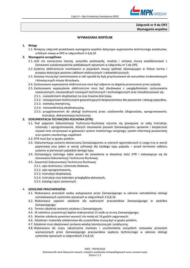Część III – Opis Przedmiotu Zamówienia (OPZ) Załącznik nr 9 do OPZ Wymagania wspólne WYMAGANIA WSPÓLNE 1. 2. 3. 4. Wstęp 1.1. Niniejszy załącznik przedstawia wymagania wspólne dotyczące wyposażenia technicznego autobusów, o którym mowa w OPZ w załącznikach 2-6,8,10. Wymagania szczegółowe 2.1. Jeśli nie zaznaczono inaczej, wszystkie podzespoły, moduły i zestawy muszą współpracować z Zestawami autokomputerów pokładowych opisanymi w załączniku nr 5 do OPZ. 2.2. Systemy elektroniczne montowane w pojazdach muszą spełniać obowiązujące w Polsce normy i przepisy dotyczące poziomu zakłóceń elektrycznych i radioelektrycznych. 2.3. Zestawy muszą być zamontowane w taki sposób by były przystosowane do warunków środowiskowych i klimatycznych miasta Wrocławia. 2.4. Zastosowane wyposażenie elektroniczne musi być odporne na drgania przenoszone przez pojazdy. 2.5. Zastosowane wyposażenie elektroniczne musi być zbudowane z uwzględnieniem zastosowania nowoczesnych, niezawodnych rozwiązań technicznych i technologicznych oraz charakteryzować się: 2.5.1. czasookresem eksploatacji na czas trwania dzierżawy, 2.5.2. rozwiązaniami technicznymi gwarantującymi bezpieczeństwo dla pasażerów i obsługi pojazdów, 2.5.3. estetyką zewnętrzną, 2.5.4. niezawodnością eksploatacyjną, 2.5.5. przygotowaniem do obsługi technicznej przez użytkownika (diagnostyka, oprogramowanie, instrukcje, dokumentacja techniczna). DOKUMENTACJA TECHNICZNO-RUCHOWA (DTR): 3.1. Pod pojęciem Dokumentacji Techniczno-Ruchowej rozumie się powiązane ze sobą instrukcje, schematy i oprogramowanie, których stosowanie pozwoli Zamawiającemu sprawnie i bezpiecznie używać oraz utrzymywać w gotowości system monitoringu wizyjnego, system informacji pasażerskiej oraz system monitoringu napełnień. 3.2. DTR musi być w języku polskim. 3.3. Dokumentacja zostanie dostarczona Zamawiającemu w czterech egzemplarzach (z czego trzy w wersji papierowej oraz jeden w wersji cyfrowej) dla każdego typu pojazdu – przed terminem odbioru systemu w pierwszym pojeździe danego typu. 3.4. Zamawiający zastrzega sobie prawo do powielania w dowolnej ilości DTR i zobowiązuje się do stosowania Dokumentacji Techniczno-Ruchowej. 3.5. Zawartość Dokumentacji Techniczno-Ruchowej: 3.5.1. opis techniczny i schematy blokowe, 3.5.2. opis oprogramowania, 3.5.3. instrukcje eksploatacji, 3.5.4. instrukcje oraz kalendarz przeglądów planowych, 3.5.5. katalog części zamiennych. SZKOLENIE PRACOWNIKÓW: 4.1. Wykonawca przeszkoli osoby wytypowane przez Zamawiającego w zakresie samodzielnej obsługi zainstalowanych systemów opisanych w załącznikach 2-6,8,10. 4.2. Wykonawca zapewni szkolenie dla wybranych pracowników Zamawiającego w siedzibie Zamawiającego; 4.3. Termin szkolenia zostanie ustalony z Zamawiającym; 4.4. W szkoleniu uczestniczyć będzie maksymalnie 15 osób ze strony Zamawiającego; 4.5. Wymiar szkolenia powinien wynosić nie mniej niż 16 godzin zegarowych; 4.6. Szkolenie i materiały szkoleniowe dla uczestników muszą być w języku polskim; 4.7. Szkolenie musi obejmować zarówno wiedzę teoretyczną jak i praktyczną; 4.8. Wykonawca do czasu zakończenia montażu i uruchomienia wszystkich zestawów przeszkoli wyznaczonych przez Zamawiającego pracowników zaplecza technicznego w zakresie obsługi systemów opisanych w załącznikach 2-6,8,10. SIWZ – PN/44/2016 Dzierżawa 60 sztuk fabrycznie nowych, miejskich autobusów niskopodłogowych wraz z prawem opcji Strona 1 z 2 Część III – Opis Przedmiotu Zamówienia (OPZ) SIWZ – PN/44/2016 Dzierżawa 60 sztuk fabrycznie nowych, miejskich autobusów niskopodłogowych wraz z prawem opcji Strona 2 z 2