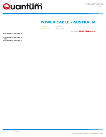 Quantum Qguar Sp. z o.o. ul. Walerego Sławka 3A Kraków POWER CABLE - AUSTRALIA Producent: Zebra EVM Dostępność: 1-4 tygodnie Cena netto: 43,63 PLN netto POWER CABLE - AUSTRALIA POWER CABLE - AUSTRALIA 94881 POWER CABLE - AUSTRALIA http://www.it-zakupy.pl wygenerowano przez program AptusShop