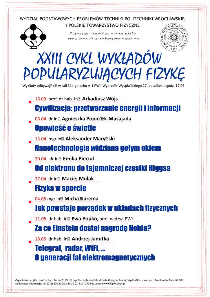 WYDZIAŁ PODSTAWOWYCH PROBLEMÓW TECHNIKI POLITECHNIKI WROCŁAWSKIEJ I POLSKIE TOWARZYSTWO FIZYCZNE Zaprasza uczniów, nauczycieli oraz innych zainteresowanych na XXIII CYKL WYKŁADÓW POPULARYZUJĄCYCH FIZYKĘ Wykłady odbywają się w sali 314 gmachu A-1 PWr, Wybrzeże Wyspiańskiego 27, początek o godz. 17.05 16.03 prof. dr hab. inż. Arkadiusz Wójs Cywilizacja: przetwarzanie energii i informacji 06.04 dr inż. Agnieszka Popiołek-Masajada Opowieść o świetle 13.04 mgr inż. Aleksander Maryński Nanotechnologia widziana gołym okiem 20.04 dr inż. Emilia Pieciul Od elektronu do tajemniczej cząstki Higgsa 27.04 dr inż. Maciej Mulak Fizyka w sporcie 04.05 mgr inż. Michał Jarema Jak powstaje porządek w układach fizycznych 11.05 dr hab. inż. Ewa Popko, prof. nadzw. PWr Za co Einstein dostał nagrodę Nobla? 18.05 dr hab. inż. Andrzej Janutka Telegraf, radar, WiFi, ... O generacji fal elektromagnetycznych Organizatorzy cyklu: prof. dr hab. Antoni C. Mituś, mgr Maciej Muszyński, dr hab. Grzegorz Pawlik, Wydział Podstawowych Problemów Techniki PWr. Dodatkowe informacje: tel. (071) 320 20 20, 320 20 02, 320 4270 i na stronie www.if.pwr.wroc.pl