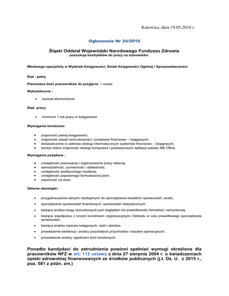 Katowice, dnia 19.05.2016 r. Ogłoszenie Nr 24/2016 Śląski Oddział Wojewódzki Narodowego Funduszu Zdrowia poszukuje kandydatów do pracy na stanowisko: Młodszego specjalisty w Wydziale Księgowości, Dziale Księgowości Ogólnej i Sprawozdawczości Etat : pełny Planowana ilość pracowników do przyjęcia: 1 osoba Wykształcenie : wyższe ekonomiczne Staż pracy: minimum 1 rok pracy w księgowości Wymagania konieczne: znajomość pełnej księgowości, znajomość zasad rachunkowości i przepisów finansowo – księgowych, doświadczenie w zakresie obsługi informatycznych systemów finansowo – księgowych, bardzo dobra znajomość obsługi komputera i podstawowych aplikacji pakietu MS Office. Wymagania pożądane : umiejętność planowania i organizowania pracy własnej, samodzielność, sumienność i dokładność, umiejętność analitycznego myślenia, umiejętność poprawnego formułowania pism, odporność na stres. Główne obowiązki : przygotowywanie danych niezbędnych do sporządzania wszelkich sprawozdań, analiz, sporządzanie sprawozdań finansowych, sprawozdań statystycznych, bieżąca analiza ksiąg rachunkowych pod względem ich prawidłowości formalnej i rachunkowej bieżąca współpraca z innymi komórkami organizacyjnymi Oddziału w celu prawidłowego sporządzania sprawozdań, bieżąca analiza zapisów księgowych, sald i obrotów, prowadzenie ewidencji i analizy pozostałych przychodów i kosztów operacyjnych, prowadzenie analizy zgodności kont kosztowych. Ponadto kandydaci do zatrudnienia powinni spełniać wymogi określone dla pracowników NFZ w art. 112 ustawy z dnia 27 sierpnia 2004 r. o świadczeniach opieki zdrowotnej finansowanych ze środków publicznych (j.t. Dz. U. z 2015 r., poz. 581 z późn. zm.) Wymagane dokumenty : list motywacyjny i życiorys (CV) opatrzony własnoręcznym podpisem dokumenty potwierdzające wykształcenie, odbyte kursy i szkolenia (kopie) kwestionariusz osobowy dla osoby ubiegającej się o pracę *wzór do pobrania dokumenty potwierdzające dotychczasowe zatrudnienie - świadectwa/o pracy (a w przypadku pozostawania w zatrudnieniu – aktualne zaświadczenie o zatrudnieniu) oświadczenia kandydata o: wyrażeniu zgody na przetwarzanie danych osobowych zawartych w ofercie pracy w zakresie niezbędnym do przeprowadzenia rekrutacji, korzystaniu w pełni z praw publicznych i o niekaralności za przestępstwo popełnione umyślnie oraz spełnieniu wymogów wynikających z art.112 ustawy z dnia 27 sierpnia 2004r. o świadczeniach opieki zdrowotnej finansowanych ze środków publicznych *wzór do pobrania Inne informacje : Aplikacje należy przesłać lub dostarczyć w terminie do 14 dni od daty ukazania się ogłoszenia na adres: Śląski Oddział Wojewódzki Narodowego Funduszu Zdrowia, 40-844 Katowice, ul. Kossutha 13 Wydział Organizacyjny, Kadr i Szkoleń, pokój 5.21a (Dokumenty należy składać w biurze podawczym na parterze) z dopiskiem: Oferta pracy Nr 24/2016 na stanowisko Młodszego specjalisty w Wydziale Księgowości, Dziale Księgowości Ogólnej i Sprawozdawczości. Informacje telefoniczne pod nr 32/735-15-68 Aplikacje niekompletne, niezgodne z wymogami zawartymi w ogłoszeniu oraz po upływie wyżej określonego terminu nie będą rozpatrywane (liczy się data wpływu do Śląskiego OW NFZ). Kandydaci spełniający wymogi formalne zostaną powiadomieni o terminie spotkania rekrutacyjnego. Dokumentów aplikacyjnych nie zwracamy. Informacja o wynikach naboru zostanie umieszczona w Biuletynie Informacji Publicznej na stronie www.nfz-katowice.pl oraz tablicy ogłoszeń w siedzibie Oddziału, Katowice, ul. Kossutha 13 V p.