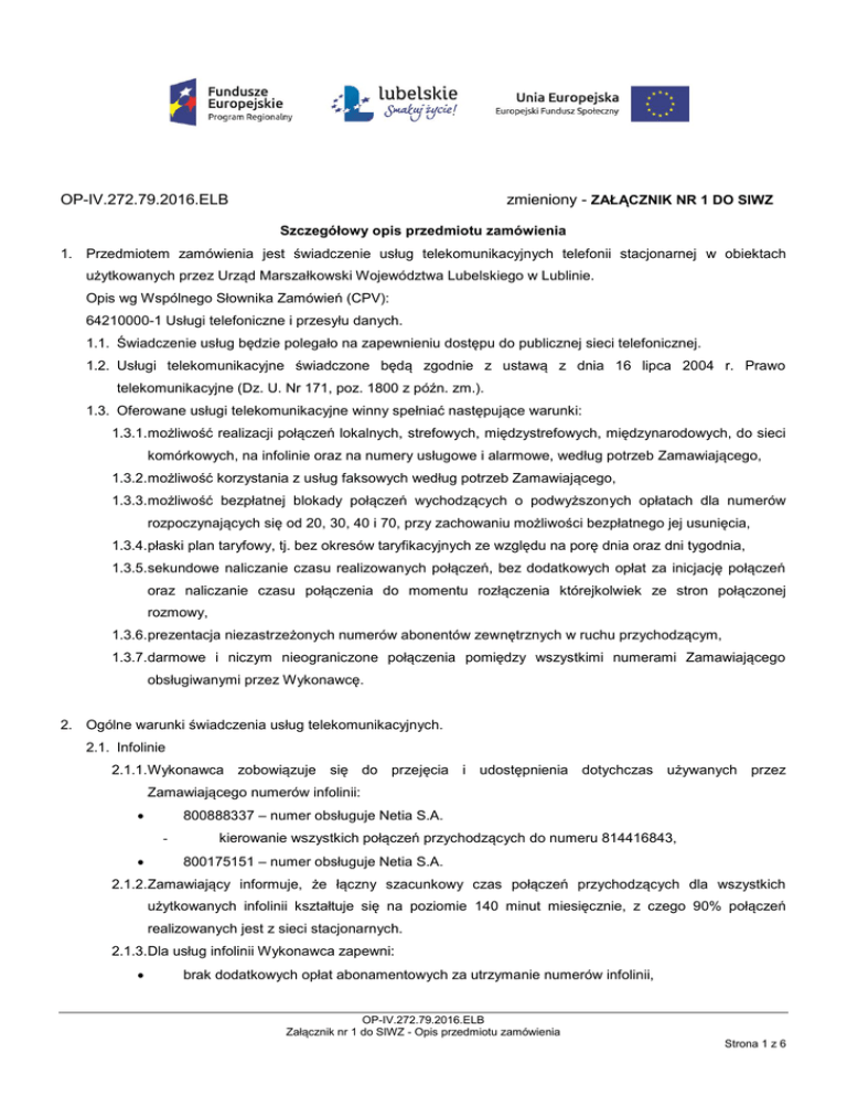 zmieniony - ZAŁĄCZNIK NR 1 DO SIWZ OP-IV.272.79.2016.ELB Szczegółowy opis przedmiotu zamówienia 1. Przedmiotem zamówienia jest świadczenie usług telekomunikacyjnych telefonii stacjonarnej w obiektach użytkowanych przez Urząd Marszałkowski Województwa Lubelskiego w Lublinie. Opis wg Wspólnego Słownika Zamówień (CPV): 64210000-1 Usługi telefoniczne i przesyłu danych. 1.1. Świadczenie usług będzie polegało na zapewnieniu dostępu do publicznej sieci telefonicznej. 1.2. Usługi telekomunikacyjne świadczone będą zgodnie z ustawą z dnia 16 lipca 2004 r. Prawo telekomunikacyjne (Dz. U. Nr 171, poz. 1800 z późn. zm.). 1.3. Oferowane usługi telekomunikacyjne winny spełniać następujące warunki: 1.3.1.możliwość realizacji połączeń lokalnych, strefowych, międzystrefowych, międzynarodowych, do sieci komórkowych, na infolinie oraz na numery usługowe i alarmowe, według potrzeb Zamawiającego, 1.3.2.możliwość korzystania z usług faksowych według potrzeb Zamawiającego, 1.3.3.możliwość bezpłatnej blokady połączeń wychodzących o podwyższonych opłatach dla numerów rozpoczynających się od 20, 30, 40 i 70, przy zachowaniu możliwości bezpłatnego jej usunięcia, 1.3.4.płaski plan taryfowy, tj. bez okresów taryfikacyjnych ze względu na porę dnia oraz dni tygodnia, 1.3.5.sekundowe naliczanie czasu realizowanych połączeń, bez dodatkowych opłat za inicjację połączeń oraz naliczanie czasu połączenia do momentu rozłączenia którejkolwiek ze stron połączonej rozmowy, 1.3.6.prezentacja niezastrzeżonych numerów abonentów zewnętrznych w ruchu przychodzącym, 1.3.7.darmowe i niczym nieograniczone połączenia pomiędzy wszystkimi numerami Zamawiającego obsługiwanymi przez Wykonawcę. 2. Ogólne warunki świadczenia usług telekomunikacyjnych. 2.1. Infolinie 2.1.1.Wykonawca zobowiązuje się do przejęcia i udostępnienia dotychczas używanych przez Zamawiającego numerów infolinii: 800888337 – numer obsługuje Netia S.A. - kierowanie wszystkich połączeń przychodzących do numeru 814416843, 800175151 – numer obsługuje Netia S.A. 2.1.2.Zamawiający informuje, że łączny szacunkowy czas połączeń przychodzących dla wszystkich użytkowanych infolinii kształtuje się na poziomie 140 minut miesięcznie, z czego 90% połączeń realizowanych jest z sieci stacjonarnych. 2.1.3.Dla usług infolinii Wykonawca zapewni: brak dodatkowych opłat abonamentowych za utrzymanie numerów infolinii, OP-IV.272.79.2016.ELB Załącznik nr 1 do SIWZ - Opis przedmiotu zamówienia Strona 1 z 6 opłaty za połączenia przychodzące w wysokości zaproponowanej dla połączeń wychodzących dla świadczonych usług, możliwość bezpłatnych zmian numerów w schematach kierowania połączeń. 2.2. Wykonawca będzie świadczył usługi w obiektach użytkowanych przez Zamawiającego. W dalszej części opisu przedmiotu zamówienia używane będą poniższe określenia lokalizacji: 2.2.1.Grottgera – obiekt przy ul. Grottgera 4 w Lublinie, 2.2.2.Czechowska – obiekt przy ul. Czechowskiej 19 w Lublinie, 2.2.3.Stefczyka – obiekt przy ul. Stefczyka 3b w Lublinie, 2.2.4.Graniczna – obiekt przy ul. Granicznej 4 w Lublinie, 2.2.5.Skłodowskiej – obiekt przy ul. M. Skłodowskiej-Curie 3 w Lublinie, 2.2.6.Biała Podlaska – obiekt przy ul. Warszawskiej 14 w Białej Podlaskiej, 2.2.7.Chełm – obiekt przy Pl. Niepodległości 1 w Chełmie, 2.2.8.Zamość – obiekt przy ul. Partyzantów 94 w Zamościu, 2.2.9.Puławy – obiekt przy ul. Centralnej 9 w Puławach. 2.3. Zamawiający zastrzega sobie możliwość rezygnacji z użytkowania dowolnej z lokalizacji wymienionych w pkt. 2.2.2. – 2.2.9. i ewentualną konieczność przeniesienia świadczonych usług do innej lokalizacji spośród wymienionych powyżej. 2.4. Świadczenie usług telekomunikacyjnych musi być realizowane za pomocą technologii komutacji kanałów, w sposób ciągły, jednolity i nieprzerwany. Zamawiający nie dopuszcza możliwości świadczenia usług: za pomocą łącza do sieci Internet, w technologii VoIP, komutacji pakietów, w technologii satelitarnej oraz w technologiach mobilnych GSM, przy użyciu bramek GSM (FCT), wymagających od użytkownika konieczność ręcznego, każdorazowego wybierania numeru dostępowego (prefiksu) lub z wykorzystaniem dialerów, w technologii radiowej w paśmie nielicencjonowanym. 2.5. Zamawiający dopuszcza możliwość świadczenia usługi typu WLR. 2.6. W celach informacyjnych Zamawiający przedstawia aktualną strukturę ruchu wychodzącego z podziałem na rodzaje połączeń: 2.6.1.Średni miesięczny łączny czas połączeń wychodzących we wszystkich lokalizacjach: połączenia lokalne i międzystrefowe 20 000 minut połączenia do sieci komórkowych 15 000 minut połączenia międzynarodowe (stacjonarne) 200 minut połączenia międzynarodowe (komórkowe) 200 minut połączenia do sieci inteligentnych, infolinie 500 minut 2.6.2.Podział ruchu wychodzącego do sieci komórkowych ze względu na operatora docelowego: Orange 31% Plus 29% Play 24% T-Mobile 16% OP-IV.272.79.2016.ELB Zmieniony -Załącznik nr 1 do SIWZ - Opis przedmiotu zamówienia Strona 2 z 6 2.7. Wykonawca odpowiada za terminowe przejęcie i udostępnienie numerów dotychczas używanych przez Zamawiającego, w każdej z użytkowanych lokalizacji oraz przygotowanie dokumentacji i uzyskanie niezbędnych pozwoleń do realizacji przedmiotu zamówienia. 2.8. Po zakończeniu umowy, Wykonawca zobowiązuje się do przekazania nowemu operatorowi numeracji użytkowanej przez Zamawiającego. 2.9. Zamawiający nie dopuszcza możliwości ponoszenia dodatkowych kosztów związanych z dostosowaniem swojej infrastruktury telekomunikacyjnej w związku z realizacją niniejszego zamówienia przez Wykonawcę. Zamawiający jednocześnie oświadcza, że we wszystkich lokalizacjach posiada sprawną i ilościowo wystarczającą do realizacji zamówienia sieć wewnętrzną. 2.10. Wykonawca dostarczy