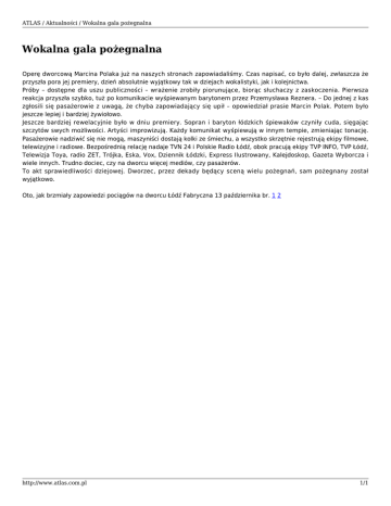 ATLAS / Aktualności / Wokalna gala pożegnalna Wokalna gala pożegnalna Operę dworcową Marcina Polaka już na naszych stronach zapowiadaliśmy. Czas napisać, co było dalej, zwłaszcza że przyszła pora jej premiery, dzień absolutnie wyjątkowy tak w dziejach wokalistyki, jak i kolejnictwa. Próby – dostępne dla uszu publiczności – wrażenie zrobiły piorunujące, biorąc słuchaczy z zaskoczenia. Pierwsza reakcja przyszła szybko, tuż po komunikacie wyśpiewanym barytonem przez Przemysława Reznera. – Do jednej z kas zgłosili się pasażerowie z uwagą, że chyba zapowiadający się upił – opowiedział prasie Marcin Polak. Potem było jeszcze lepiej i bardziej żywiołowo. Jeszcze bardziej rewelacyjnie było w dniu premiery. Sopran i baryton łódzkich śpiewaków czyniły cuda, sięgając szczytów swych możliwości. Artyści improwizują. Każdy komunikat wyśpiewują w innym tempie, zmieniając tonację. Pasażerowie nadziwić się nie mogą, maszyniści dostają kolki ze śmiechu, a wszystko skrzętnie rejestrują ekipy filmowe, telewizyjne i radiowe. Bezpośrednią relację nadaje TVN 24 i Polskie Radio Łódź, obok pracują ekipy TVP INFO, TVP Łódź, Telewizja Toya, radio ZET, Trójka, Eska, Vox, Dziennik Łódzki, Express Ilustrowany, Kalejdoskop, Gazeta Wyborcza i wiele innych. Trudno dociec, czy na dworcu więcej mediów, czy pasażerów. To akt sprawiedliwości dziejowej. Dworzec, przez dekady będący sceną wielu pożegnań, sam pożegnany został wyjątkowo. Oto, jak brzmiały zapowiedzi pociągów na dworcu Łódź Fabryczna 13 października br. 1 2 http://www.atlas.com.pl 1/1